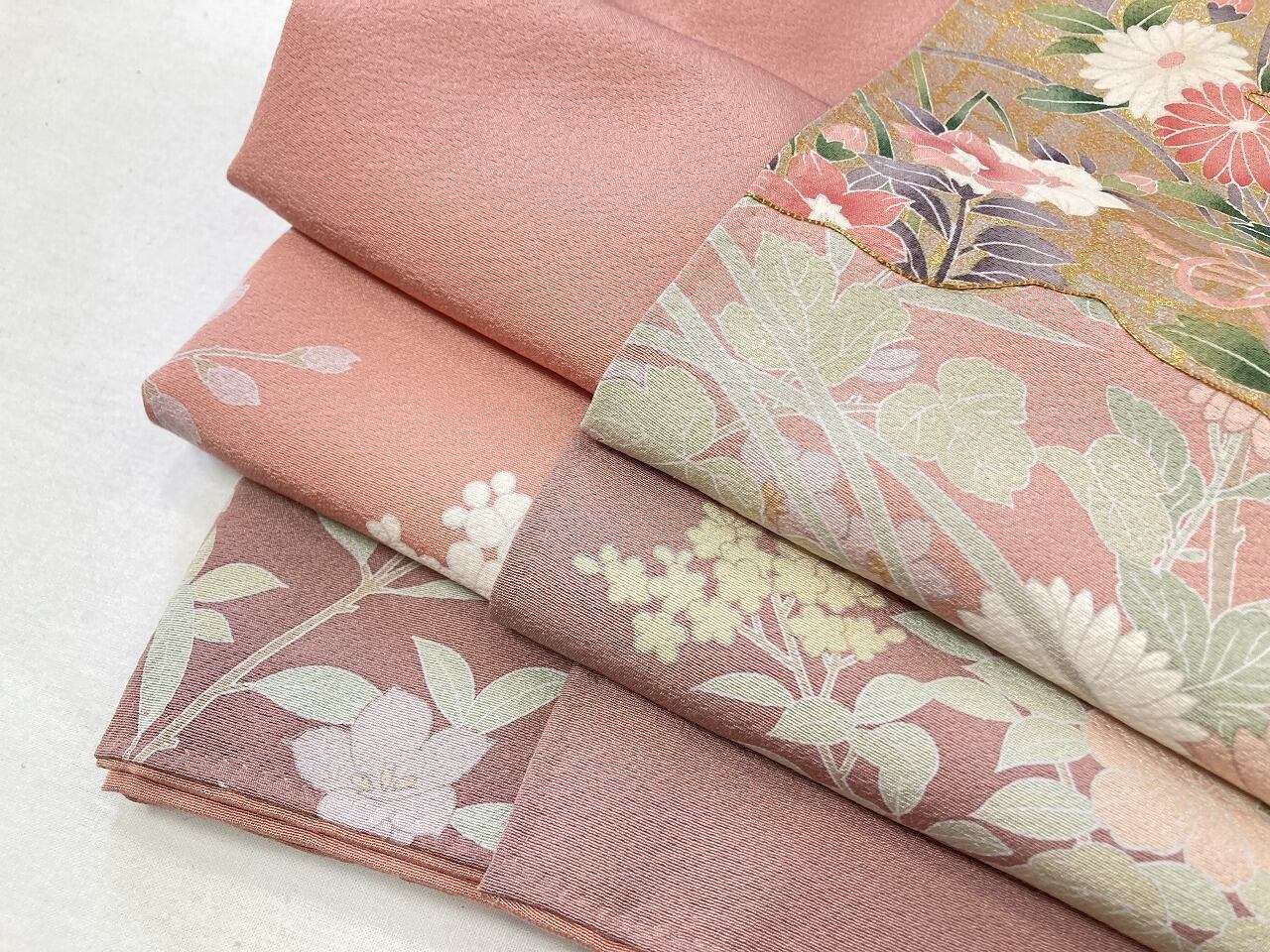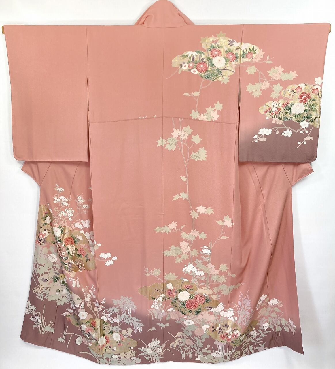 京友禅 金駒刺繍 本金箔 花柄 訪問着 袷 正絹 サーモンピンク 乾鮭色 1308