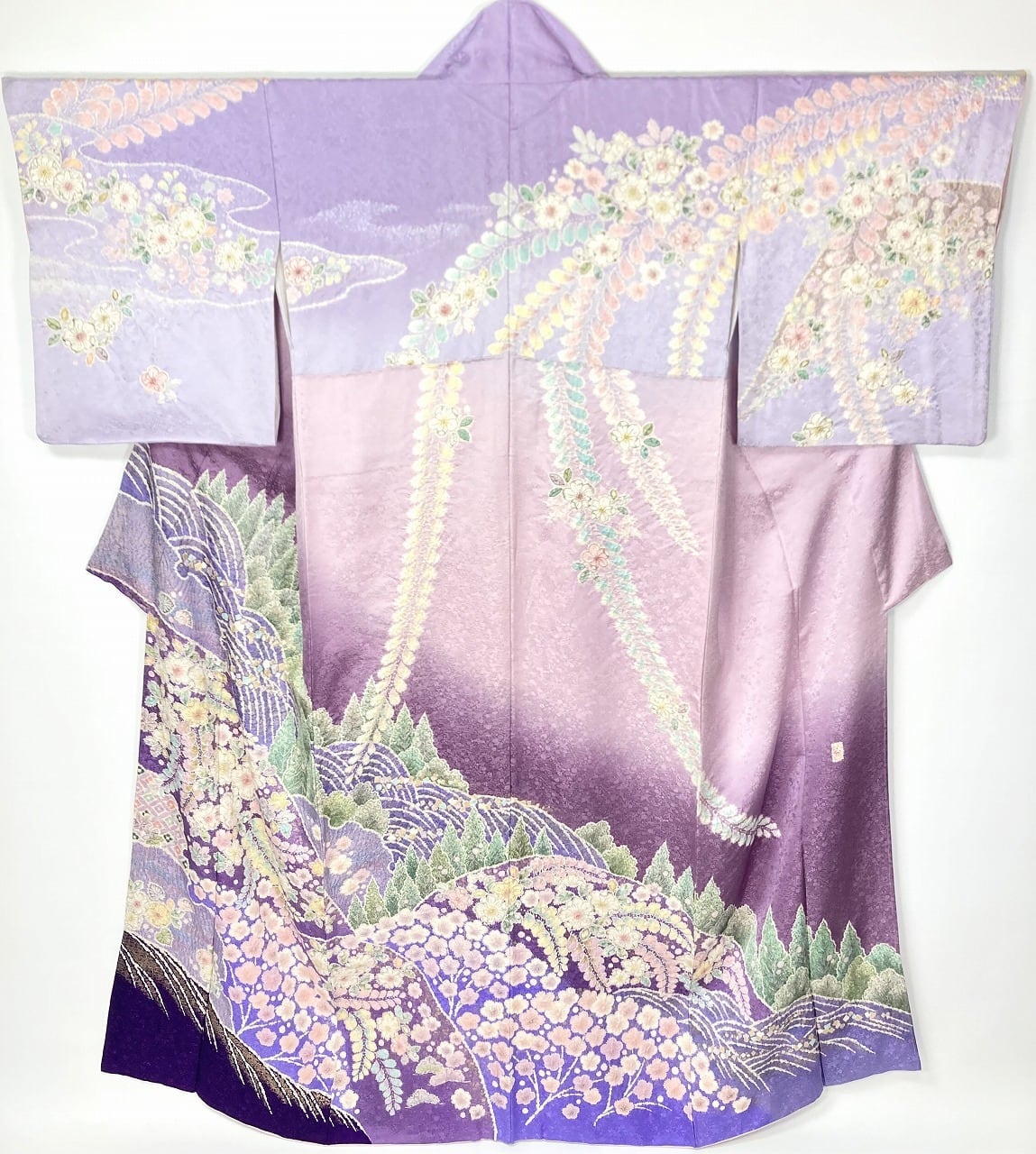 やわらかな「ぼかし染め」で淡い藤色・青紫・赤紫から深い紫色への華麗な「染め分け」によりメリハリが生まれ、多彩な「友禅」「絞り染め」「ぼかし染め」「墨絵書き」「金彩」、「縫い絞り」「筋絞り」などのふんだんな「手絞り」を駆使し、鮮やかに彩られた[辻ヶ花]が咲き乱れ華麗に枝垂れた、手間隙かけて制作された息を吞むほど美しい大変素晴らしい作品です。