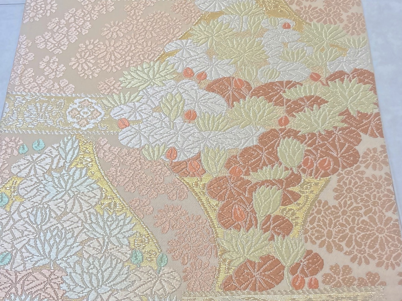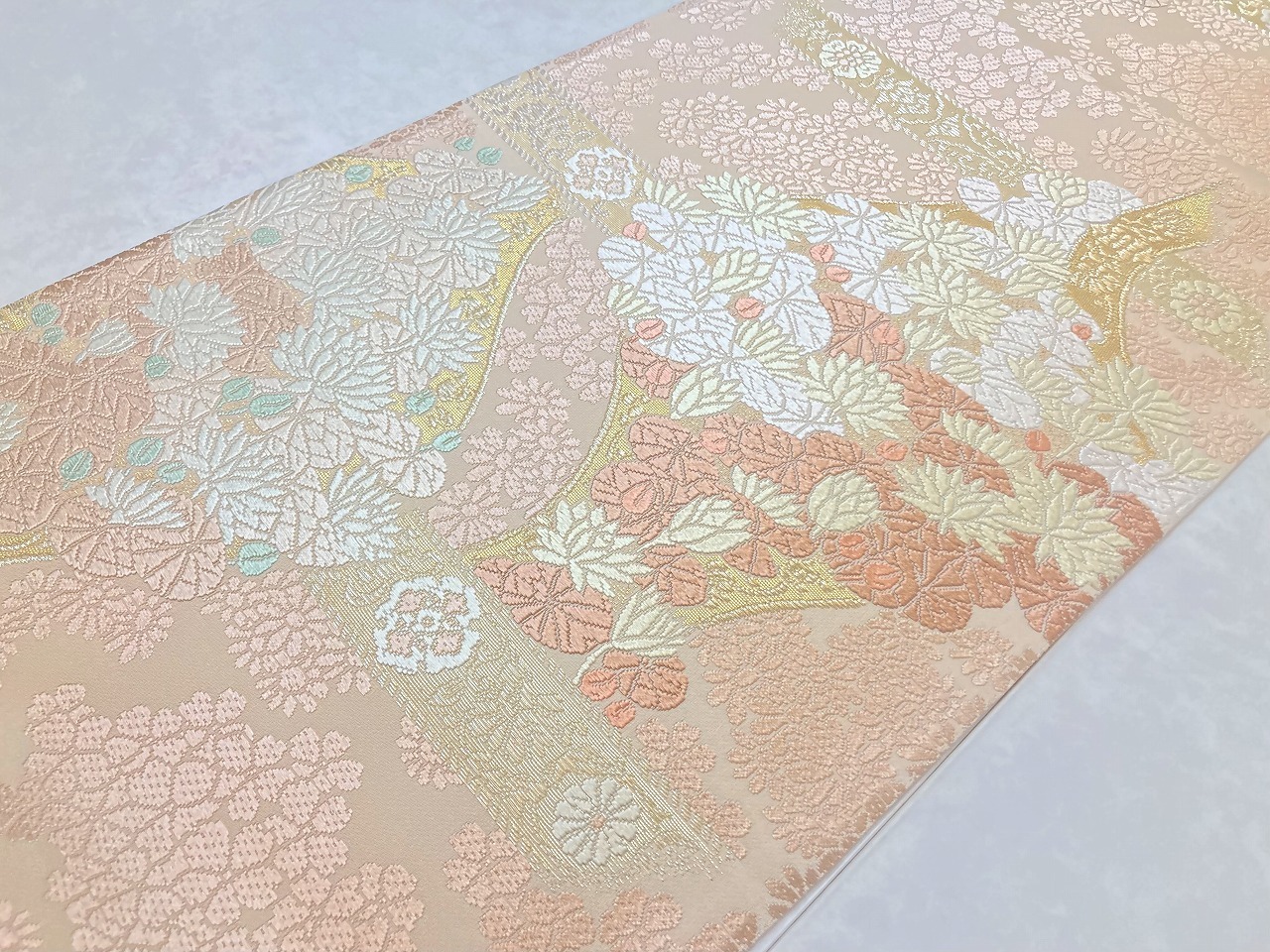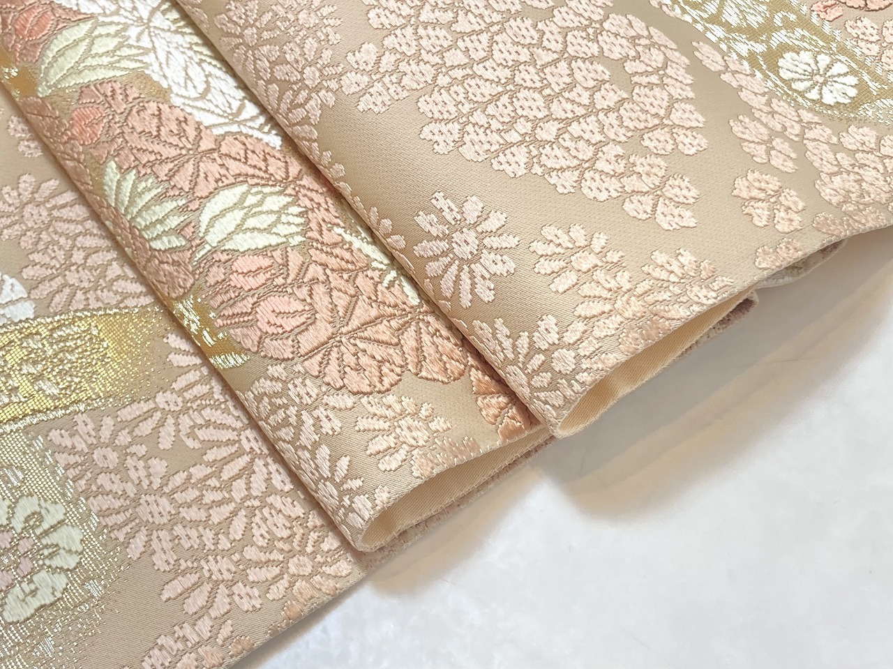 ◇淡いピンクベージュの色合いが美しく、上品さと華やかさを兼ね備えた、とても麗しい色柄の高級袋帯です。