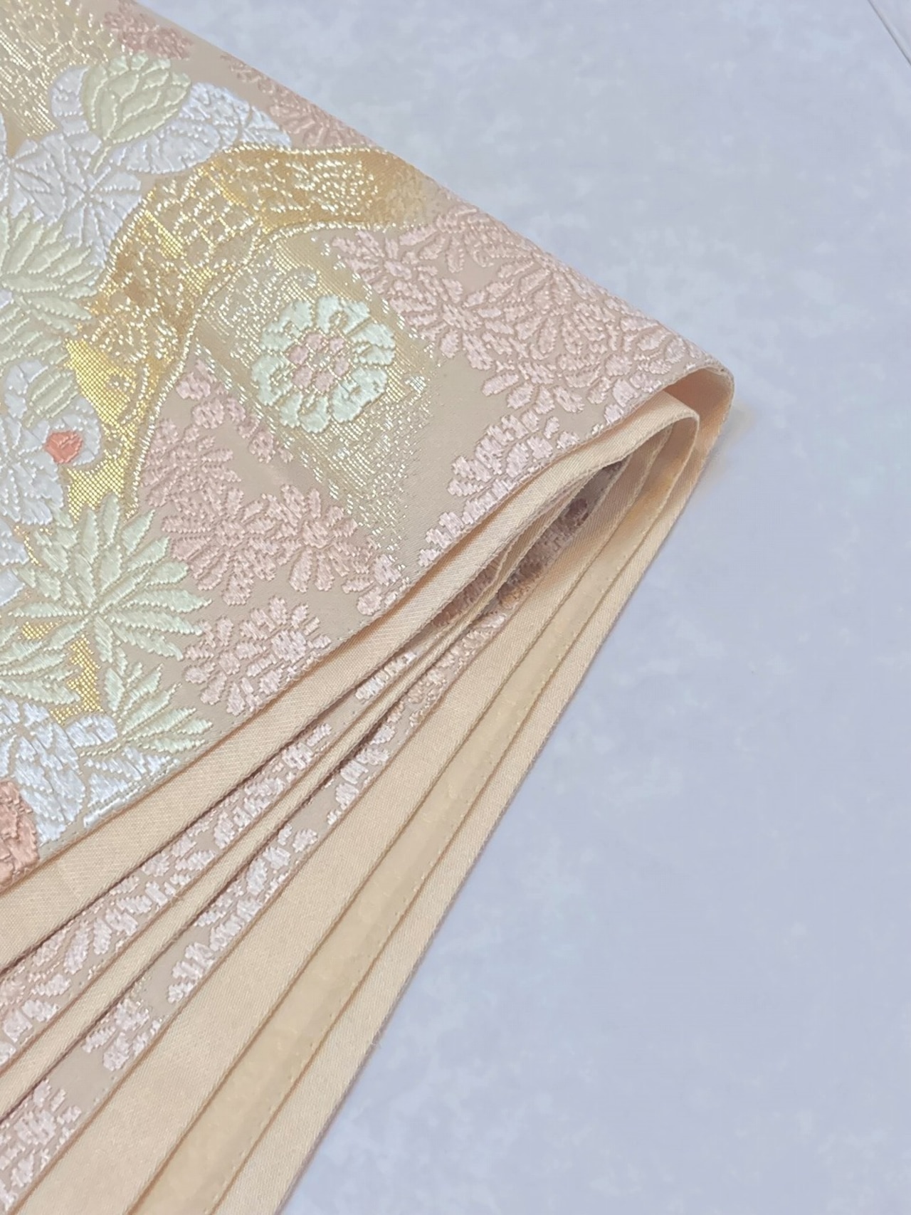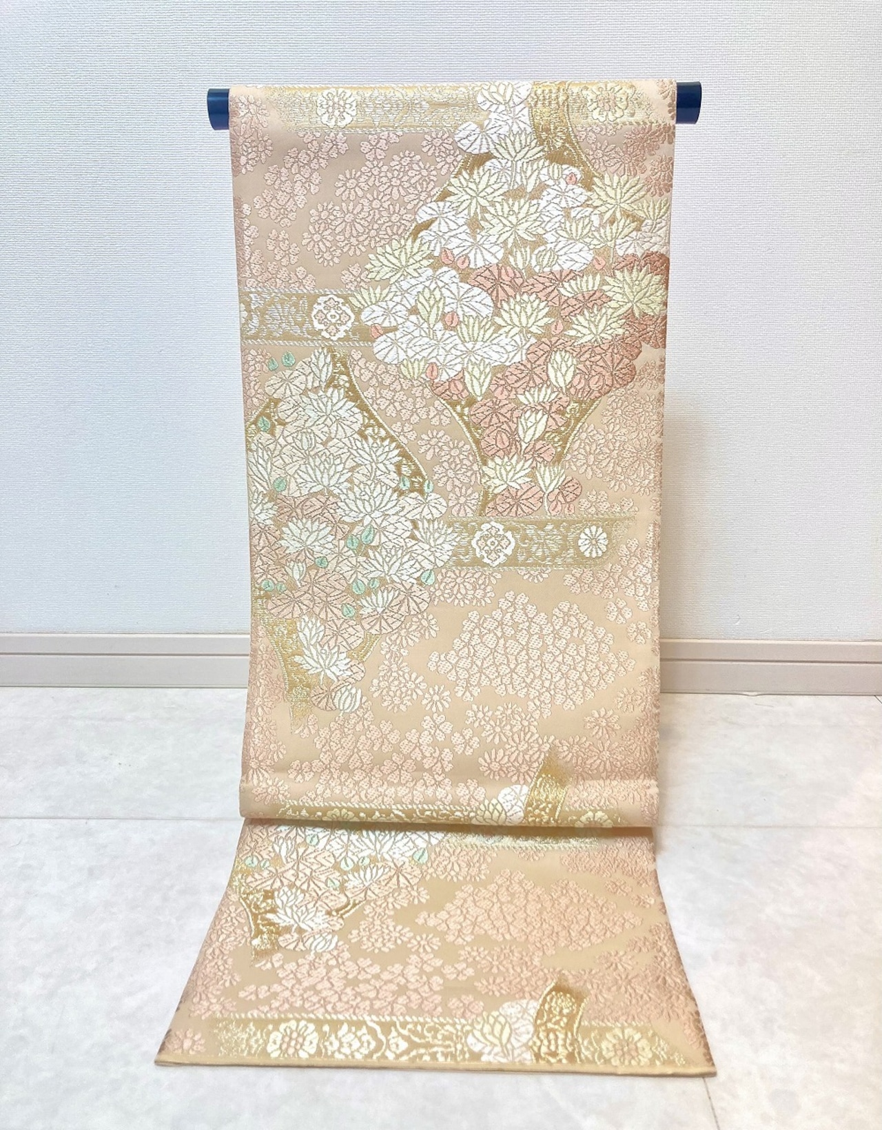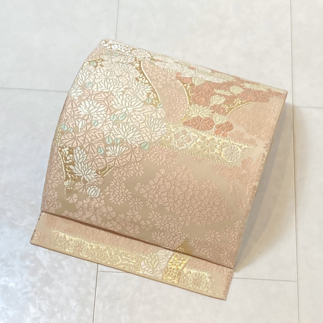◇淡いピンクベージュの色合いが美しく、上品さと華やかさを兼ね備えた、とても麗しい色柄の高級袋帯です。