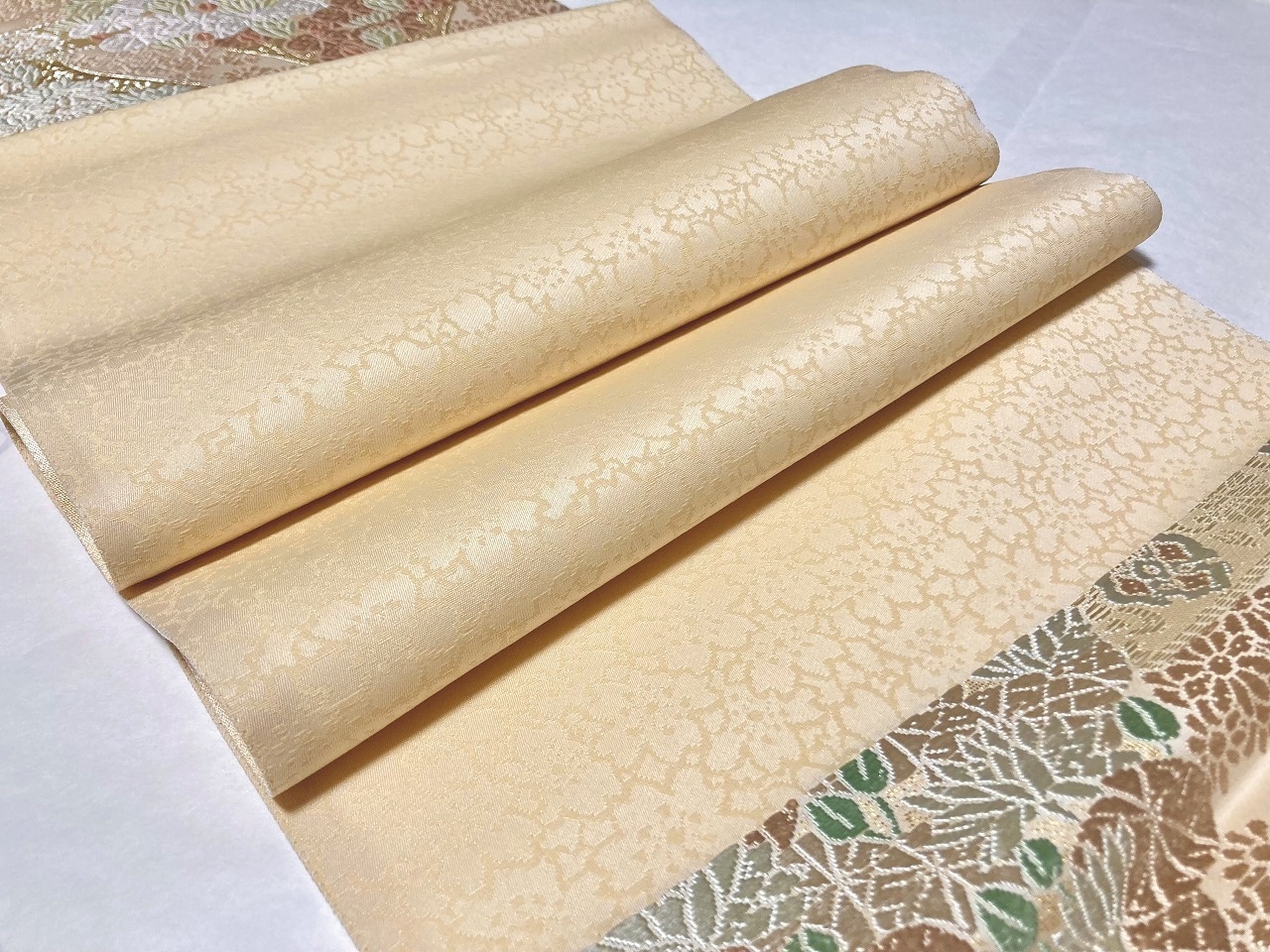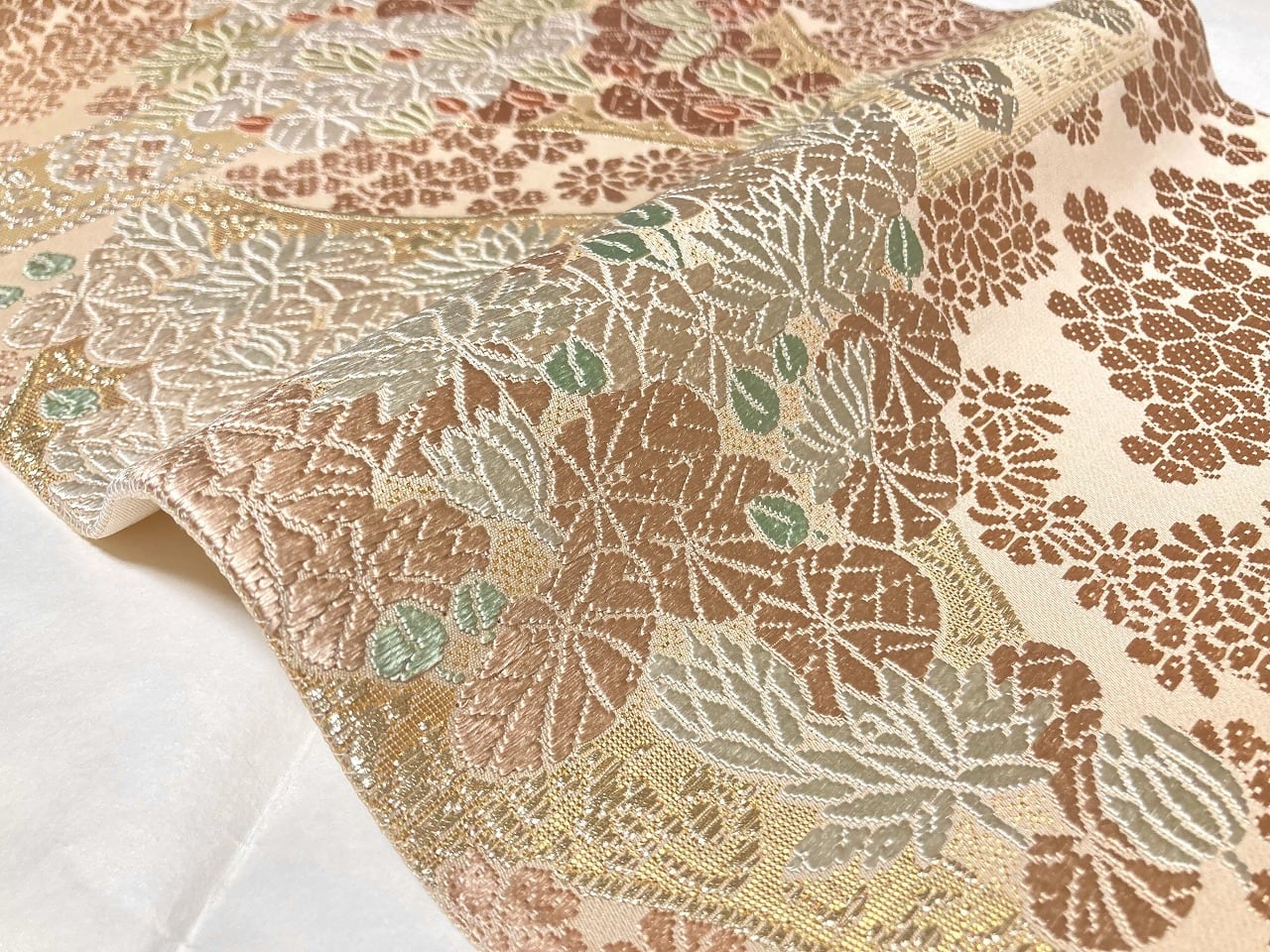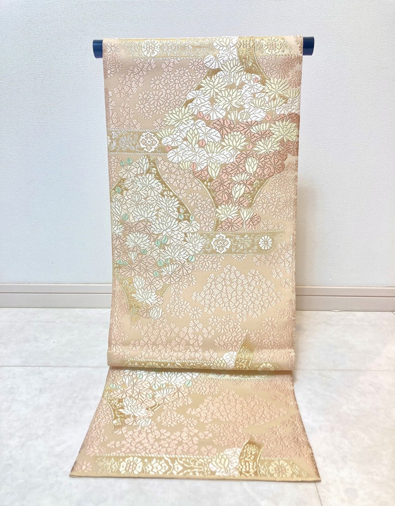 ■淡いベージュ地気品高く輝く「金糸」清楚な白や落ち着いたピンクなどの絹糸を使い、牡丹・菊・桜などの[四季の花々]が華麗に咲き乱れ、刺繍の様な立体的な「唐織」で精巧に織り上げた、とても優美な作品です。