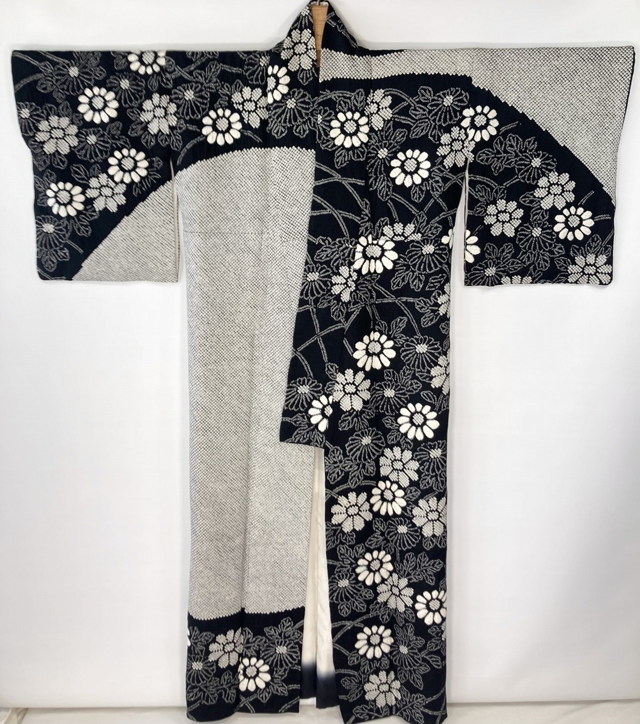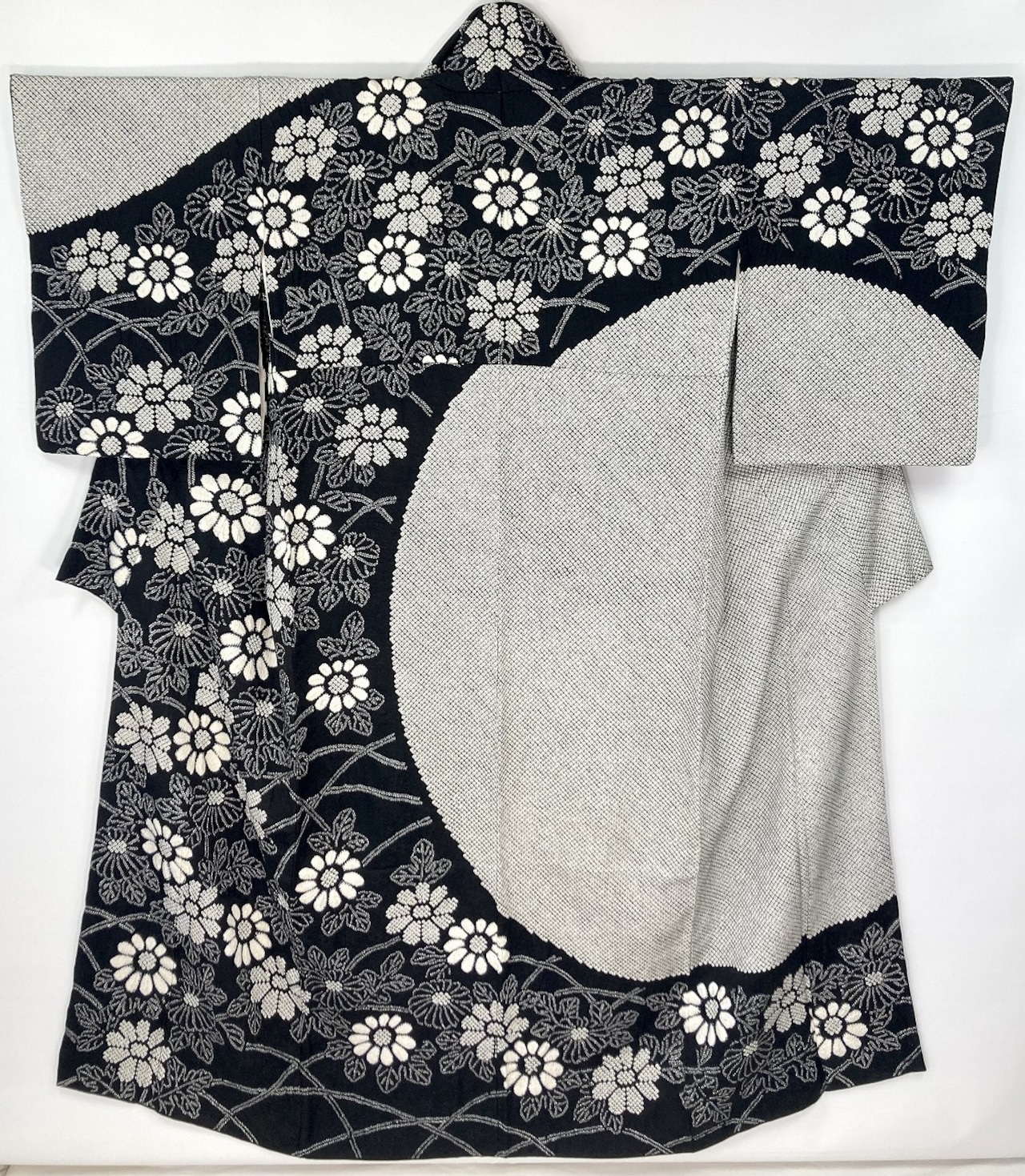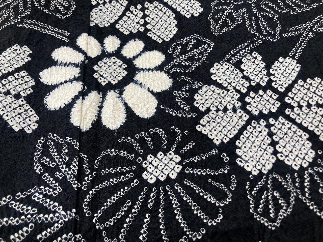 ■ふっくらとした美しい凹凸の「京鹿の子絞り」を全体に施し、「片身替わり」のような大胆な「染め分け」を配し、きめ細かな「人目絞り」と「鹿の子絞り」大きめな白の「小帽子絞り」を駆使し花々を散りばめた、丹精込めて一粒一粒気の遠くなるような手仕事による大変素晴らしい見事な作品です。
