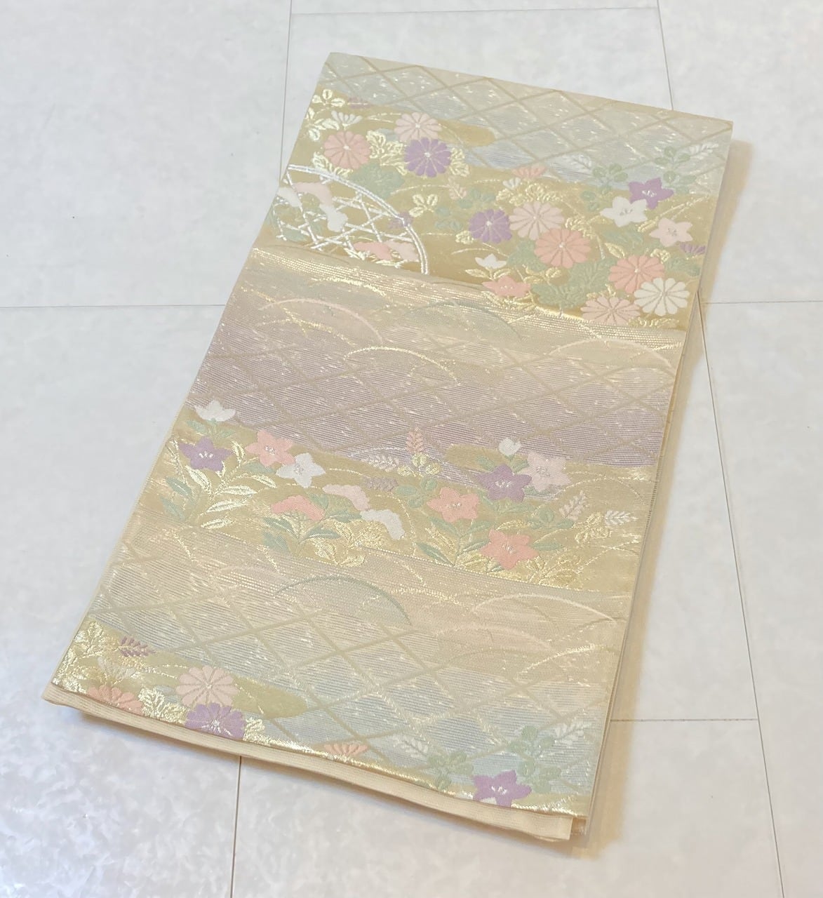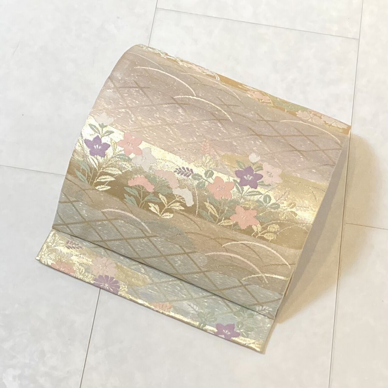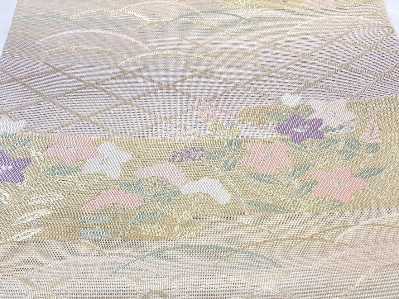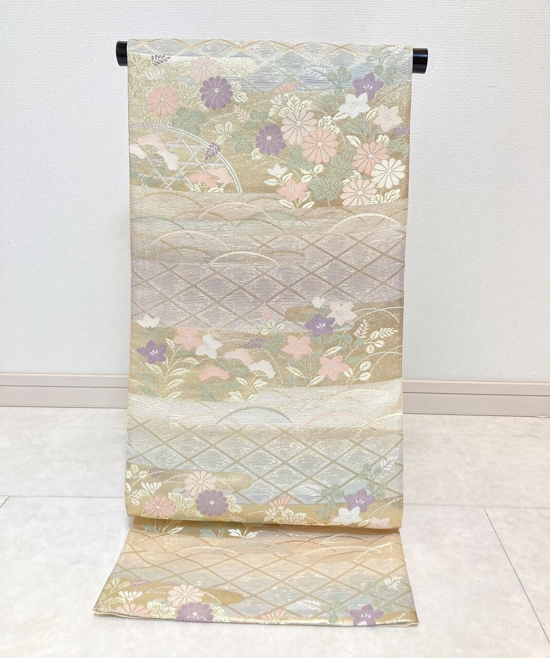 ■ベージュ地に涼しげな水色と淡い紫の美しいグラデーションを施し、気品高いシャンパンゴールドのように煌めく「金糸」をふんだんに使い、格調高い[菱文][芝草文]に菊や[秋の七草]に数えられる桔梗・女郎花・萩をあしらった雅やかな古典柄の「霞取り」を配し、緻密に織り上げた大変加工の良いお品です。