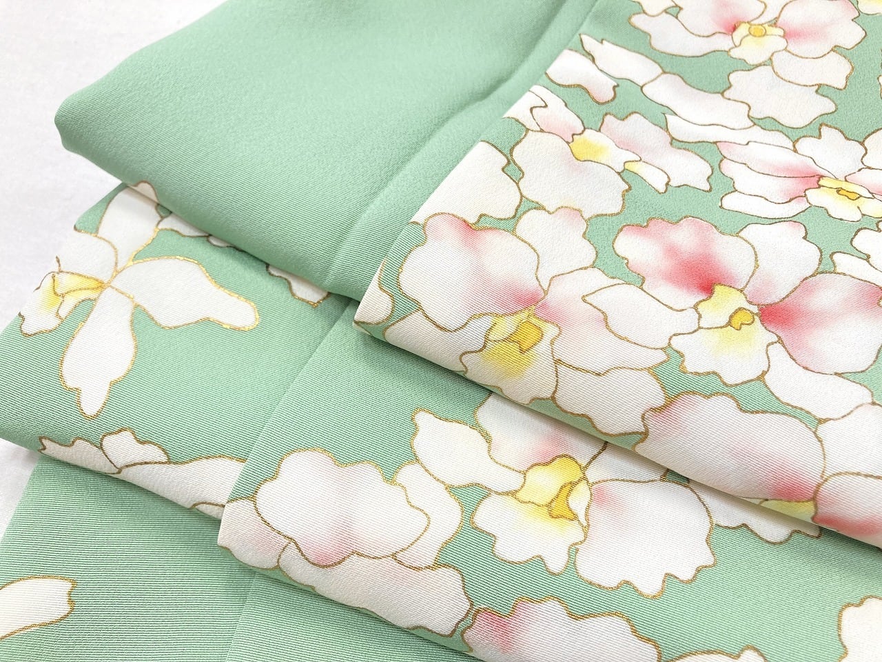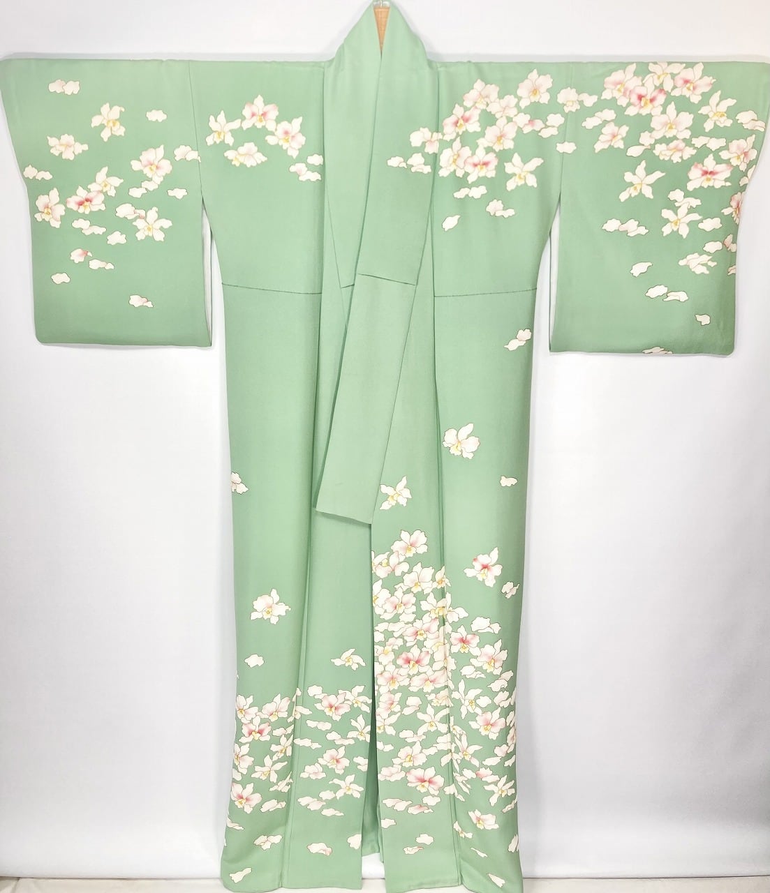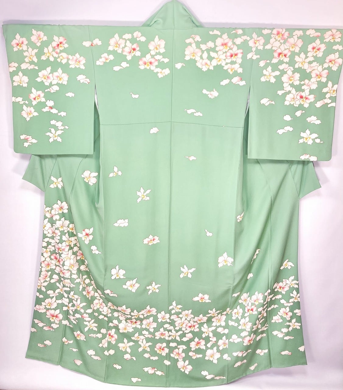 繊細な「型染め友禅」に「金彩」の縁取りが華やぎを添え、ほんのりとピンクや黄色に彩られた、洋蘭の女王と称される白の「カトレア」が華麗に咲き乱れ、花びらが優雅に舞い散る美しい「絵羽柄」の、出回ることの少ない大変希少な作品です。