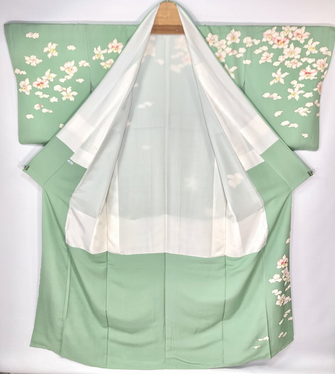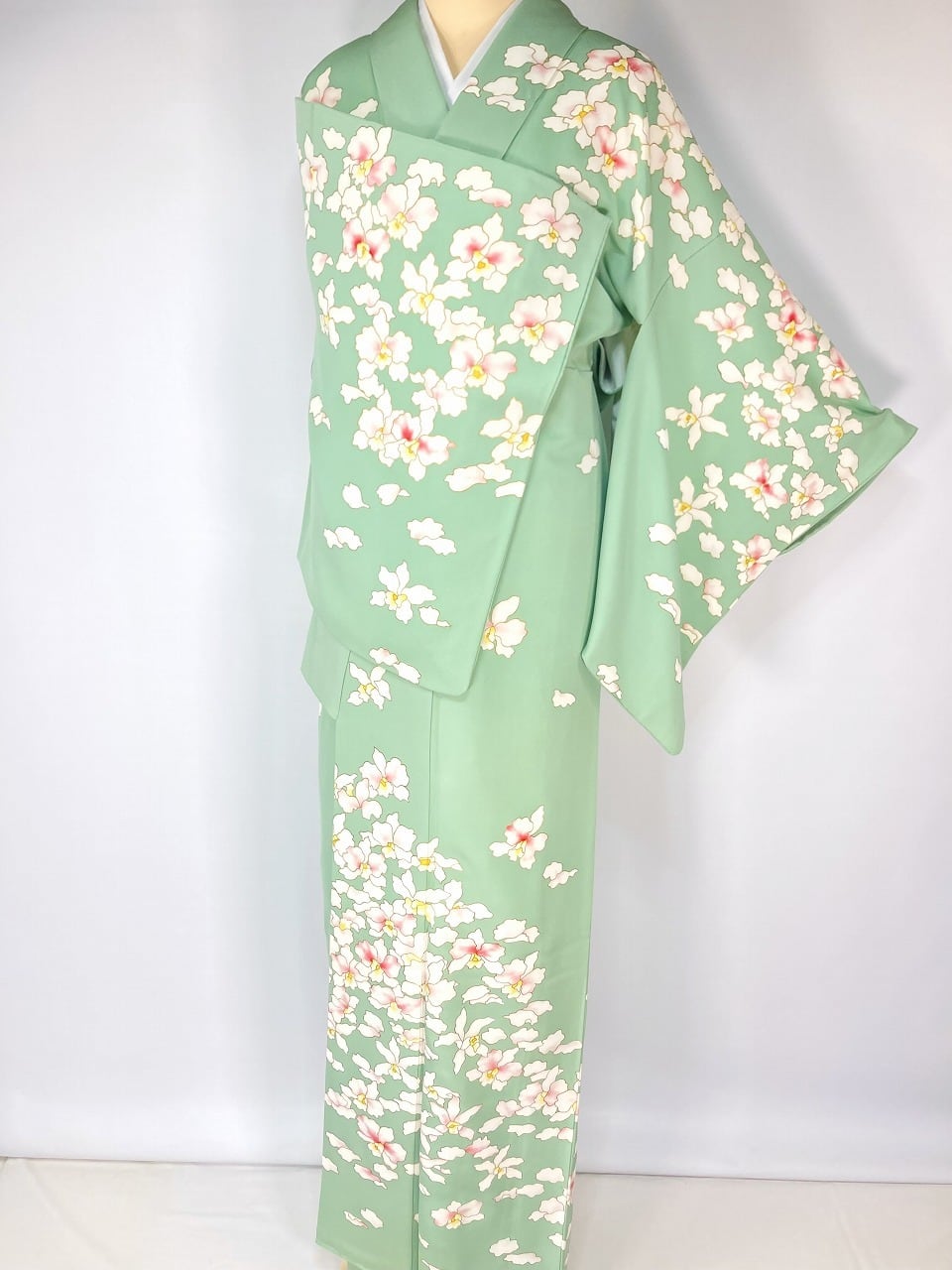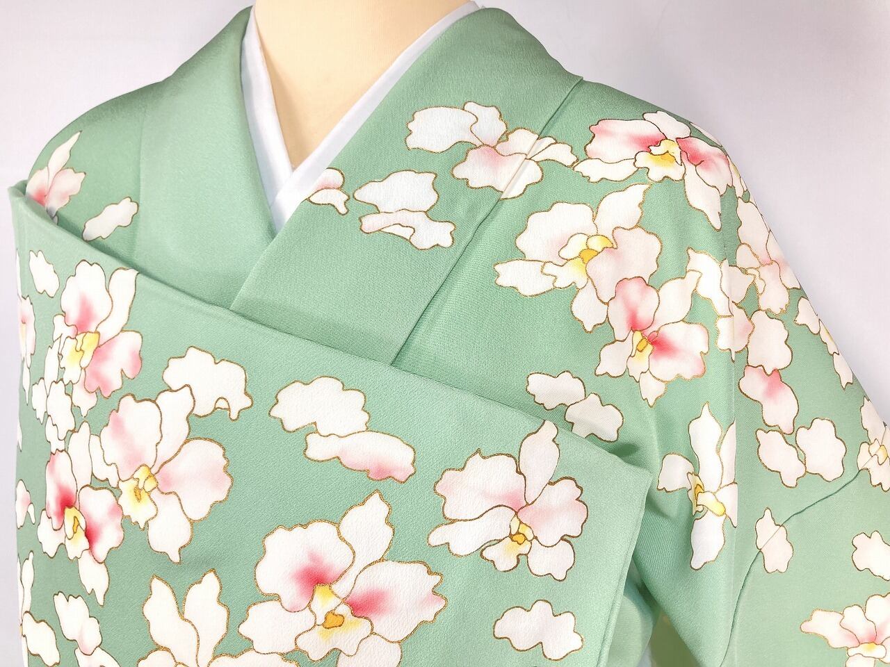 ◇女性らしさを引き立たせる淡く優しいパステルカラーの地色に、清楚な白で大輪豪華な花びらのカトレアが目を惹く、とても麗しい「京友禅」の訪問着です。