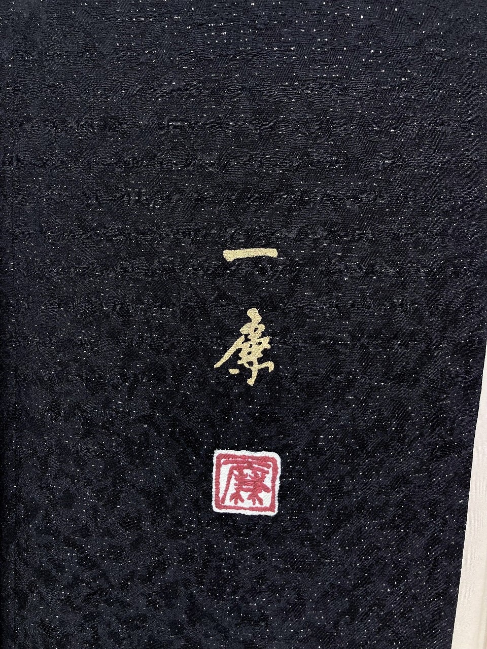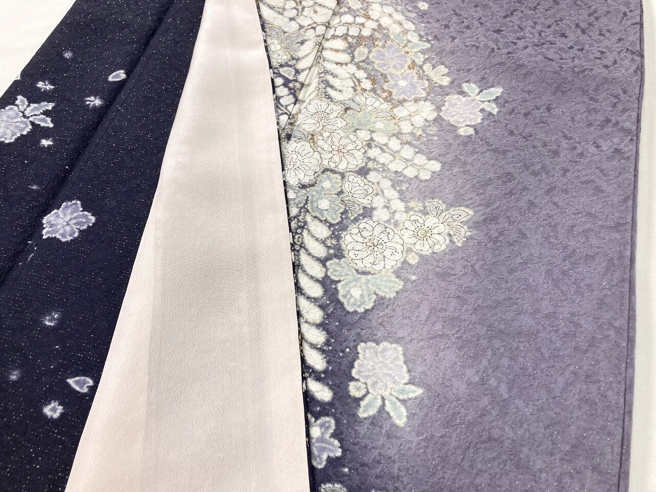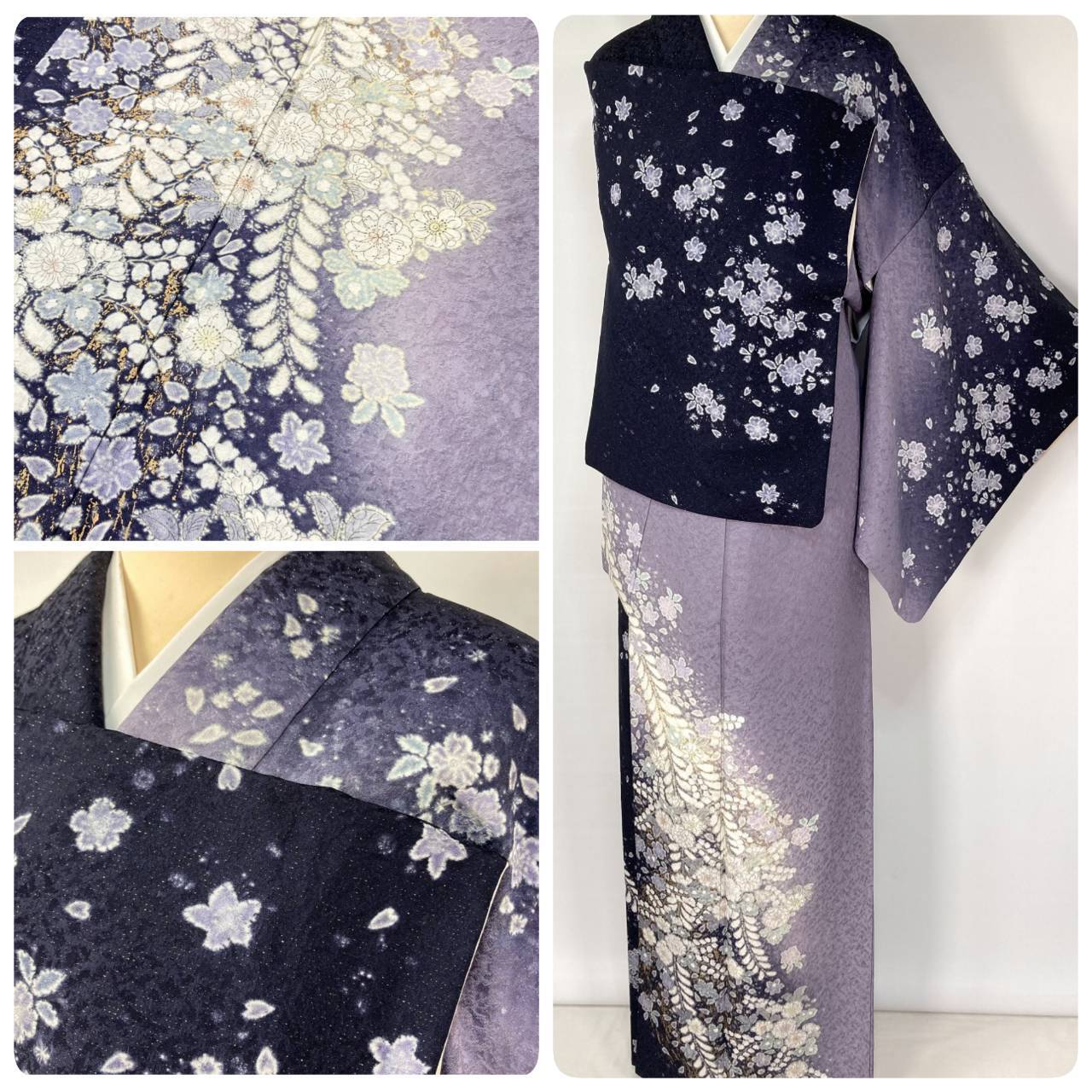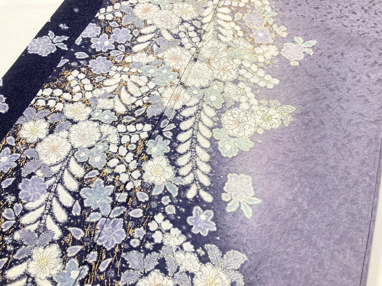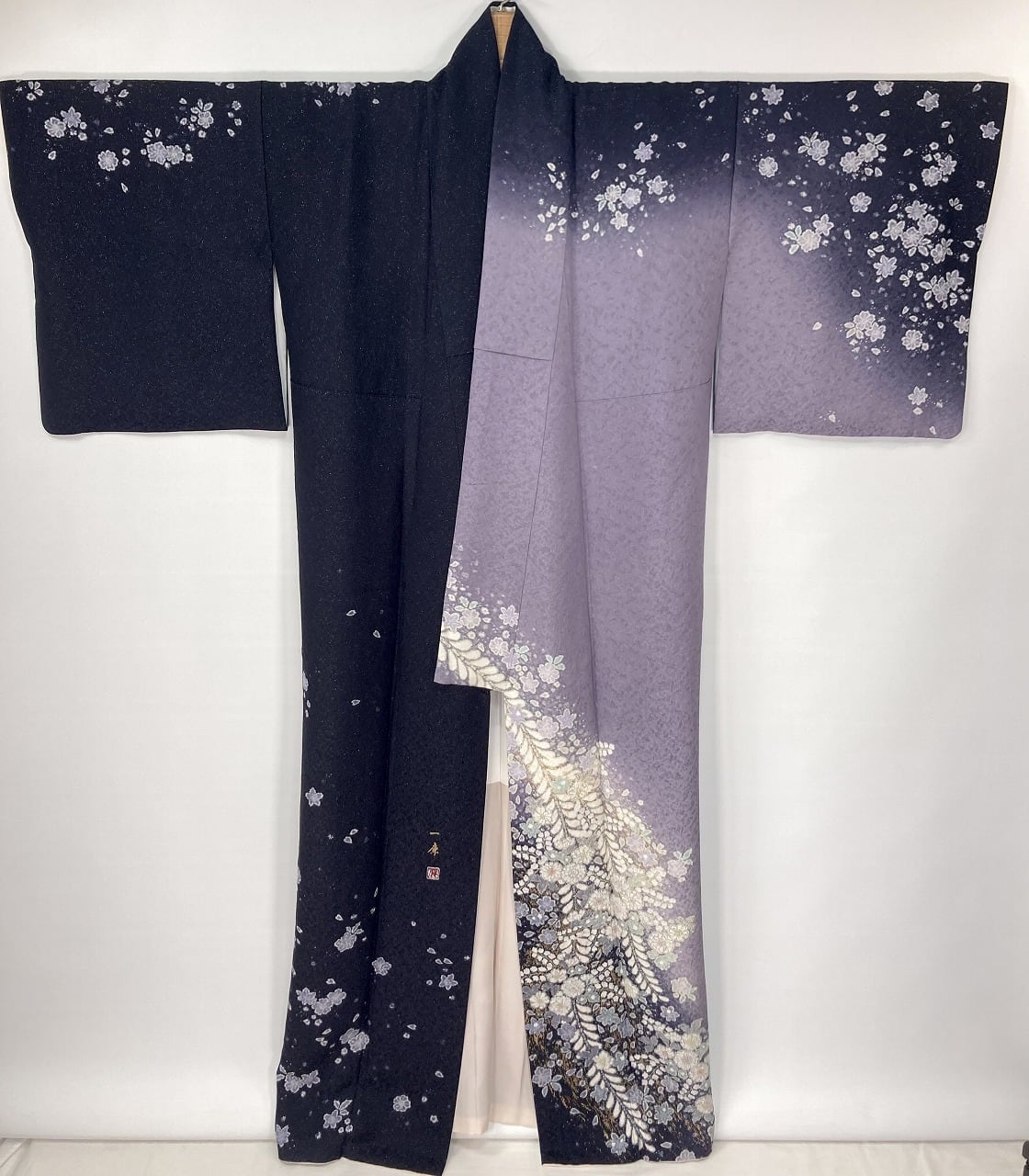 やわらかな「ぼかし染め」により黒に近い深い紫から淡い藤色への[片身替わり]のような大胆な「染め分け」を施し、多彩な「友禅」「絞り染め」「ぼかし染め」「墨絵書き」「手絞り」を駆使し、幻想的な[辻ヶ花]が流れるように華麗に枝垂れ、気品高く輝く「本金箔」を散りばめた、手間隙かけて制作された息を吞むほど美しい圧巻の作品です。