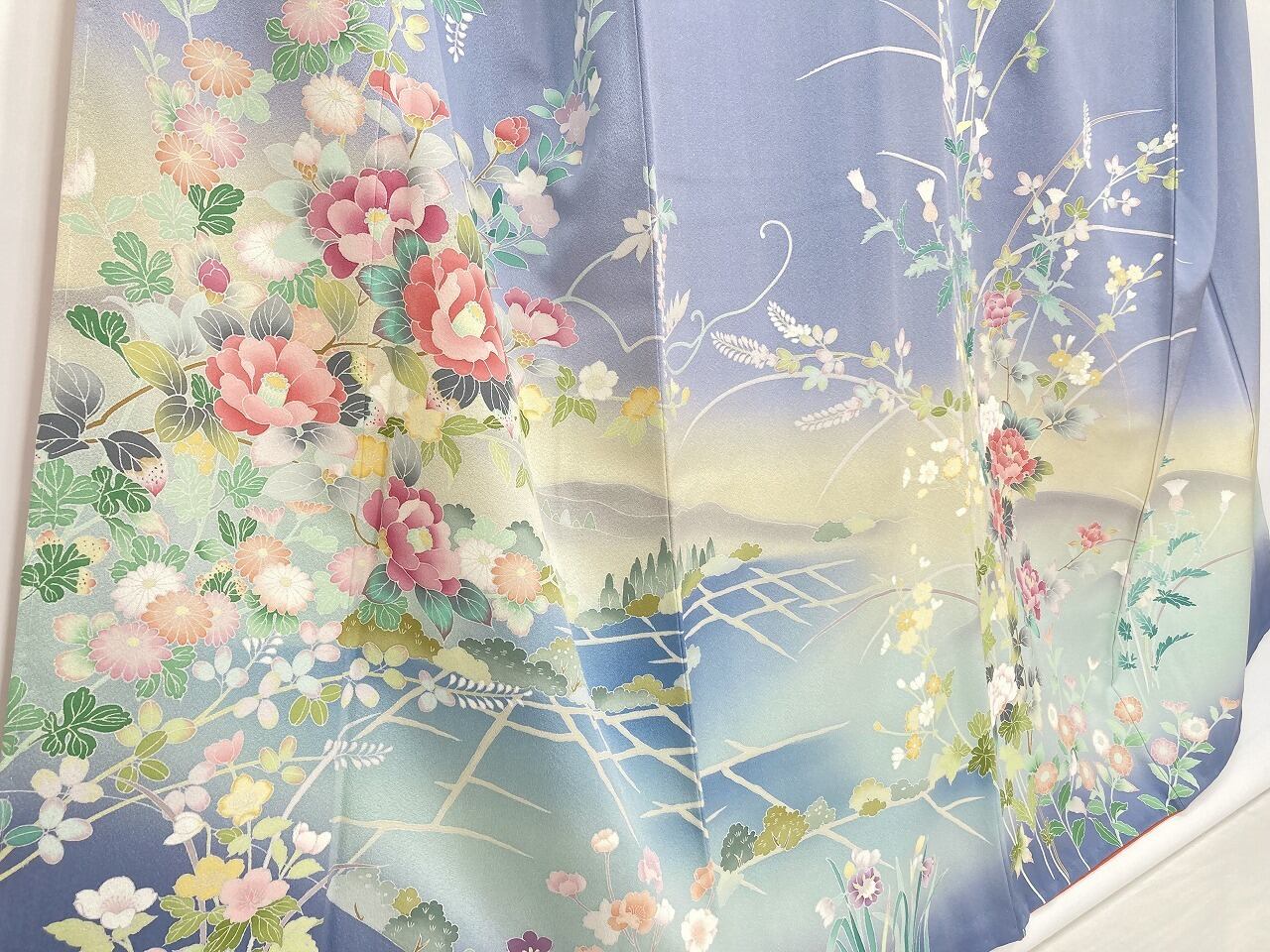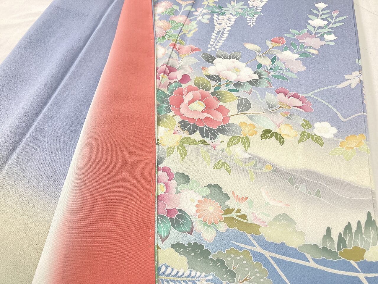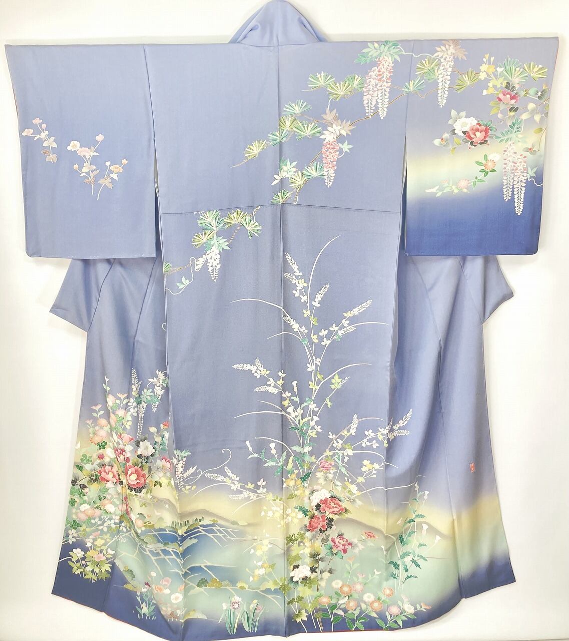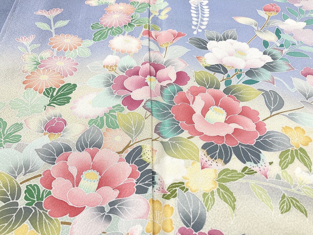 やわらかな「ぼかし染め」で淡いクリーム色・空色・優しいティファニーブルーからワントーン暗いブルーへの美しいグラデーションによりメリハリが生まれ、鮮やかに彩られた牡丹・椿・菊・藤・萩などの[四季の花々]が華麗に咲き乱れ、葉の虫食いまで忠実に再現した緻密な「手描き友禅」で丹念に描き上げた、見事な絵羽柄の大変素晴らしい作品です。