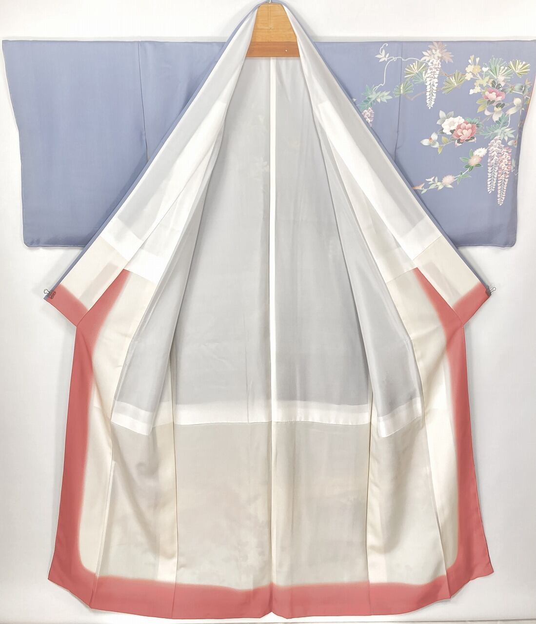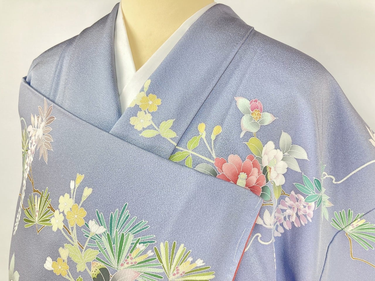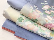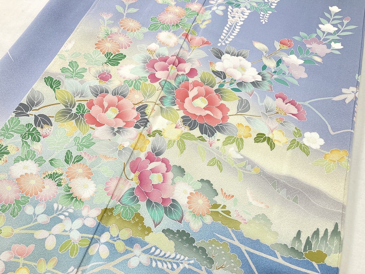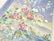 やわらかな「ぼかし染め」で淡いクリーム色・空色・優しいティファニーブルーからワントーン暗いブルーへの美しいグラデーションによりメリハリが生まれ、鮮やかに彩られた牡丹・椿・菊・藤・萩などの[四季の花々]が華麗に咲き乱れ、葉の虫食いまで忠実に再現した緻密な「手描き友禅」で丹念に描き上げた、見事な絵羽柄の大変素晴らしい作品です。