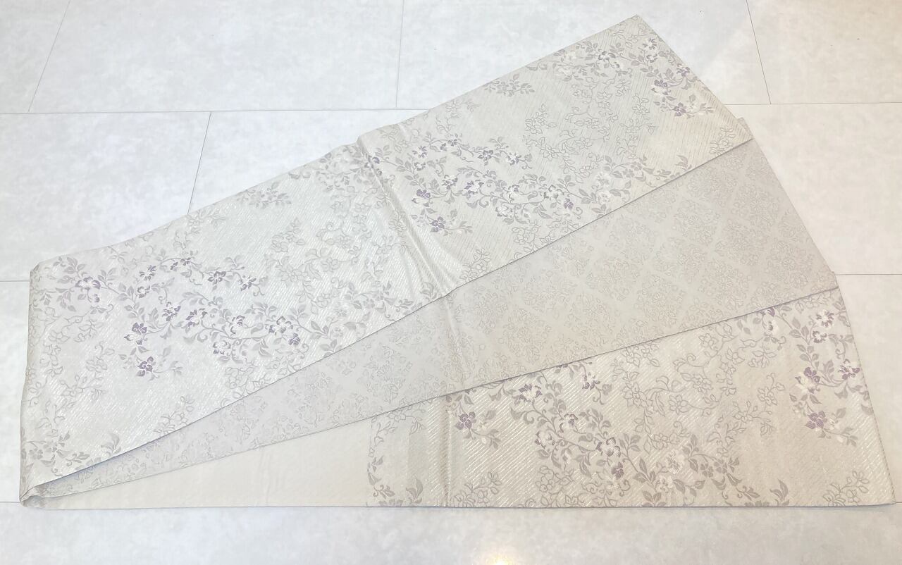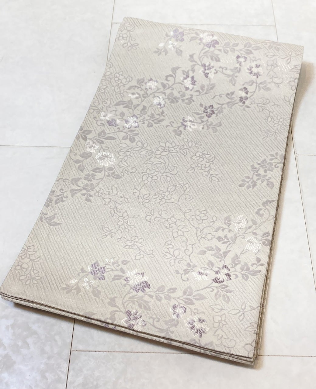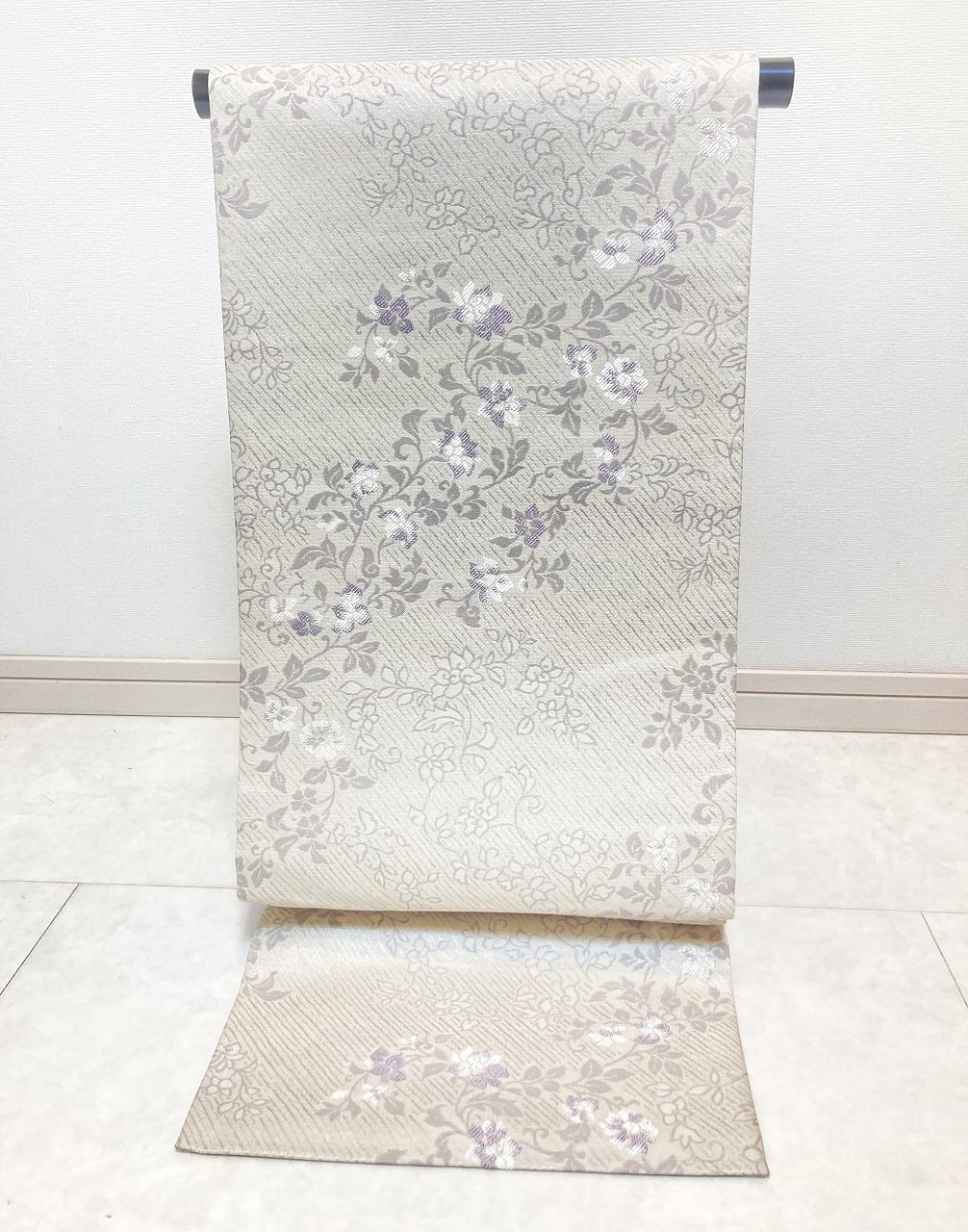 ■上品に輝く「銀糸」をスタイリッシュな斜めに配し、優雅な[唐草]を緻密な「紹巴織」で表現し、立体的な織りで白と紫の彩りが華やぎを添えた、うっとりするほど美しい作品です。