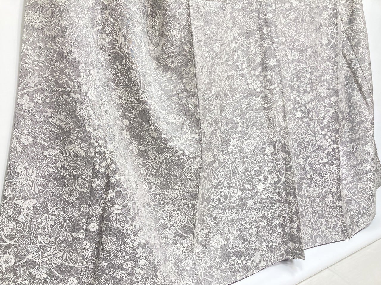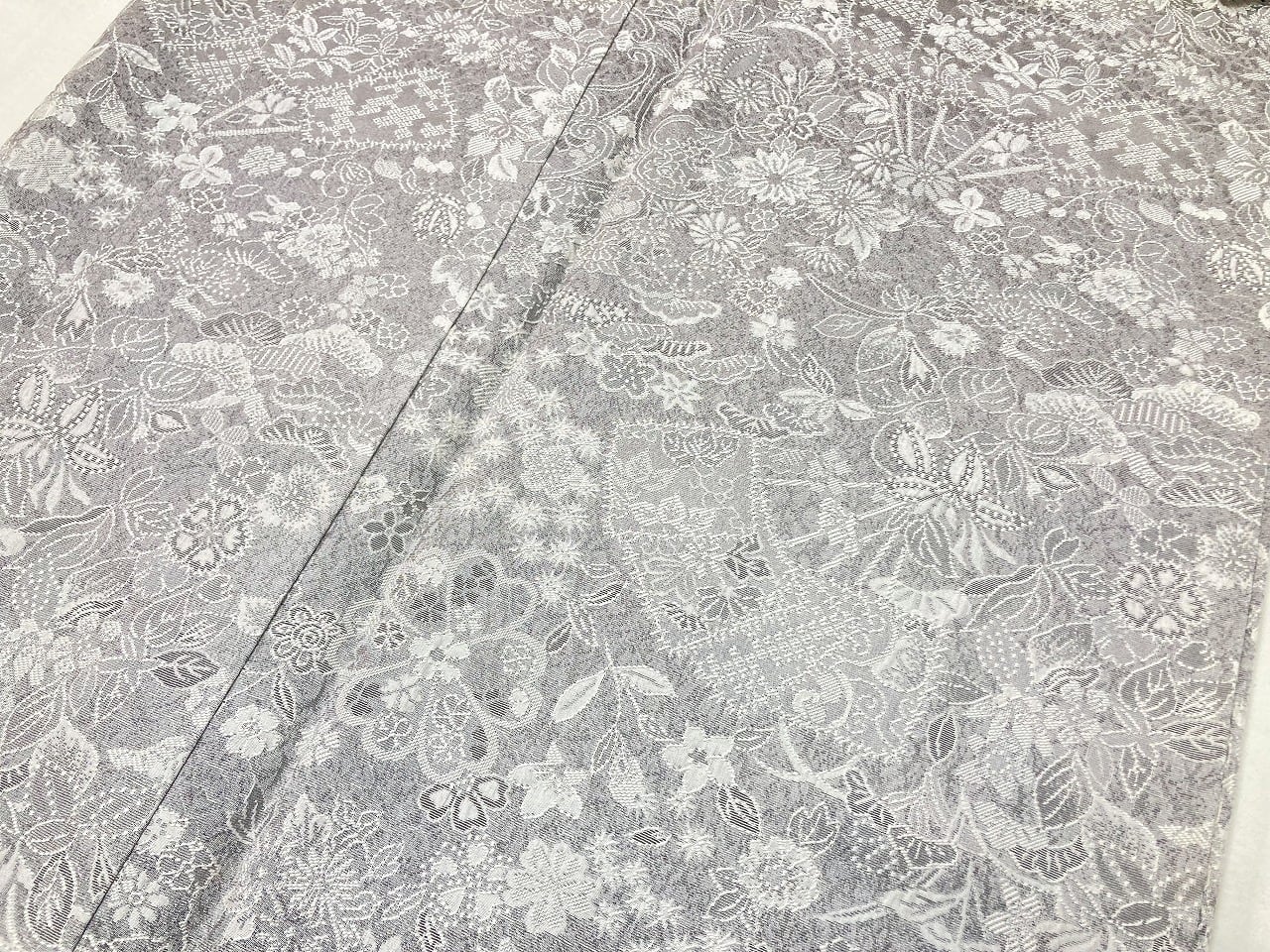 ■きめ細かいレースのようにふっくらと繊細に織り出し、角度や光りにより黒のコントラストで立体感や奥行きが生まれ、[四季の花々]が美しく咲き乱れ上品な[扇]を間隔良く配し、細密に丹念に織り出された大変美しい見事な作品です。