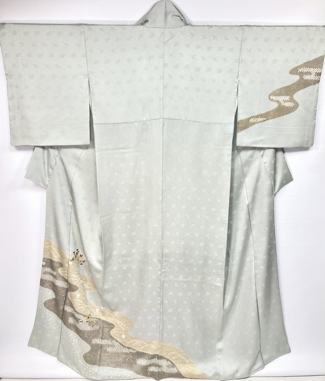 気品高く煌めく「金彩」で波文や観世水を緻密にあしらった、格調高い[霞取り]を配し、「一目絞り」「小帽子絞り」「鹿の子絞り」で遠山やヱ霞を描き、左前身頃と左前袖には縁起の良い吉祥文の[松竹梅]と[丸紋]を丹念な「手刺繍」と「金駒刺繍」で施した、意匠を凝らした素晴らしい作品です。