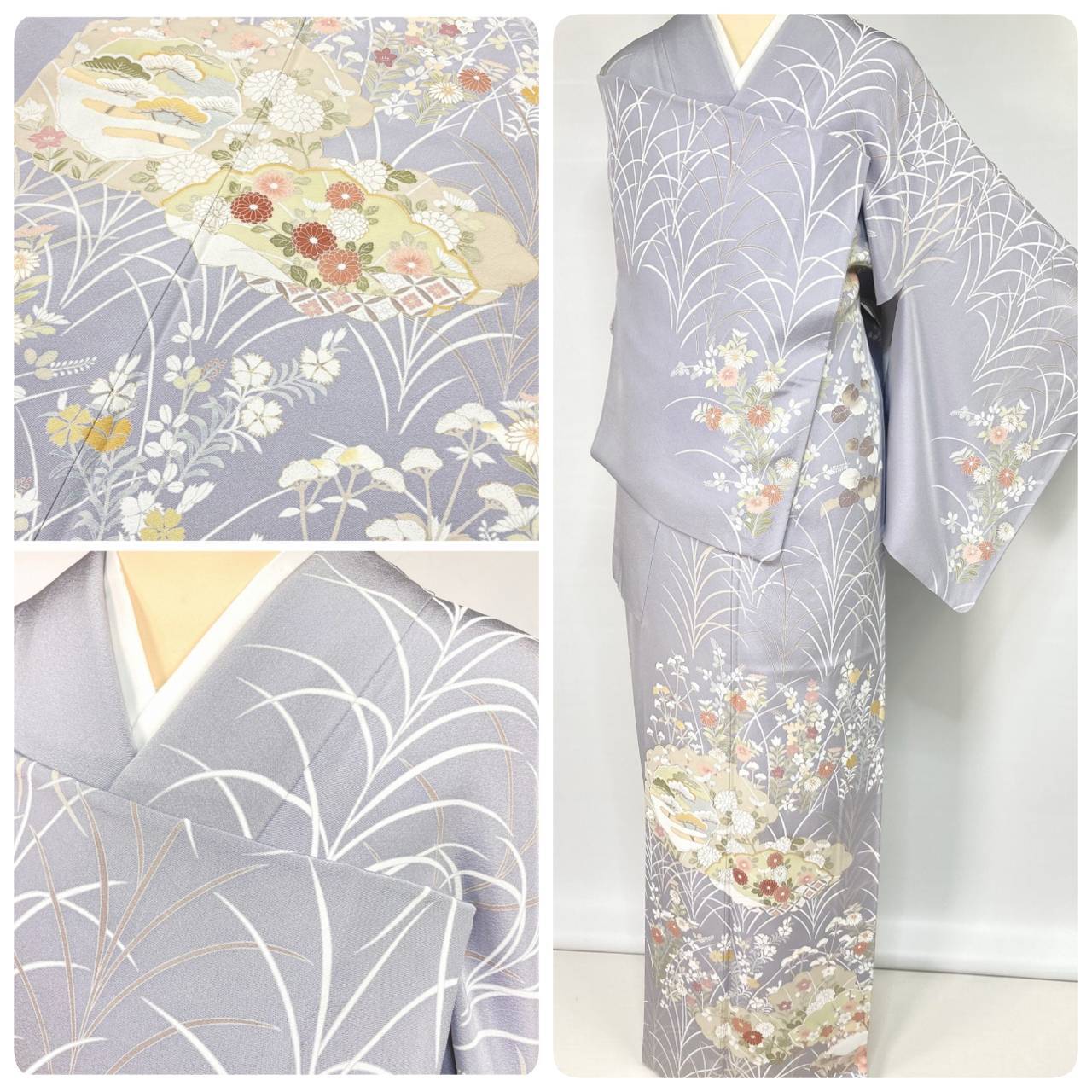 菊・撫子・桔梗・萩などの草花が華麗に咲き乱れ、上品な[雲取り]には牡丹・菊・梅・杜若などの[四季の花々]を散りばめ、気品高く煌めく「金彩」の縁取りが華やぎを添えた、一筆一筆 緻密な「手描き友禅」で丹念に描き上げた、見事な「絵羽柄」の大変加工の良い作品です。