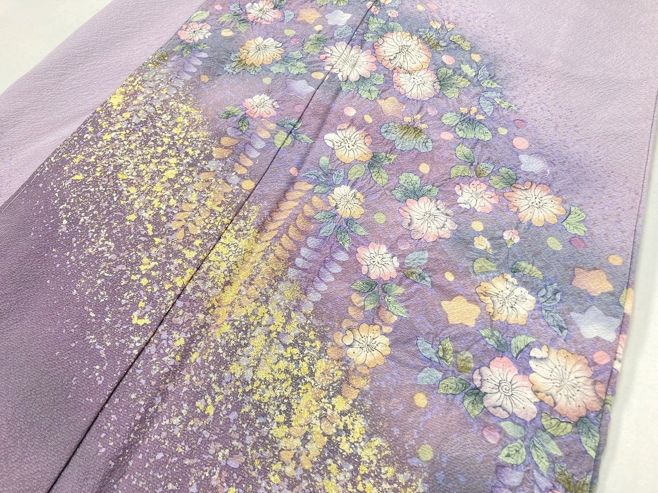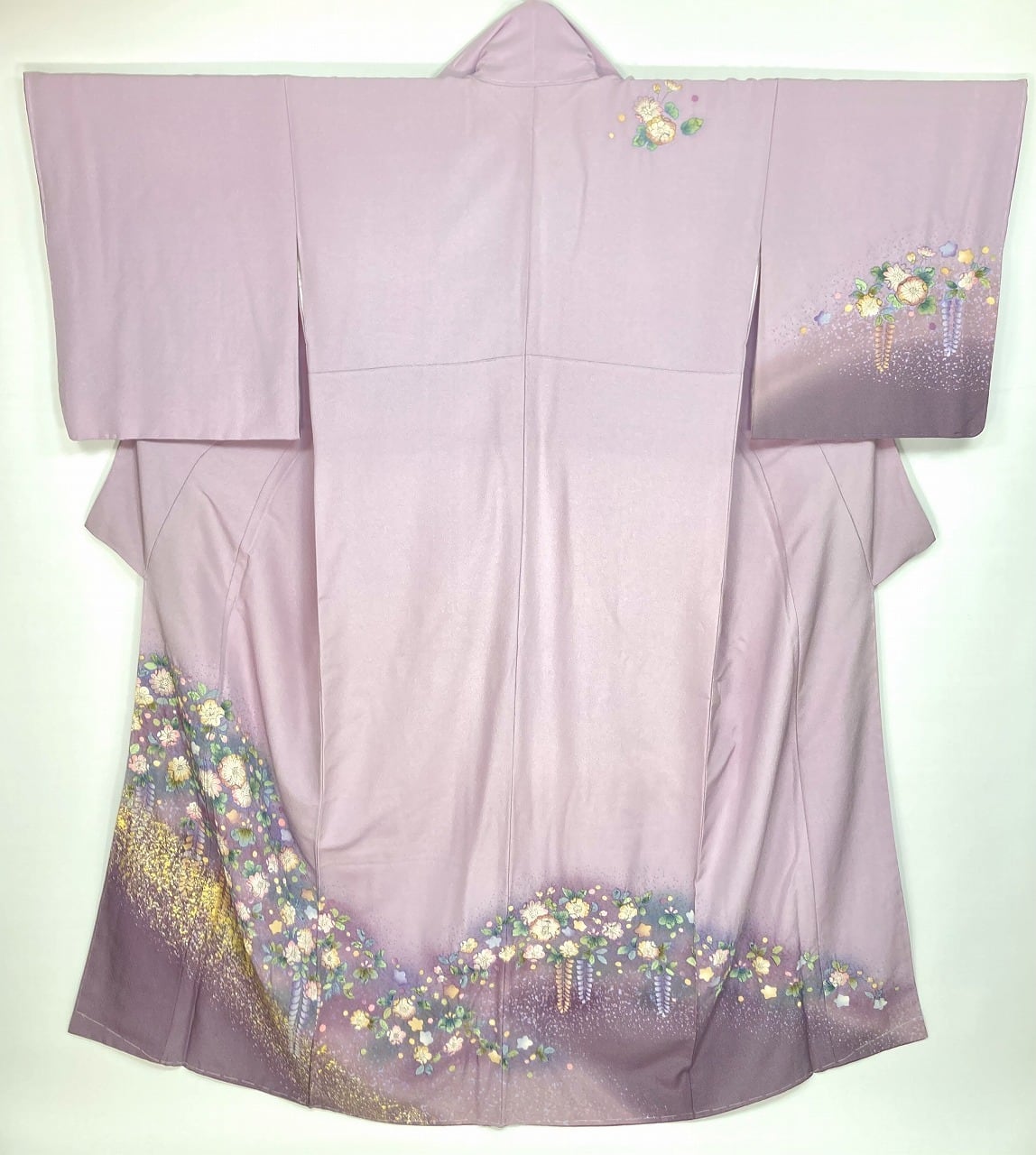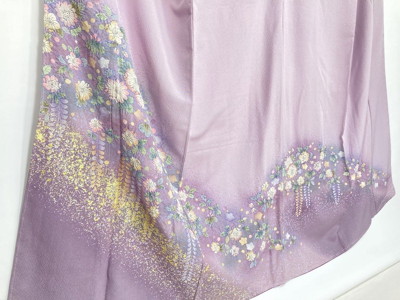 やわらかな「ぼかし染め」で、濃い紫への美しいグラデーションによりメリハリが生まれ、多彩な「友禅」「ぼかし染め」「蝋叩き染め」「墨絵書き」「手絞り」を駆使し、幻想的な[辻ヶ花]を優雅に枝垂れ、ふんだんな「本金箔」の煌めきが華やぎを添えた、熟練した職人の丹念な手仕事による大変加工の良いお品です。