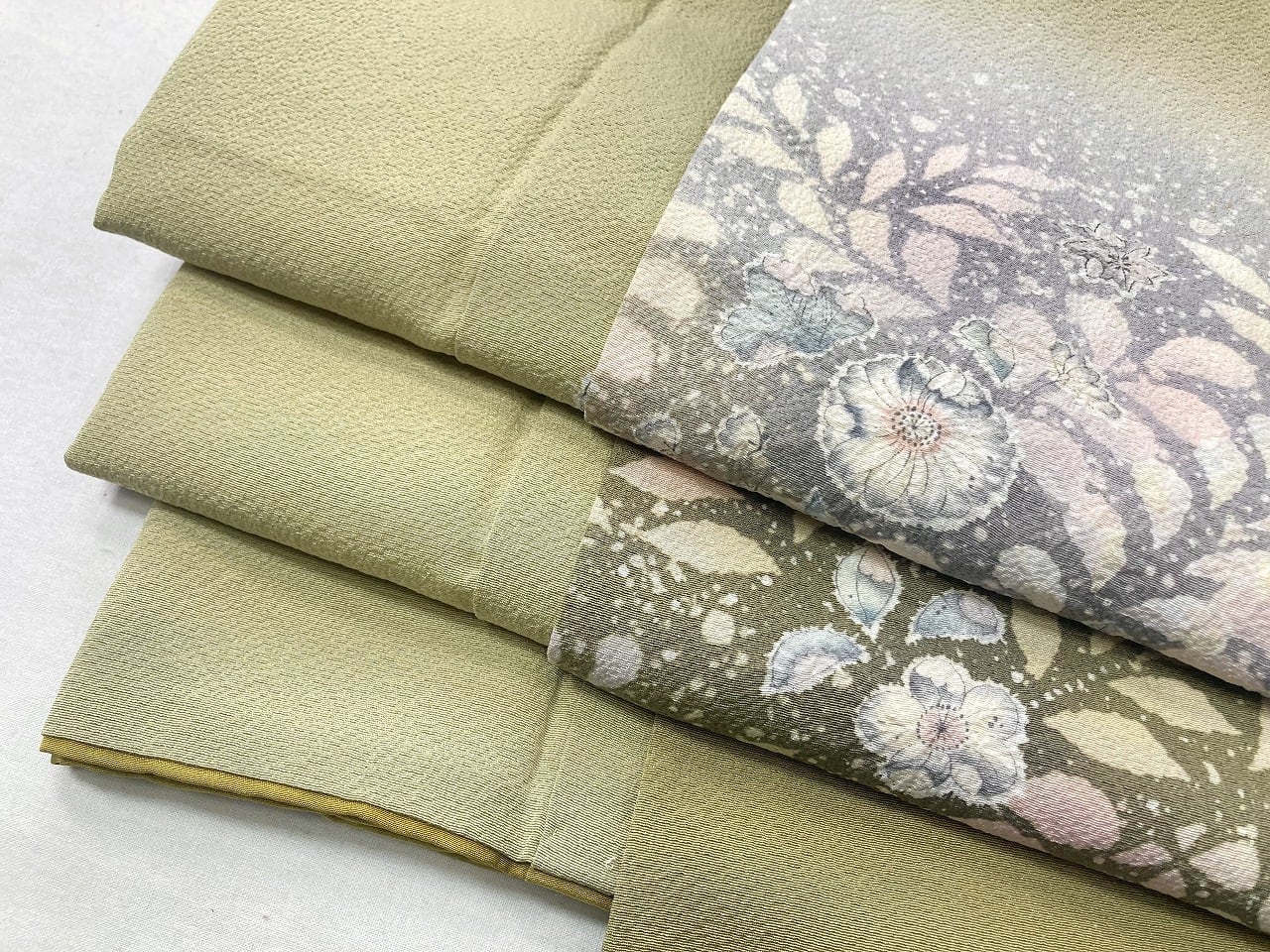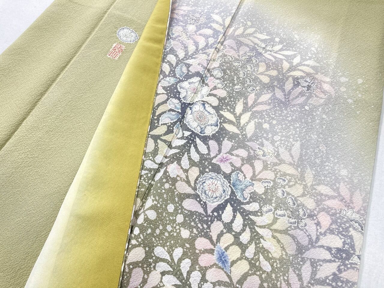 やわらかな「ぼかし染め」で、白から深い緑へのグラデーションによりメリハリが生まれ、多彩な「友禅」「ぼかし染め」「蝋叩き染め」「墨絵書き」「手絞り」を駆使し、美しく彩られた[辻ヶ花]を優雅に散りばめた、意匠美の作品です。