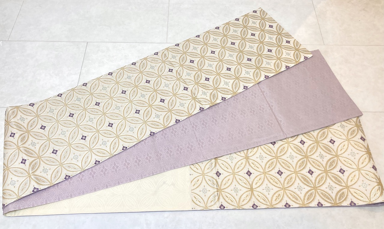 ◇清楚な白に紫や淡い水色が映え、ゴールドやシルバーの煌めきが華やぎを添えた、洗練されたデザインのとても優美な袋帯です。