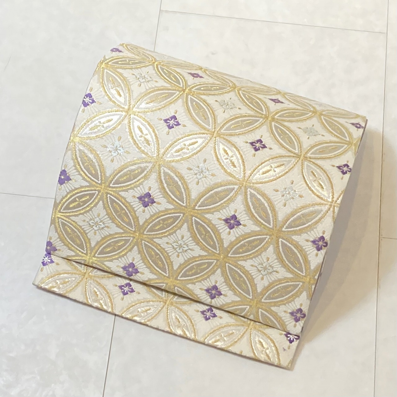 未使用 吉祥七宝文 唐織 袋帯 正絹 白 クリーム 紫 水色 695