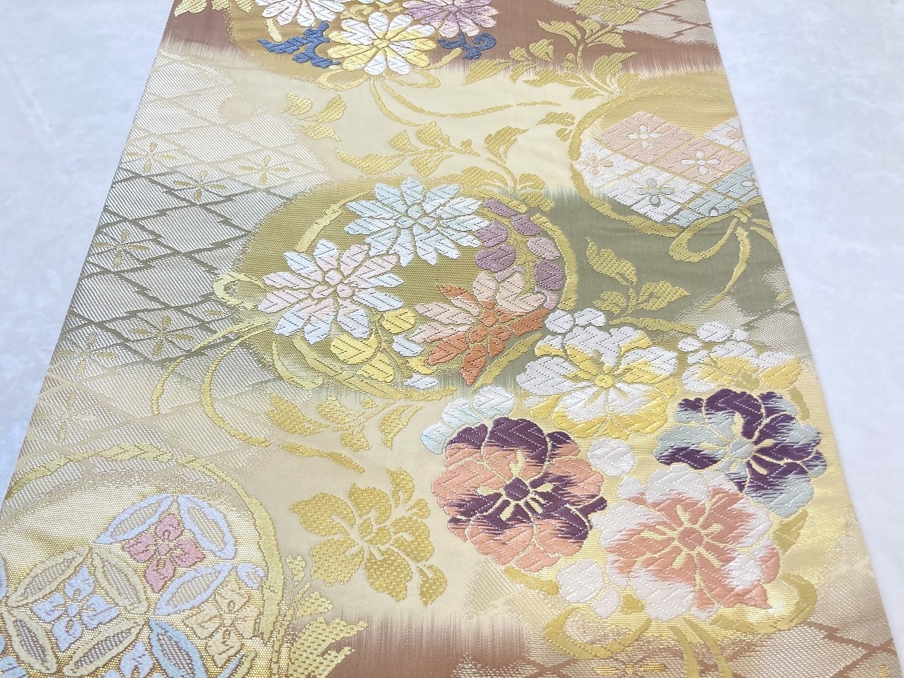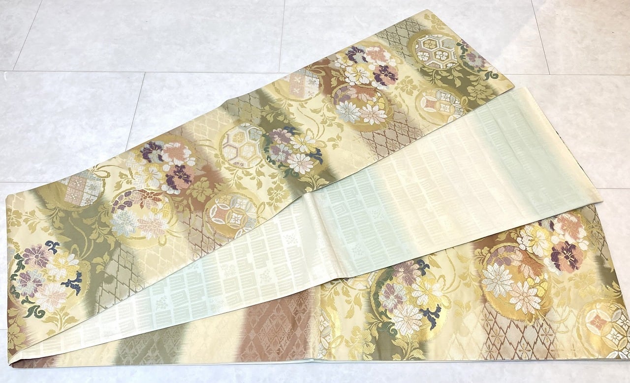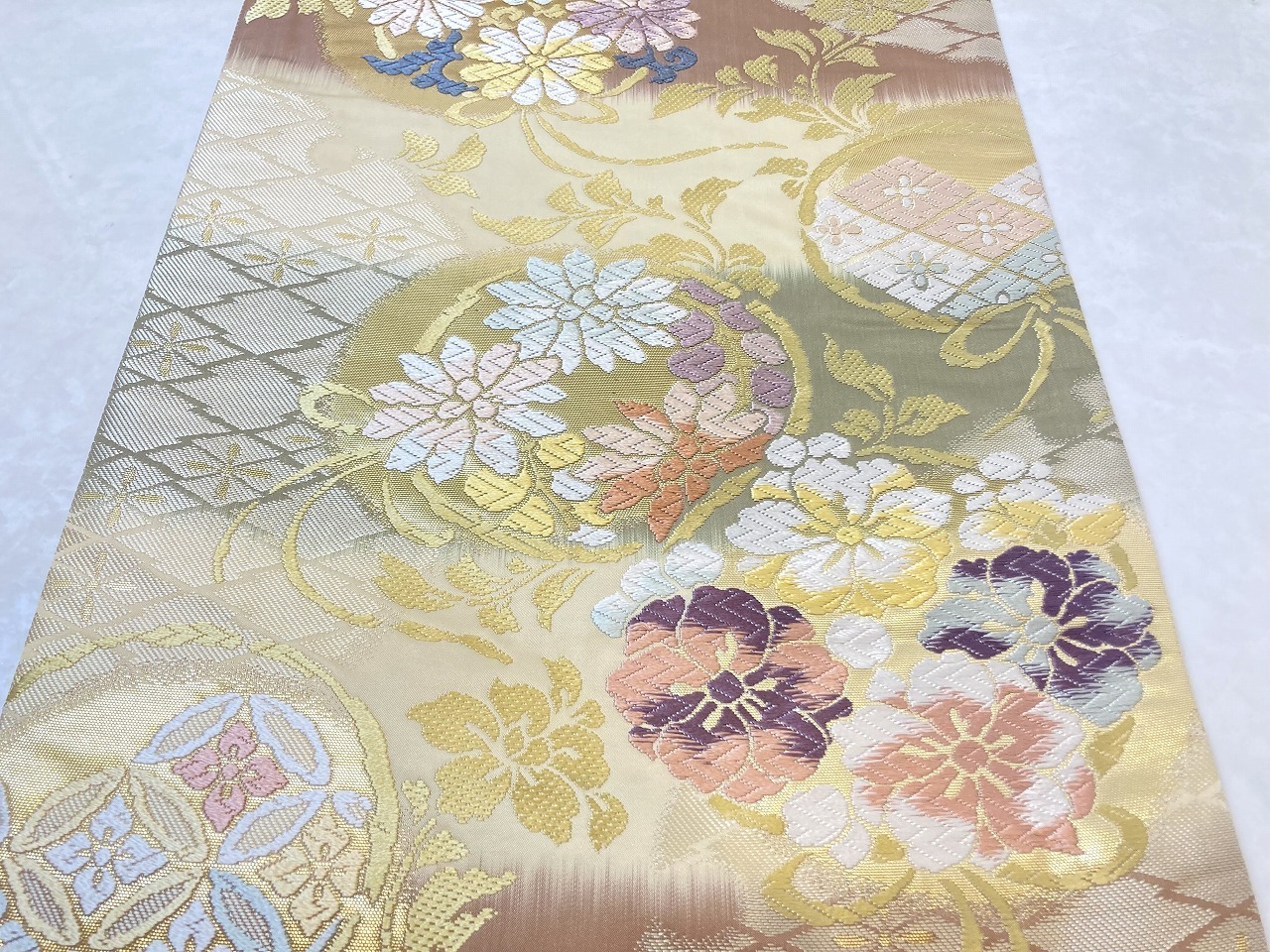 ◇上品な地色と柄行に、清楚な白や優しいパステルカラーの優美な色合いが美しい、ワンランク上の高級袋帯です。