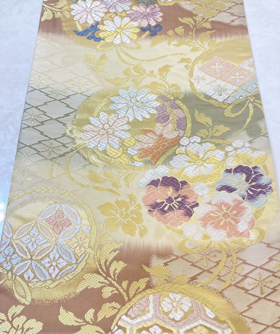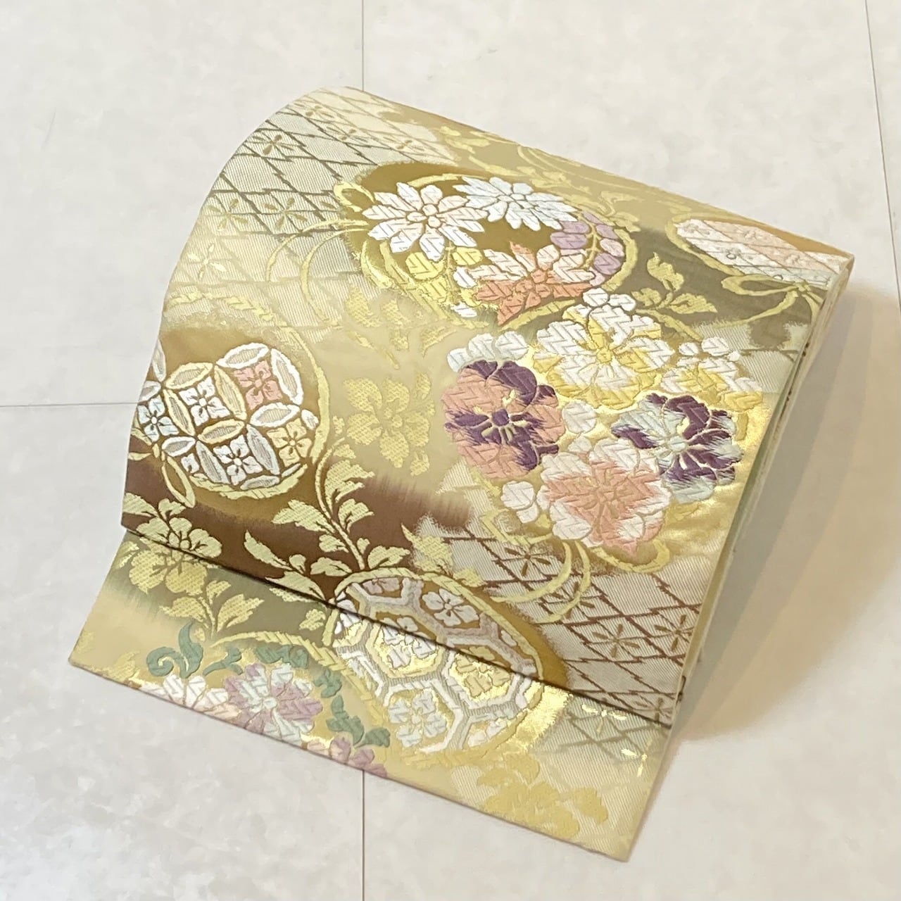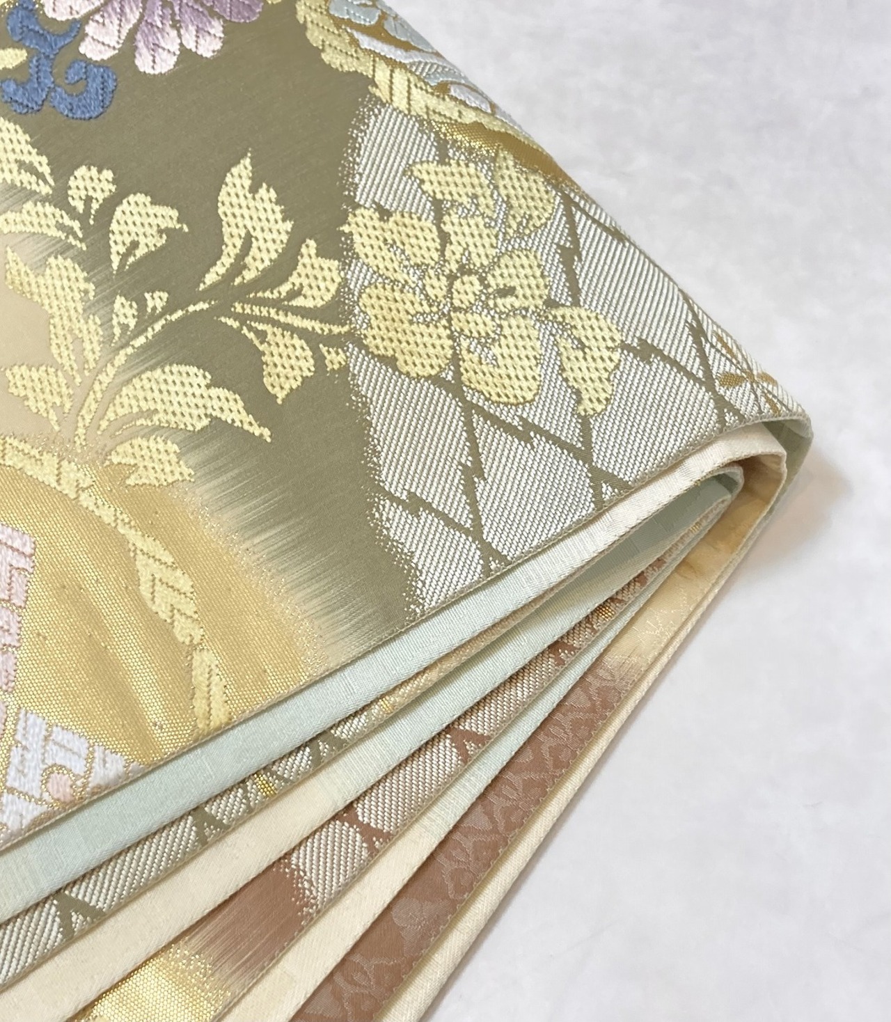 ◇上品な地色と柄行に、清楚な白や優しいパステルカラーの優美な色合いが美しい、ワンランク上の高級袋帯です。