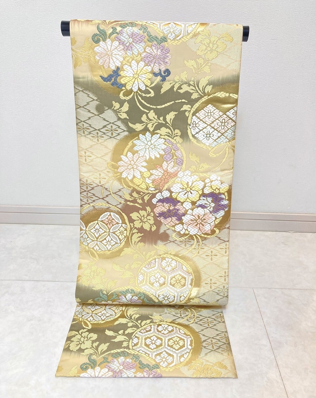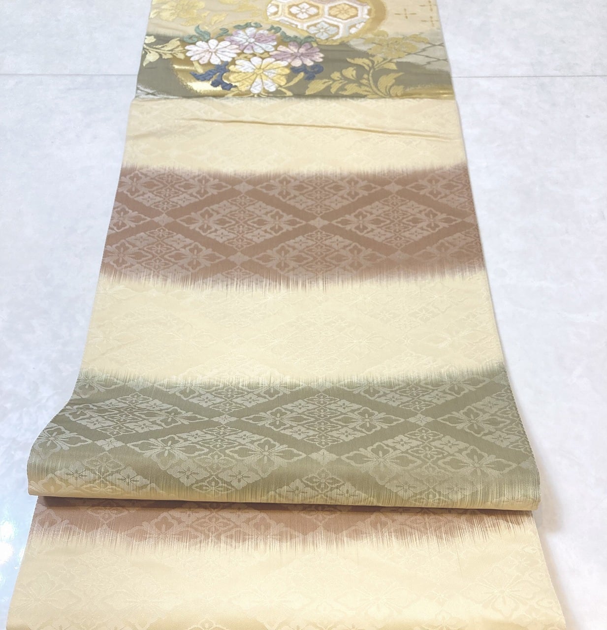 ■上品なクリーム色地に深い赤と緑のスタイリッシュな縞柄を施し、刺繍のようにふっくらとした繊細な「唐織」を駆使し、菊や桜などの花々や格調高い亀甲花菱や七宝花菱を丸にあしらった[春秋円想文]を間隔よく散りばめ、優雅な[唐花]を配し、本場西陣で緻密に織り上げた大変加工の良い意匠美の作品です。