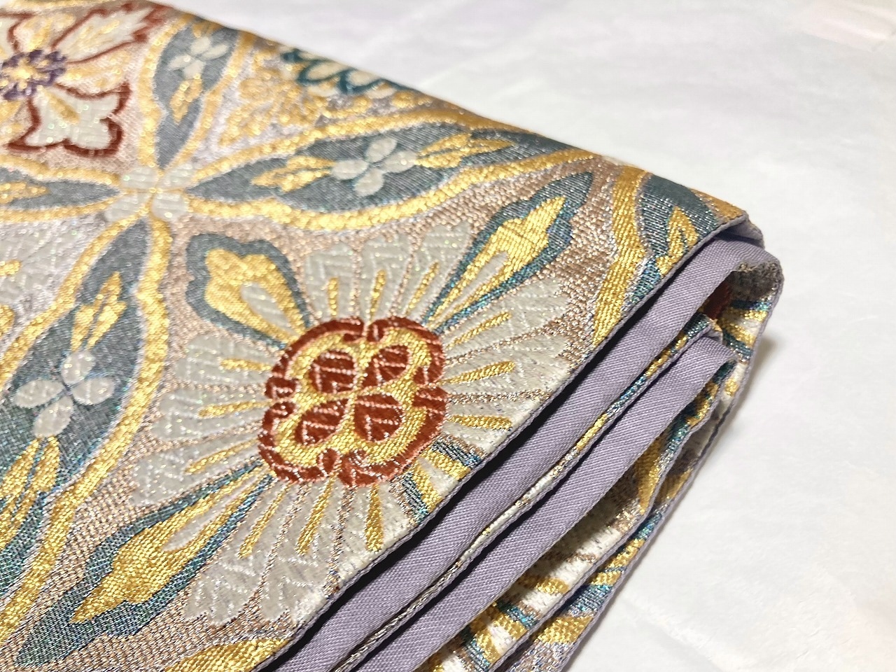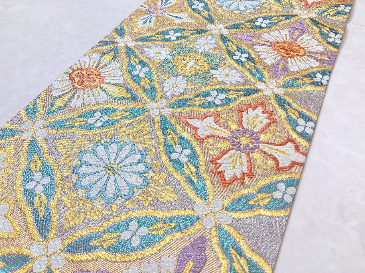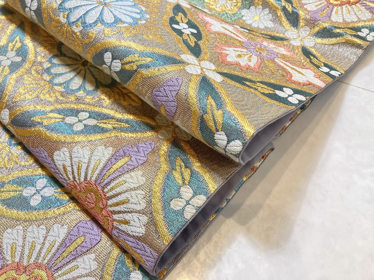 ■気品高く輝く「金糸」をふんだんに使い、格調高い[七宝]に優雅な[華紋]をあしらった大柄な[七宝花菱]を配し、白糸部分には「七色に煌めく箔」が華やぎを添えた、ふっくらとした刺繍のような「唐織り」で精巧に織り上げた、大変加工の良いお品です。