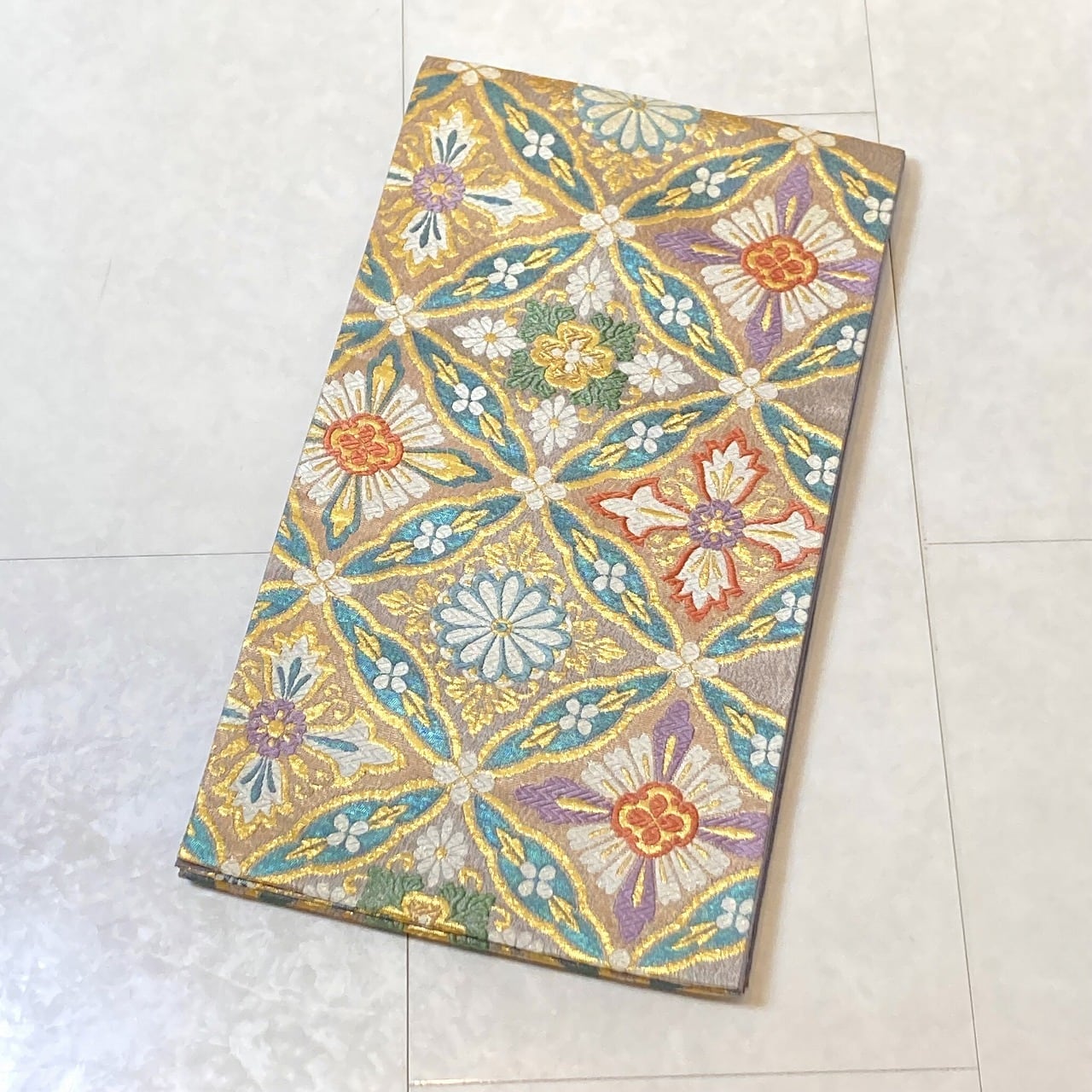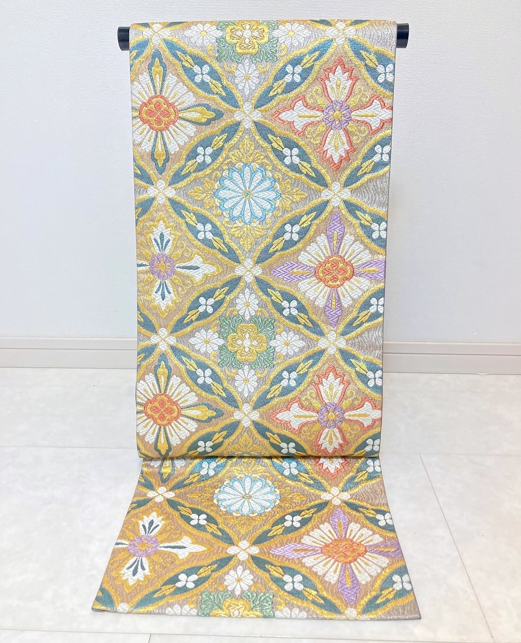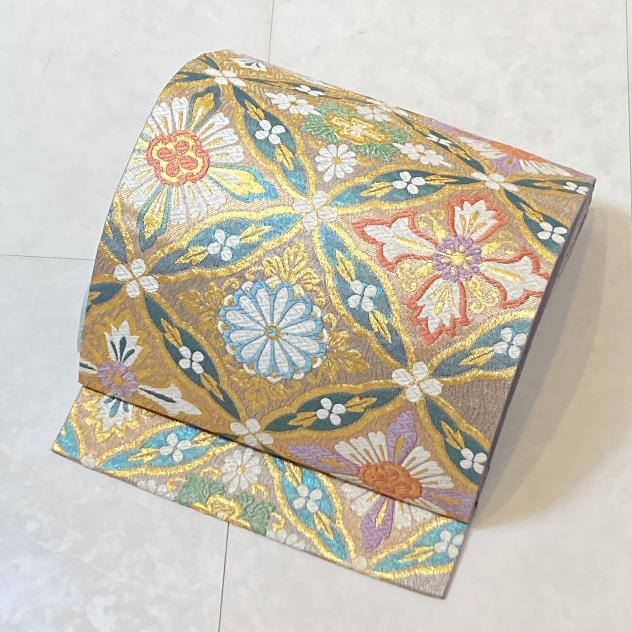 ■気品高く輝く「金糸」をふんだんに使い、格調高い[七宝]に優雅な[華紋]をあしらった大柄な[七宝花菱]を配し、白糸部分には「七色に煌めく箔」が華やぎを添えた、ふっくらとした刺繍のような「唐織り」で精巧に織り上げた、大変加工の良いお品です。