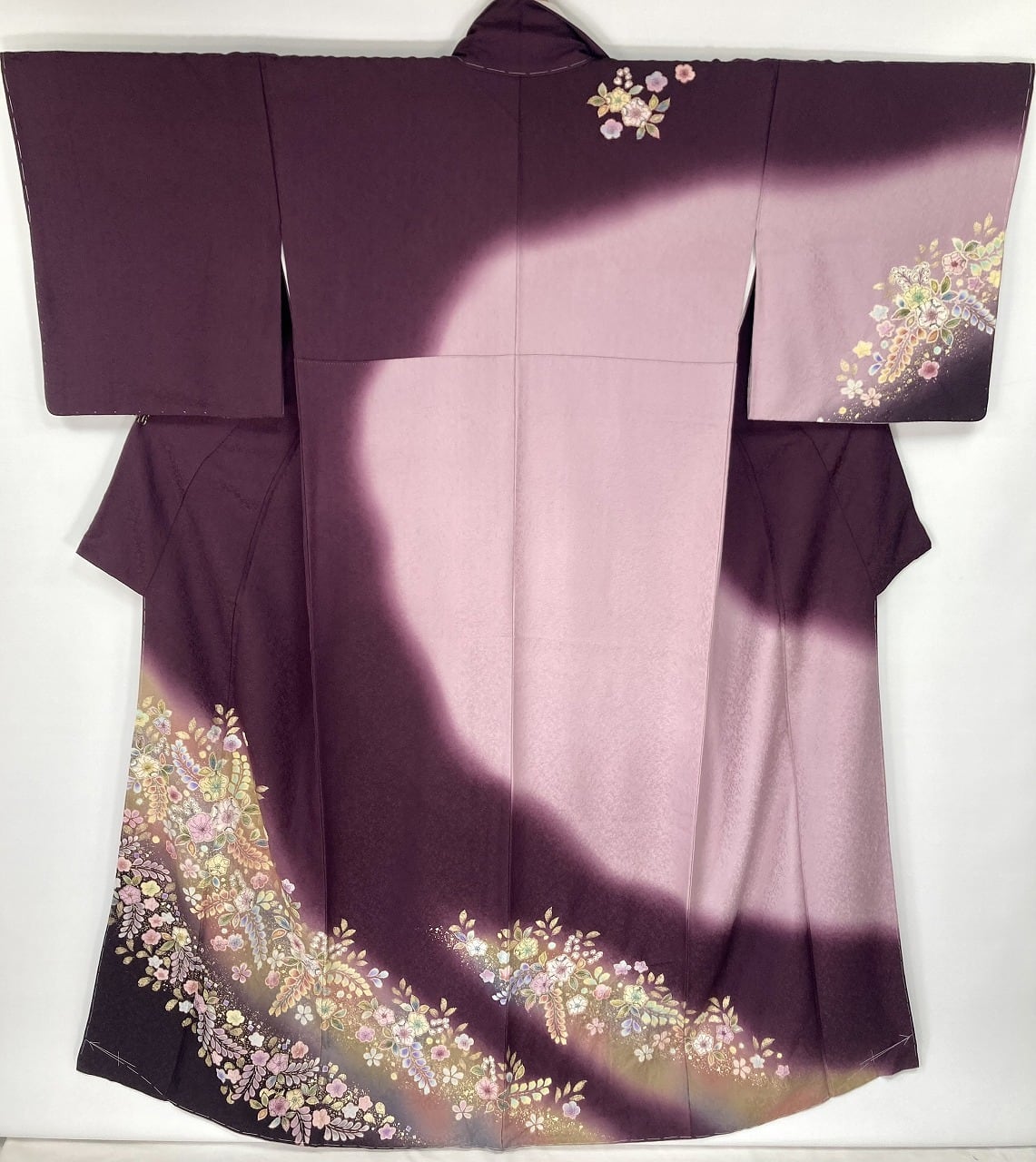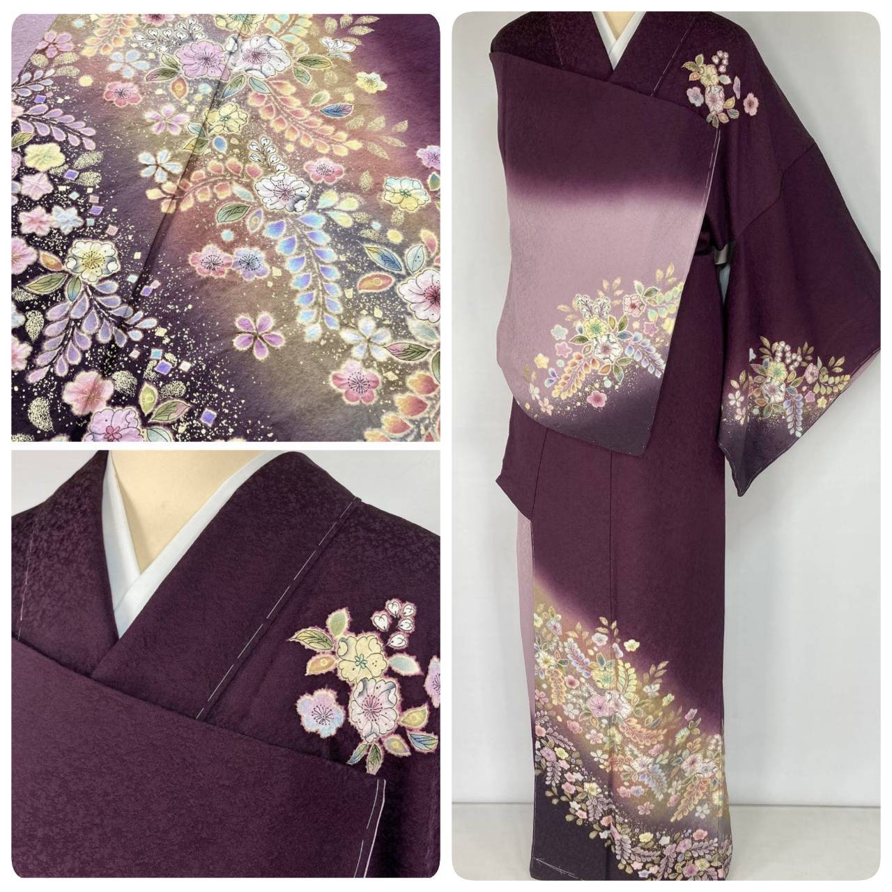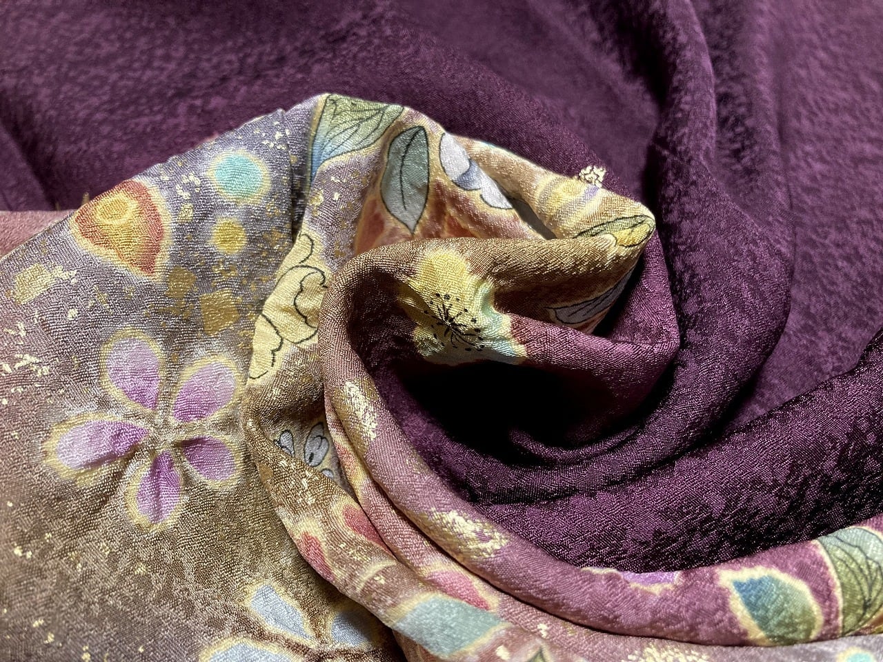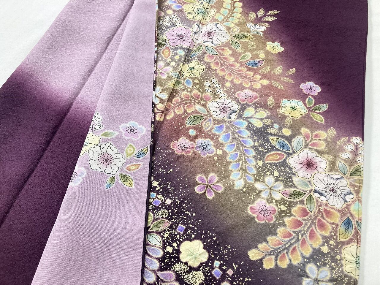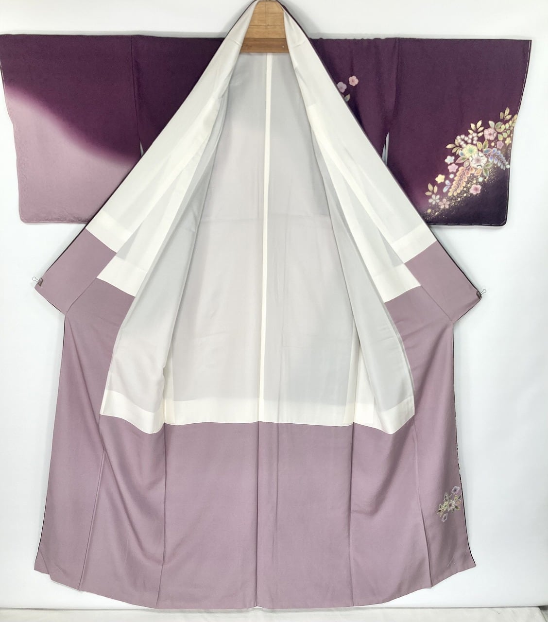 淡紅藤のような明るい紫と濃い紫の華麗な「染め分け」や美しいグラデーションの「ぼかし染め」によりメリハリが生まれ、多彩な「友禅」「ぼかし染め」「金箔」「手絞り」を駆使し、美しく彩られた[辻ヶ花]が咲き乱れ、流れるように優雅に配した、たうっとりするほど美しい見事な作品です。