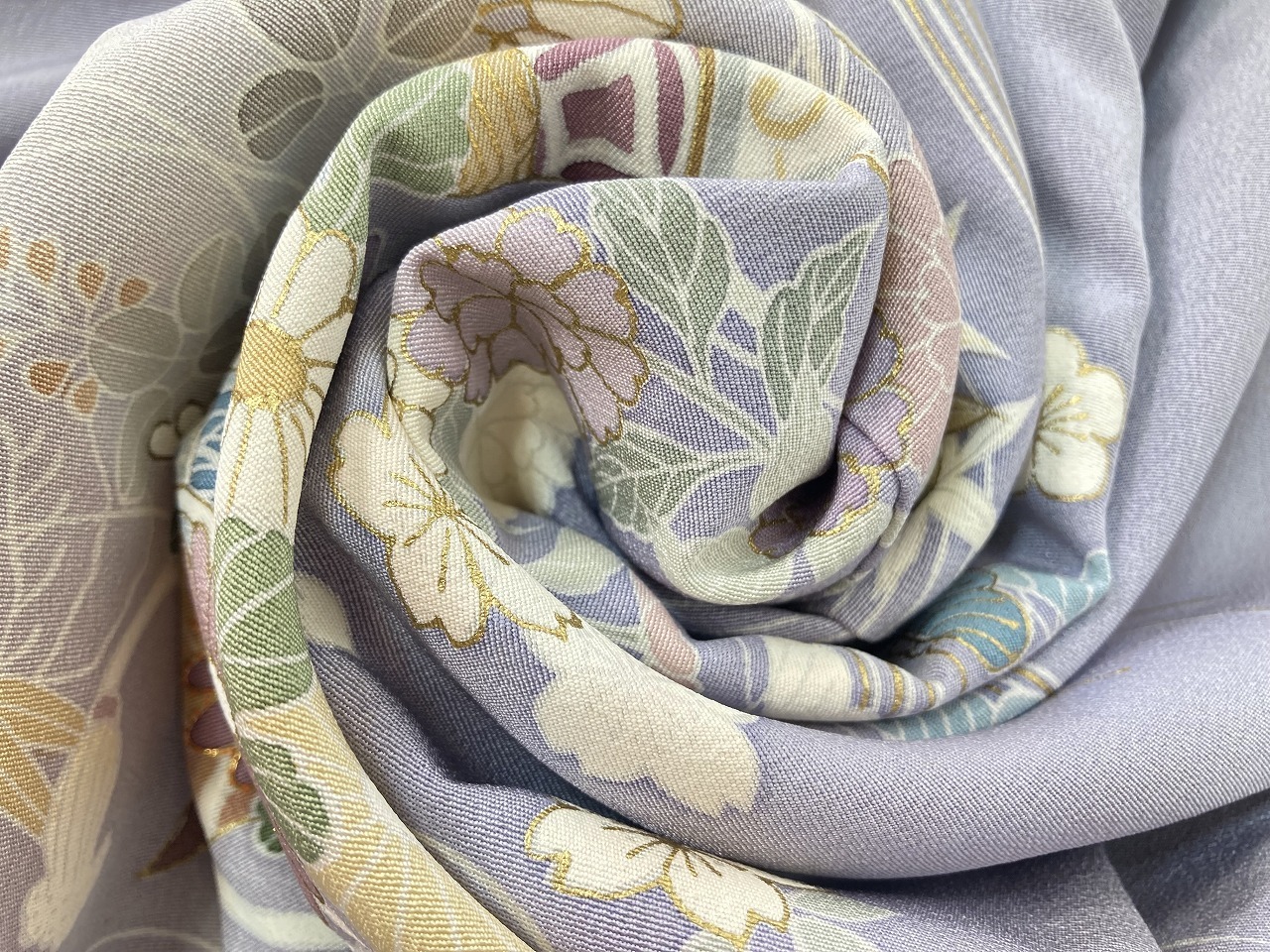 京友禅 金駒刺繍 金彩 花柄 貝桶 訪問着 袷 正絹 紫 グレー 淡藤色 1371