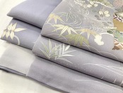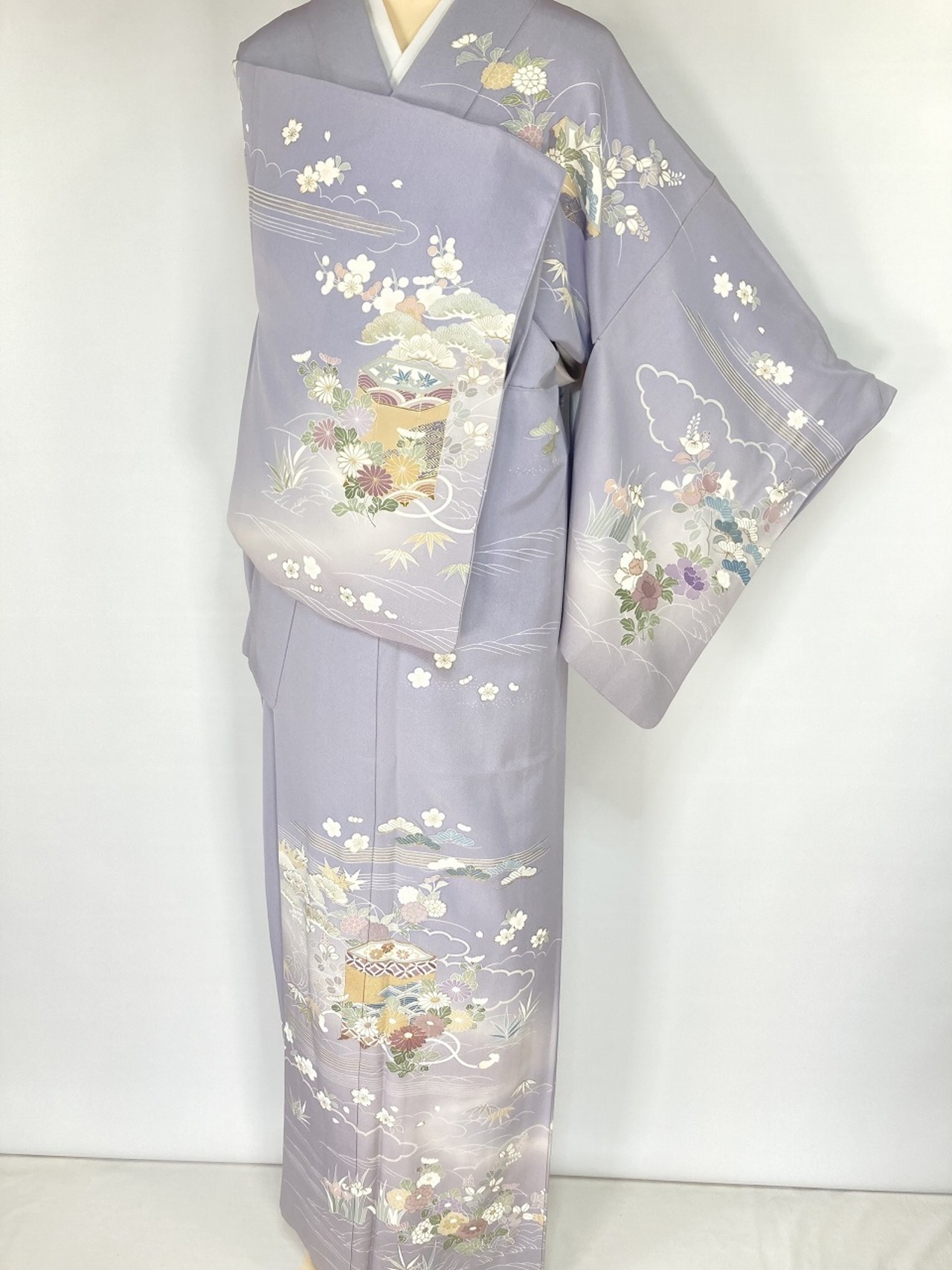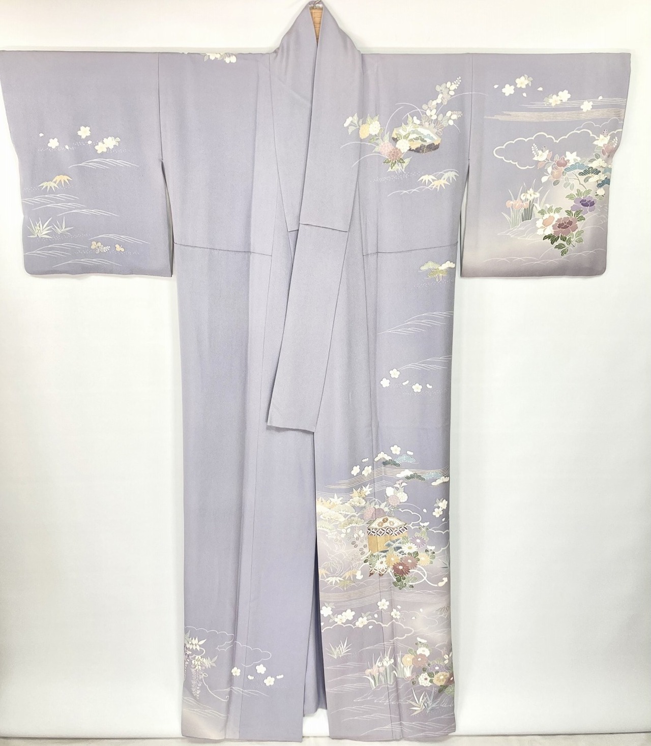 やわらかな「ぼかし染め」で白から淡いグレーへのグラデーションでメリハリが生まれ、精巧な「型染め友禅」で縁起の良い吉祥文の[松竹梅]や、菊・桜・杜若などの[四季の花々]を散りばめ、雅やかな[貝桶]を間隔よく配し、気品高く煌めく「金彩」が華やぎを添え、上前には丹念な手仕事による「金駒刺繍」を施した意匠美の作品です。