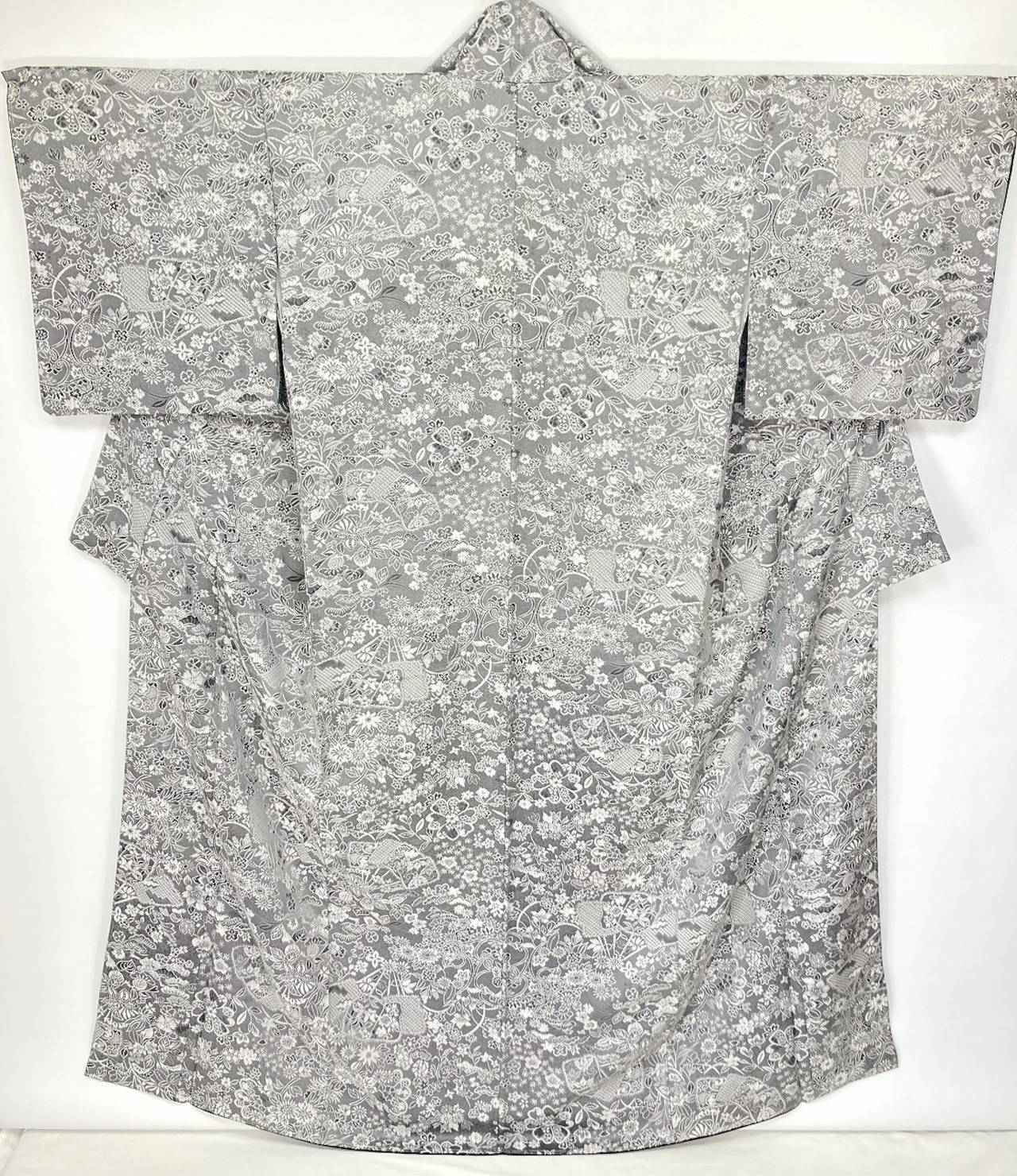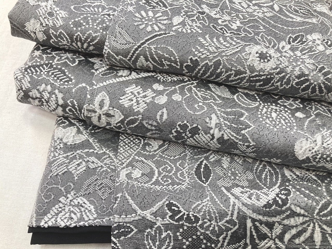 ■きめ細かいレースのようにふっくらと繊細に織り出し、角度や光りにより黒のコントラストで立体感や奥行きが生まれ、[四季の花々]が美しく咲き乱れ上品な[扇]を間隔良く配し、細密に丹念に織り出された大変美しい見事な作品です。