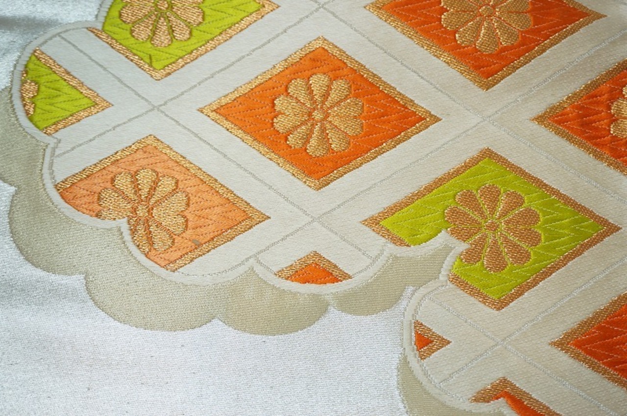 ■銀地に金の菊紋が描かれた豪華で上品な袋帯です。