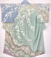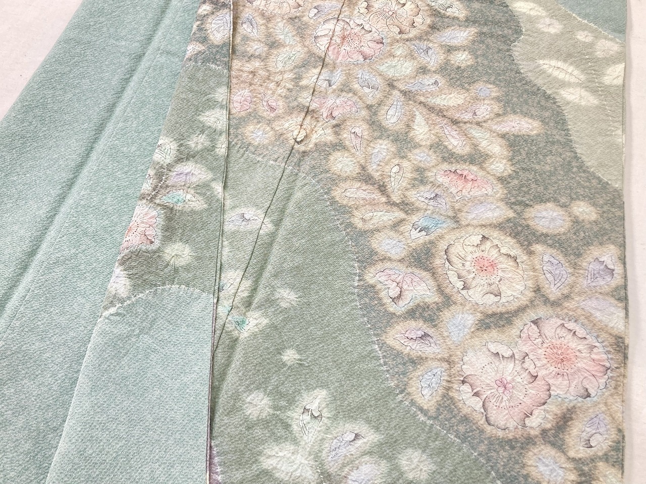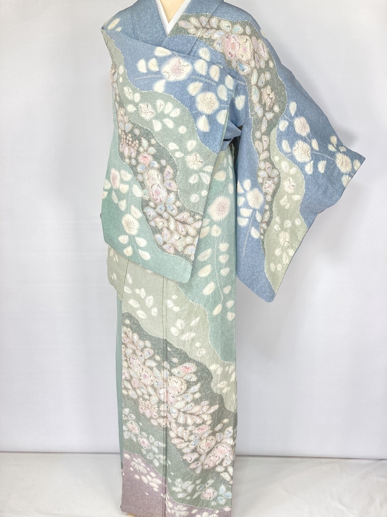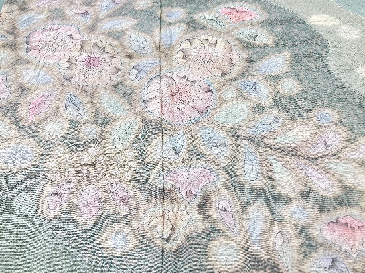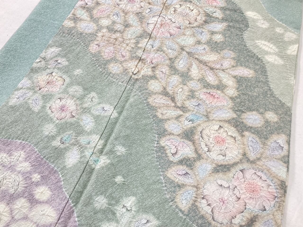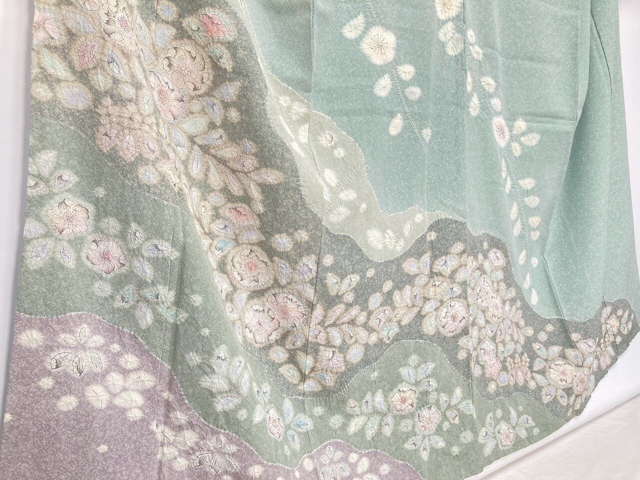 繊細な手仕事による「天目染め」を全体に施し、独特きめ細かな模様で奥行きや立体感が生まれ、青・黄緑・淡いティファニーブルー・深い緑・緑・紫への大胆な「染め分け」が華やぎを添え、多彩な「友禅」「ぼかし染め」「手絞り」を駆使し、幻想的な[辻ヶ花]が咲き乱れ、上部からは華麗に枝垂れた、手間隙かけて制作された大変加工の良いお品です。