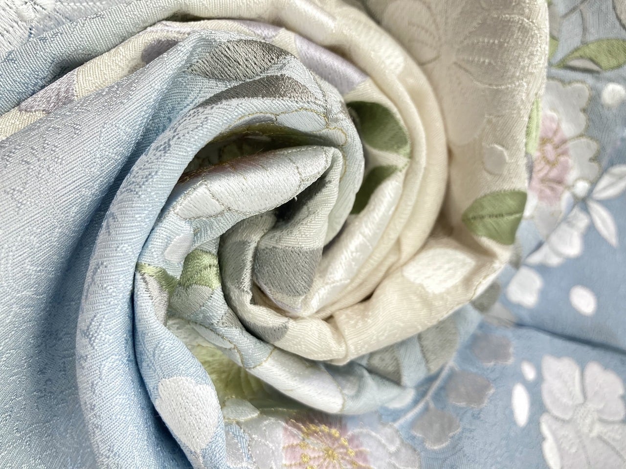 ■やわらかくしなやかな「正絹」地に、優雅な[唐花]の地紋をきめ細かく織り出し、角度によりエレガントに浮かび上がり、華やぎを添えております。