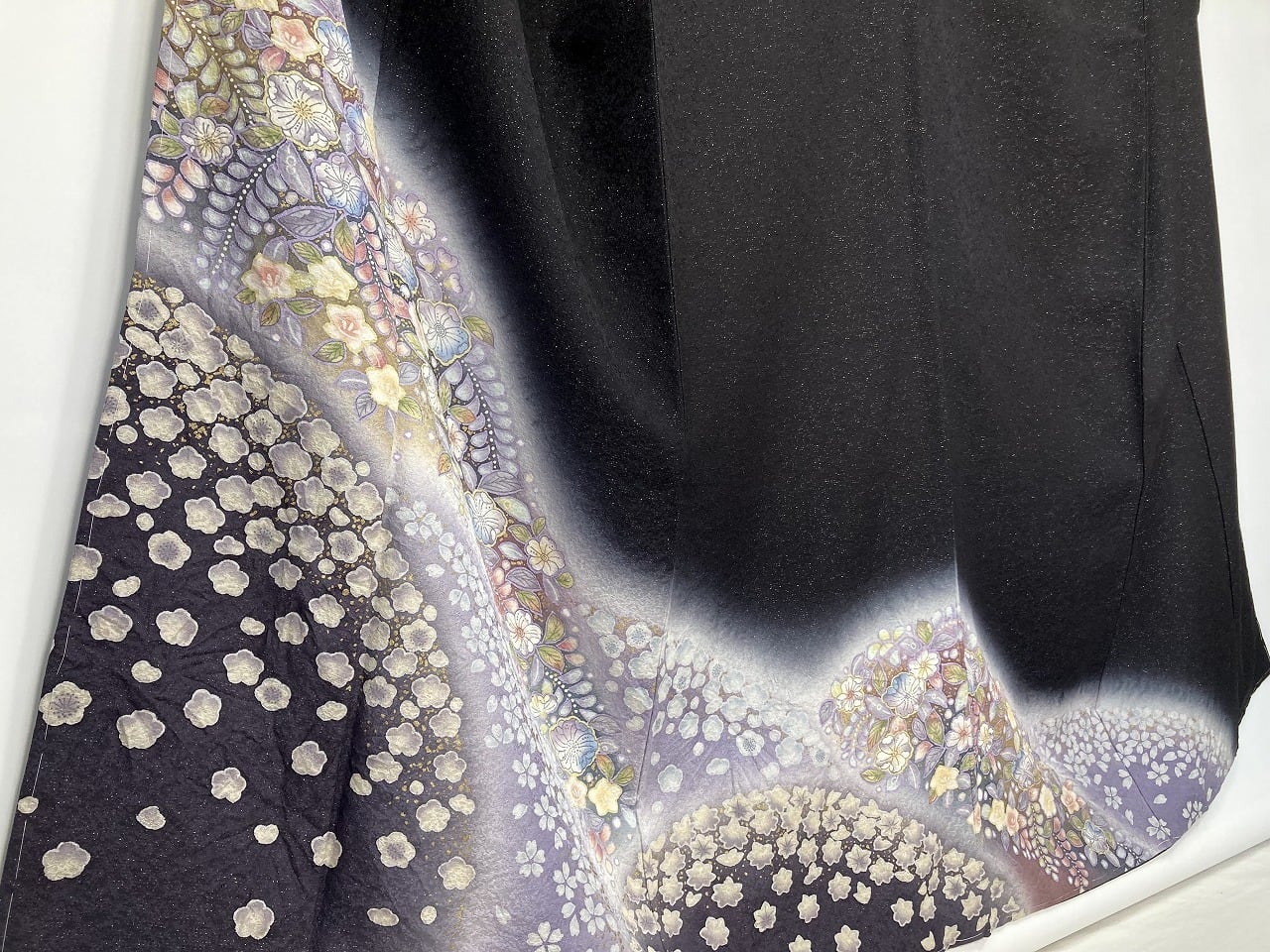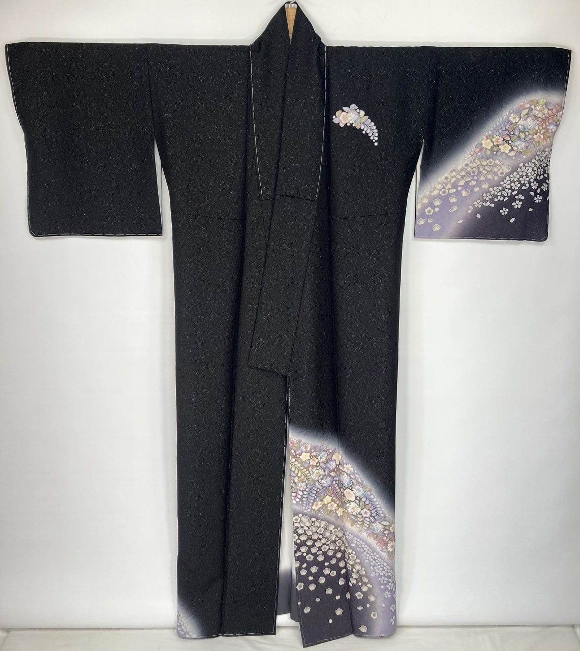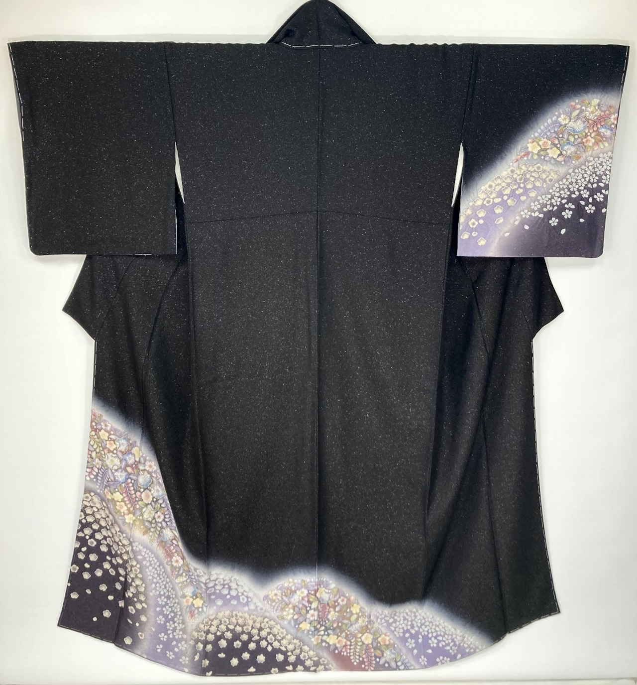 ◇黒地に銀糸が美しく煌めき、淡く優しいパステルカラーで彩られた[辻ヶ花]が映える、気品溢れるとてもエレガントな訪問着です。