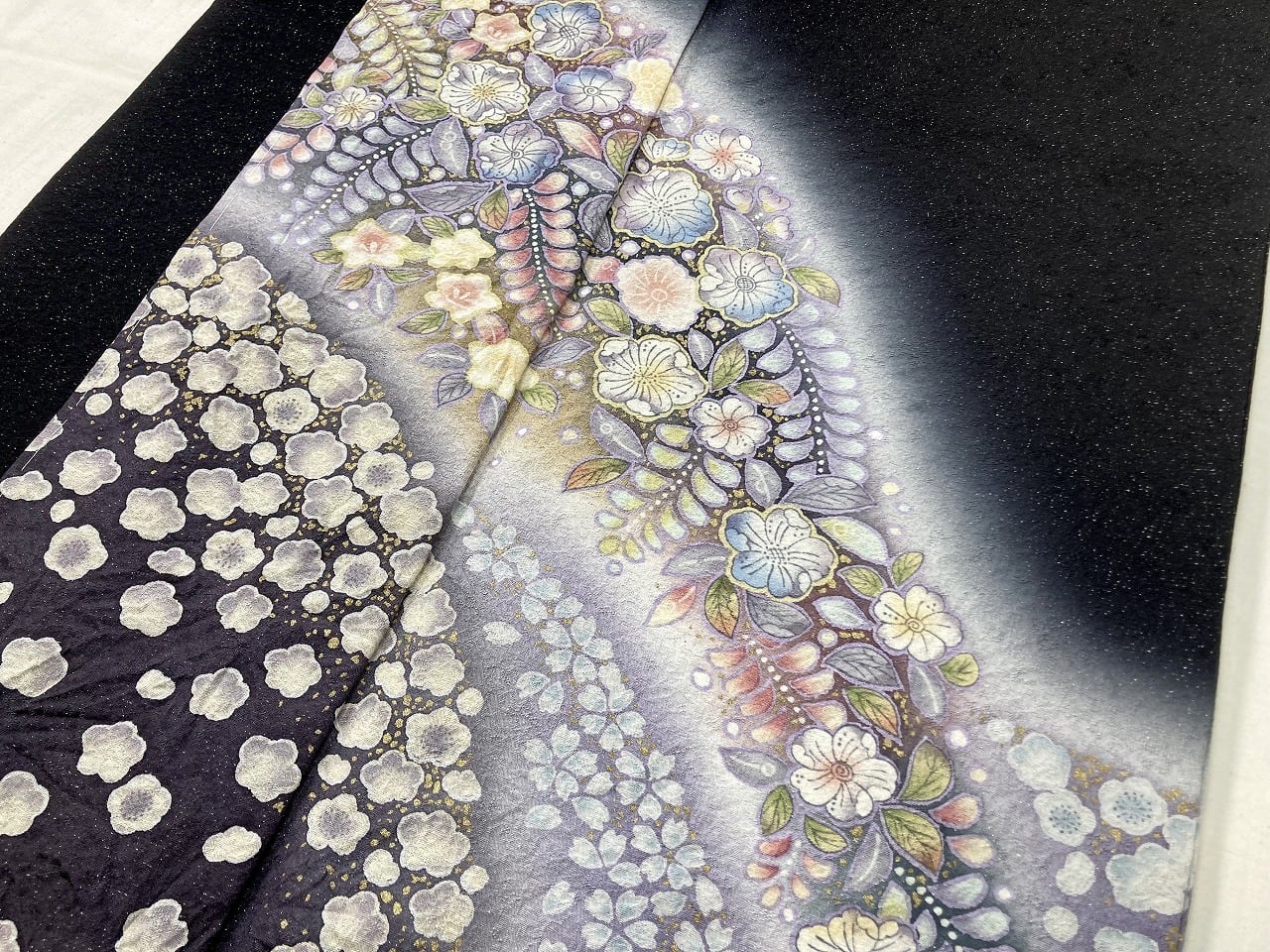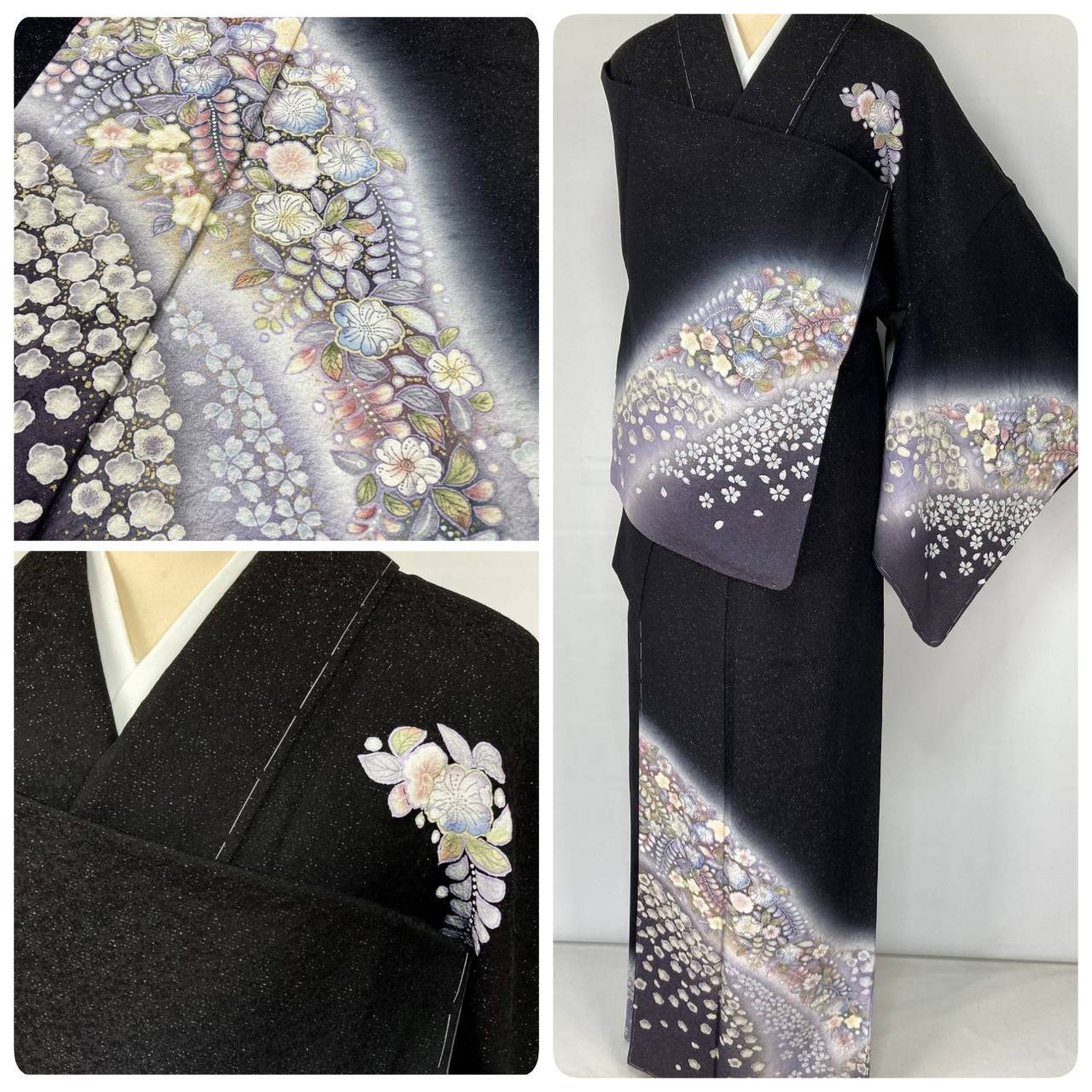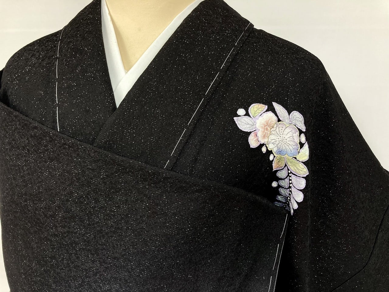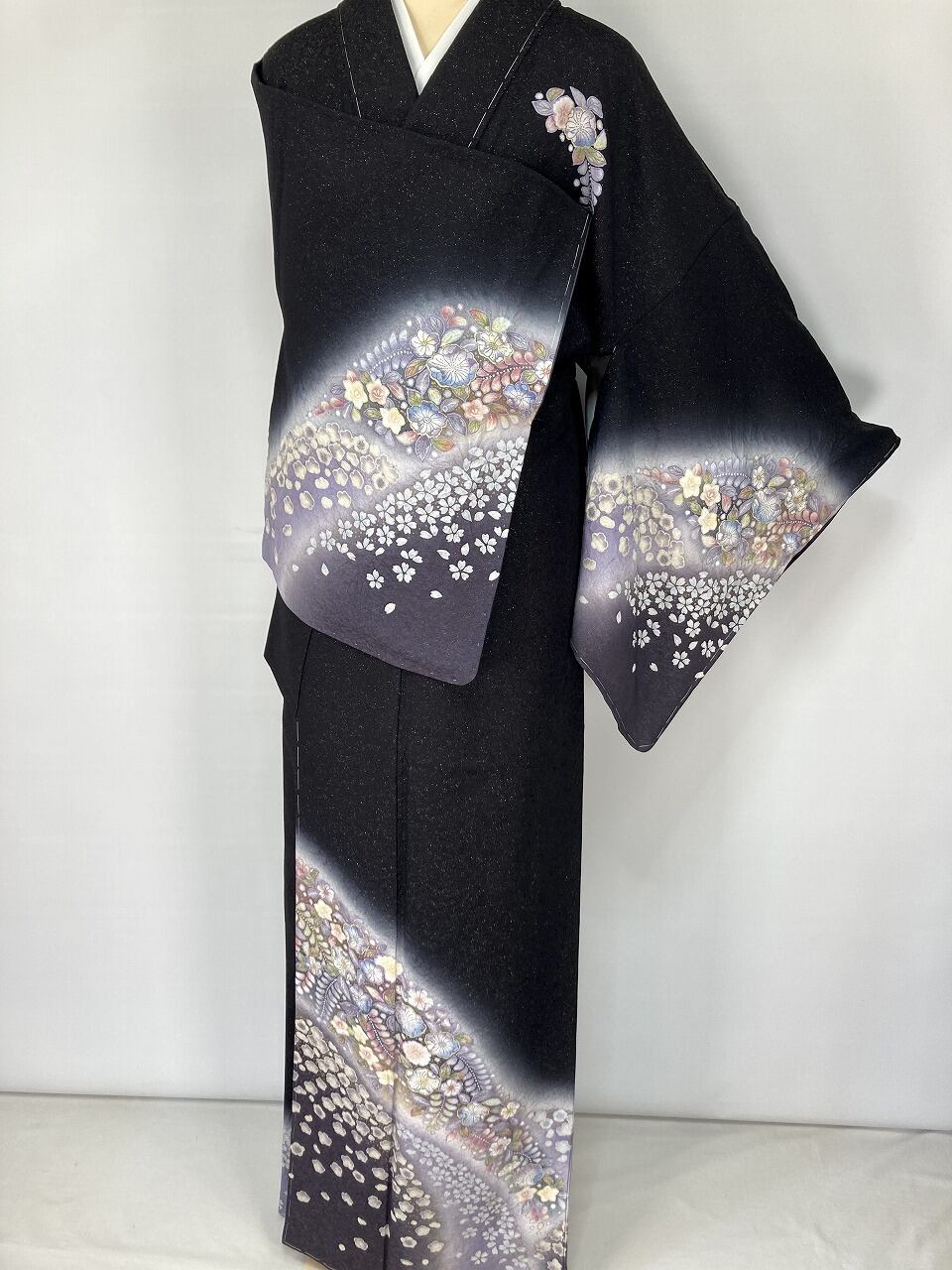◇黒地に銀糸が美しく煌めき、淡く優しいパステルカラーで彩られた[辻ヶ花]が映える、気品溢れるとてもエレガントな訪問着です。
