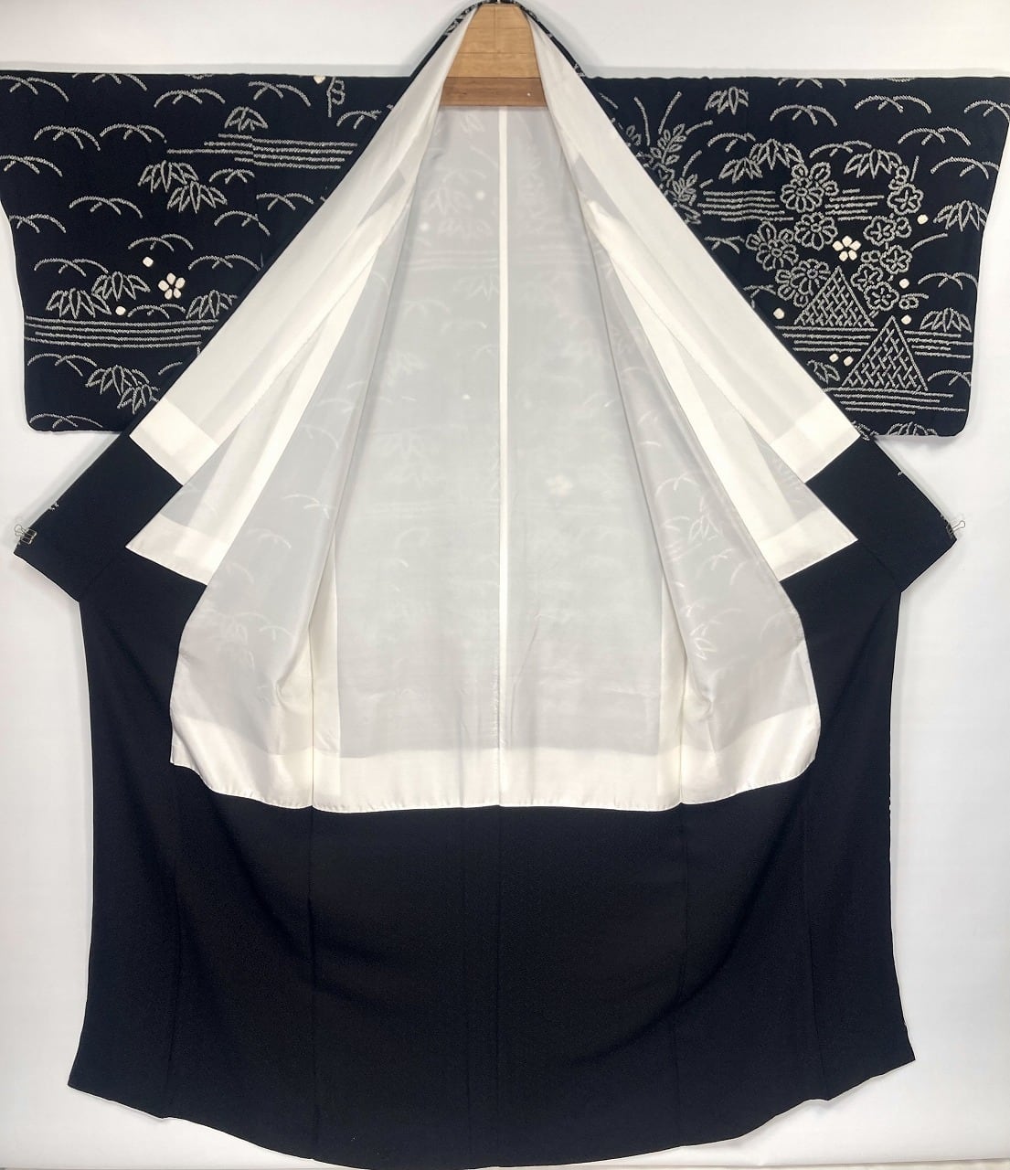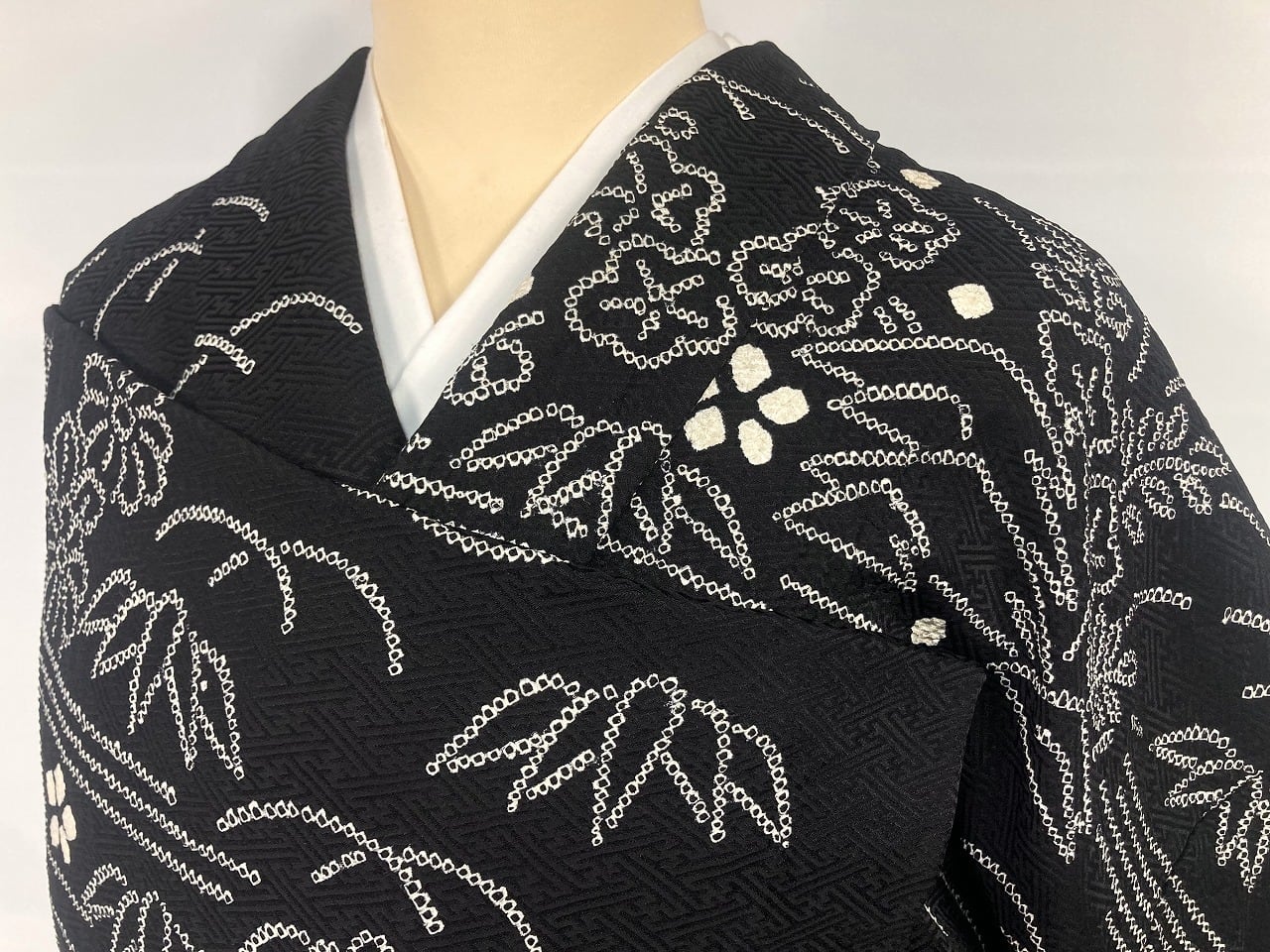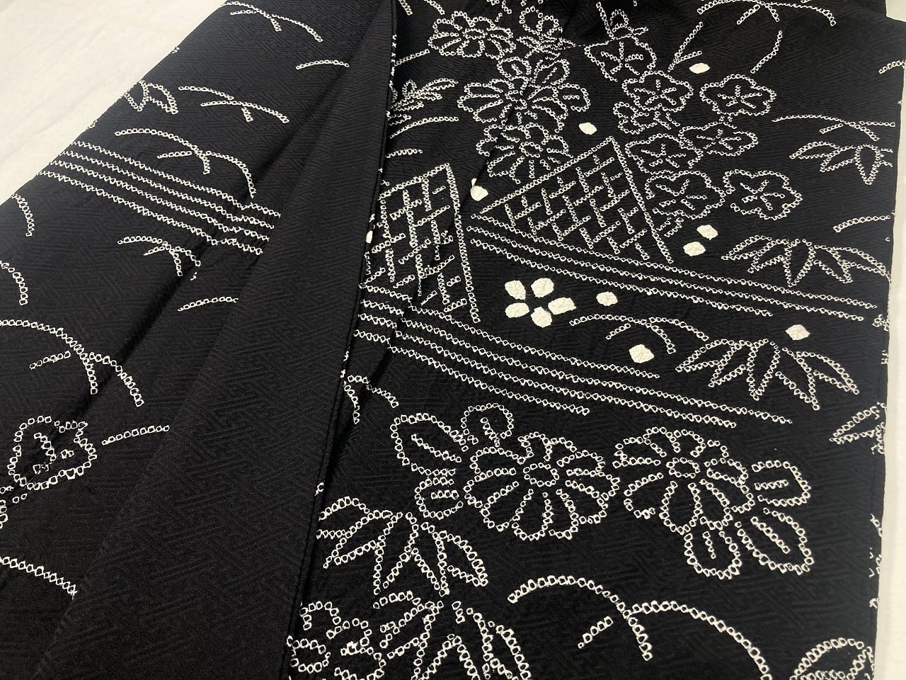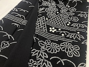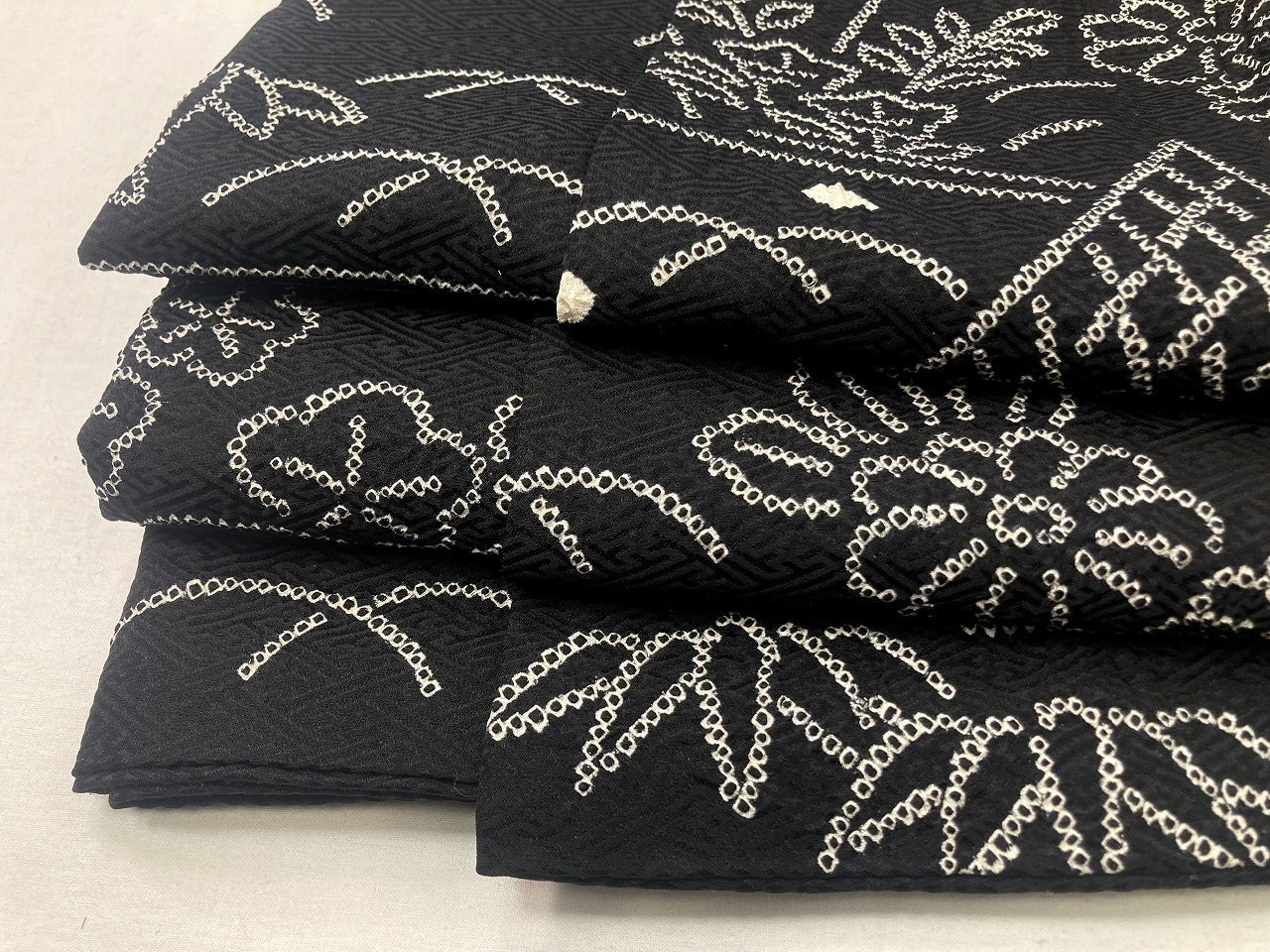 黒地に格調高い[紗綾形地紋]を織り出し、白の大きめな「小帽子絞り」きめ細かな「人目絞り」を駆使し、菊や桔梗などの花々に縁起の良い[吉祥文]の竹と[芝草文]を散りばめ、海辺の風景で描かれるモダンな[網干文]を配し、一粒一粒丹念な「手絞り」により描き上げた大変素晴らしい見事な作品です。