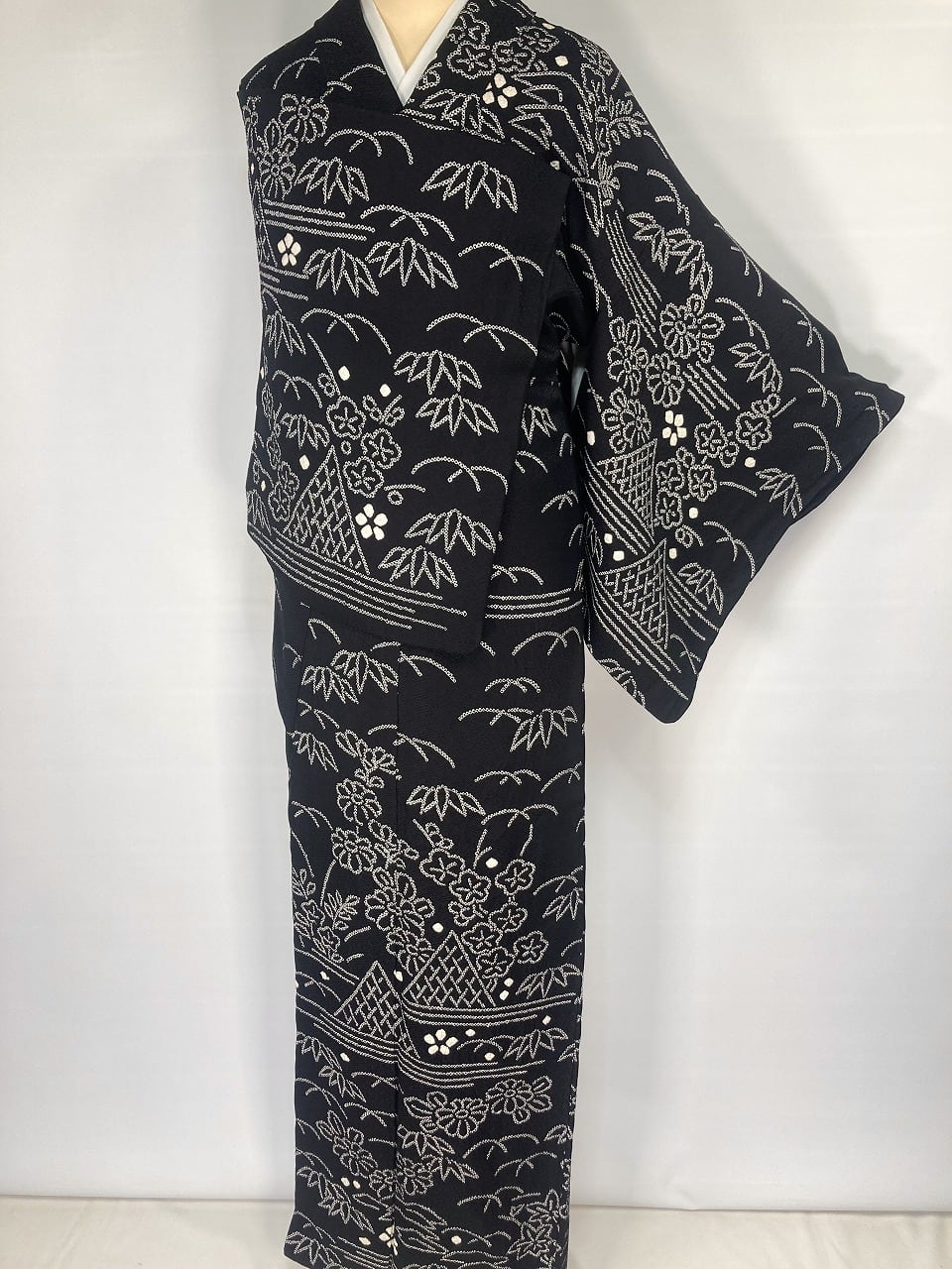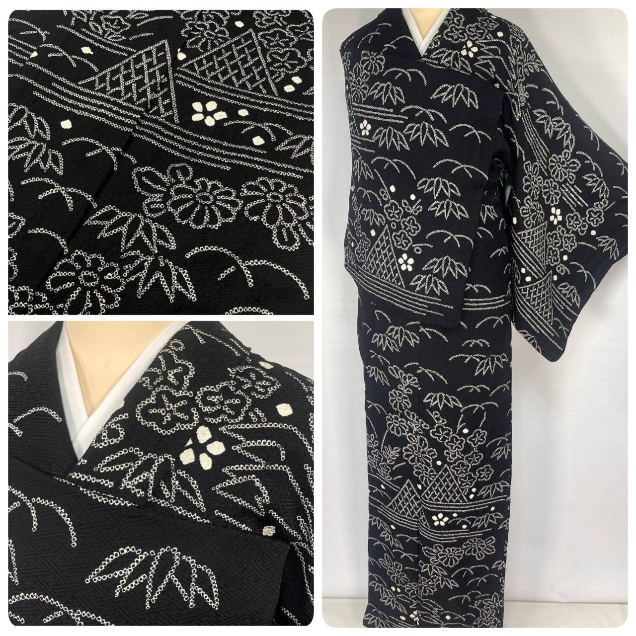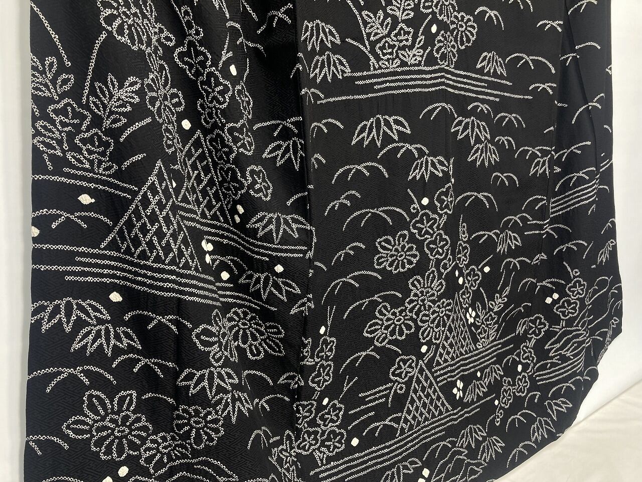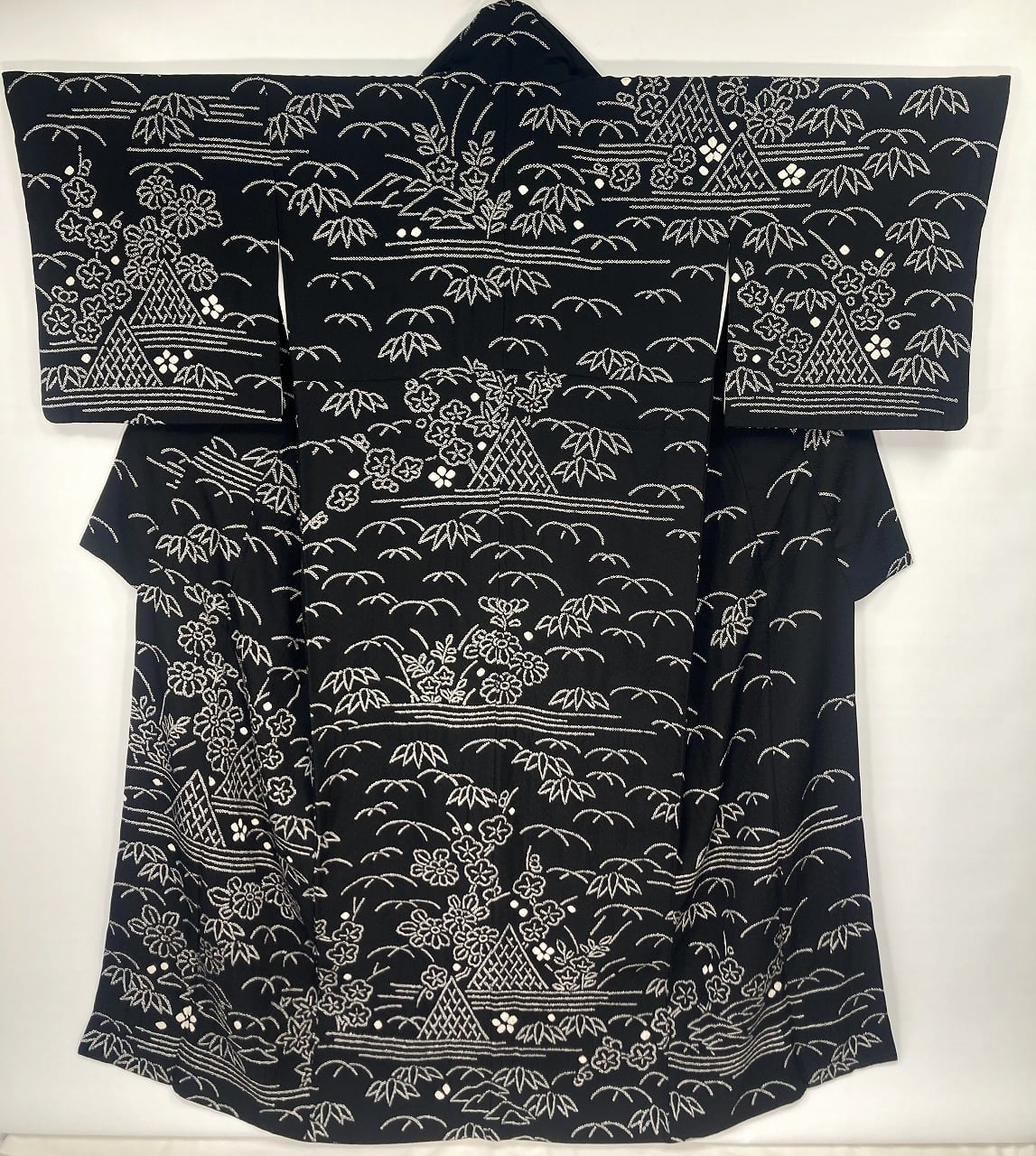 黒地に格調高い[紗綾形地紋]を織り出し、白の大きめな「小帽子絞り」きめ細かな「人目絞り」を駆使し、菊や桔梗などの花々に縁起の良い[吉祥文]の竹と[芝草文]を散りばめ、海辺の風景で描かれるモダンな[網干文]を配し、一粒一粒丹念な「手絞り」により描き上げた大変素晴らしい見事な作品です。