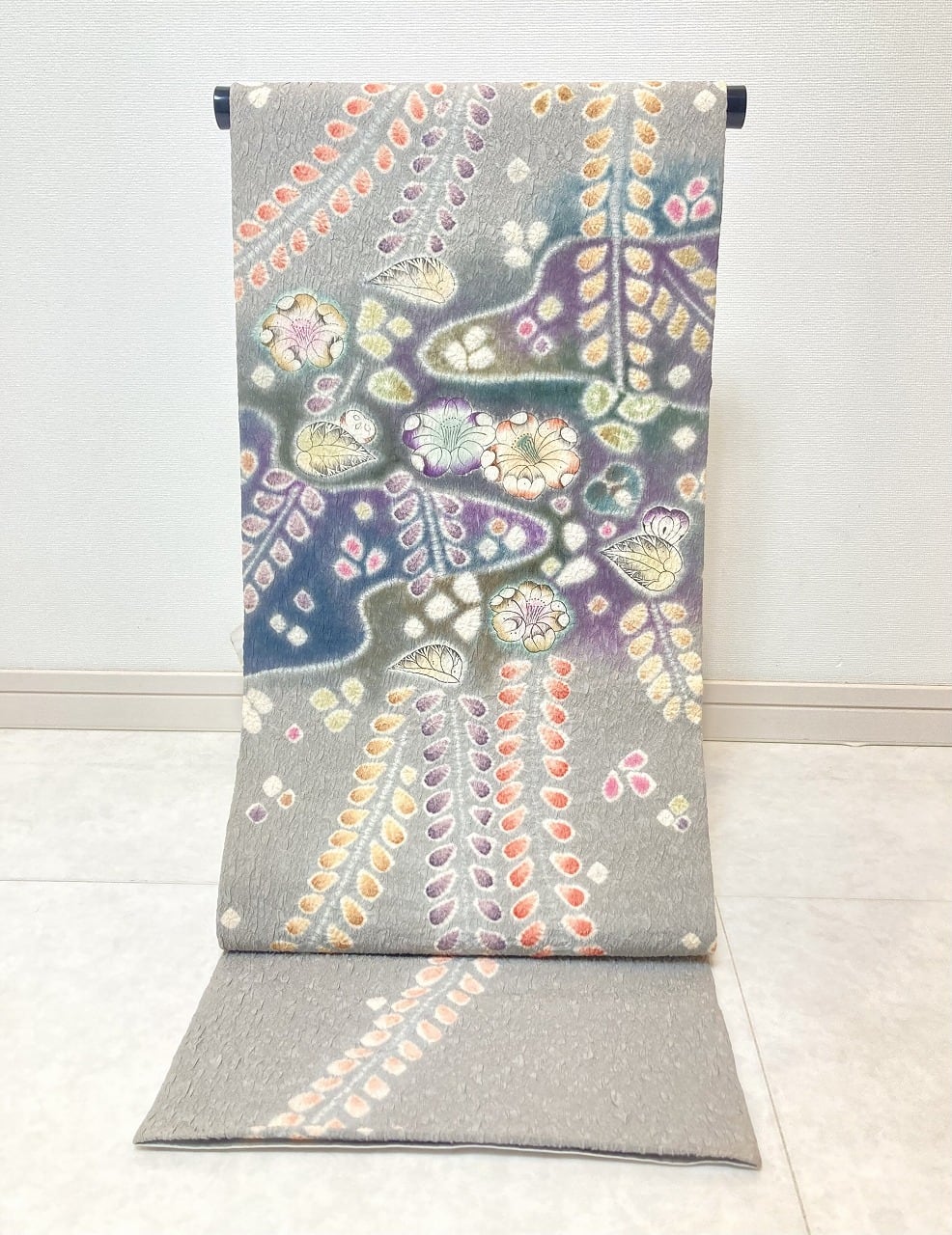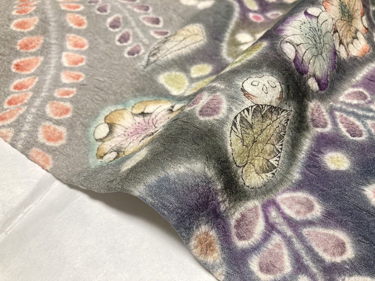 ■全体のあしらった丹念な「膨れ織り」の凹凸により奥行きや立体感が生まれ、多彩な「友禅」「ぼかし染め」「墨絵書き」「手絞り」を駆使し幻想的な[辻ヶ花]が咲き誇り、一刺し一刺し丹念な手仕事による「絞り染め」による意匠美の素晴らしい作品です。