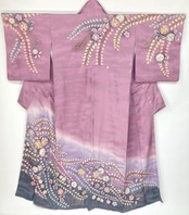 やわらかな「ぼかし染め」で青紫からの淡い黒への美しいグラデーションによりメリハリが生まれ、多彩な「友禅」「絞り染め」「ぼかし染め」「墨絵書き」を駆使し、ティファニーブルーやパステルカラーの紫などに彩られた幻想的な[辻ヶ花]が華麗に枝垂れた、一刺し一刺し丹念な手絞りをふんだんに施した、うっとりするほど美しい大変加工の良いお品です。