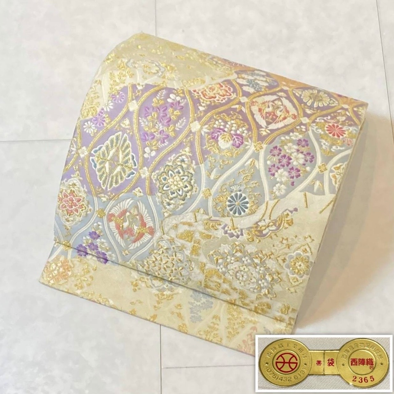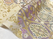 ■上品な淡いクリーム色地に、美しく煌めく「金糸」をふんだんに使い、刺繍のようなふっくらとした「唐織」で、優雅な[華紋]や格調高い[立涌文]に菊・桜・萩・唐花などの花々をあしらい、神秘の素材と言われる貴重な「貝紫」を散りばめ、本場西陣で緻密に織り出されたうっとりするほど美しい作品です。