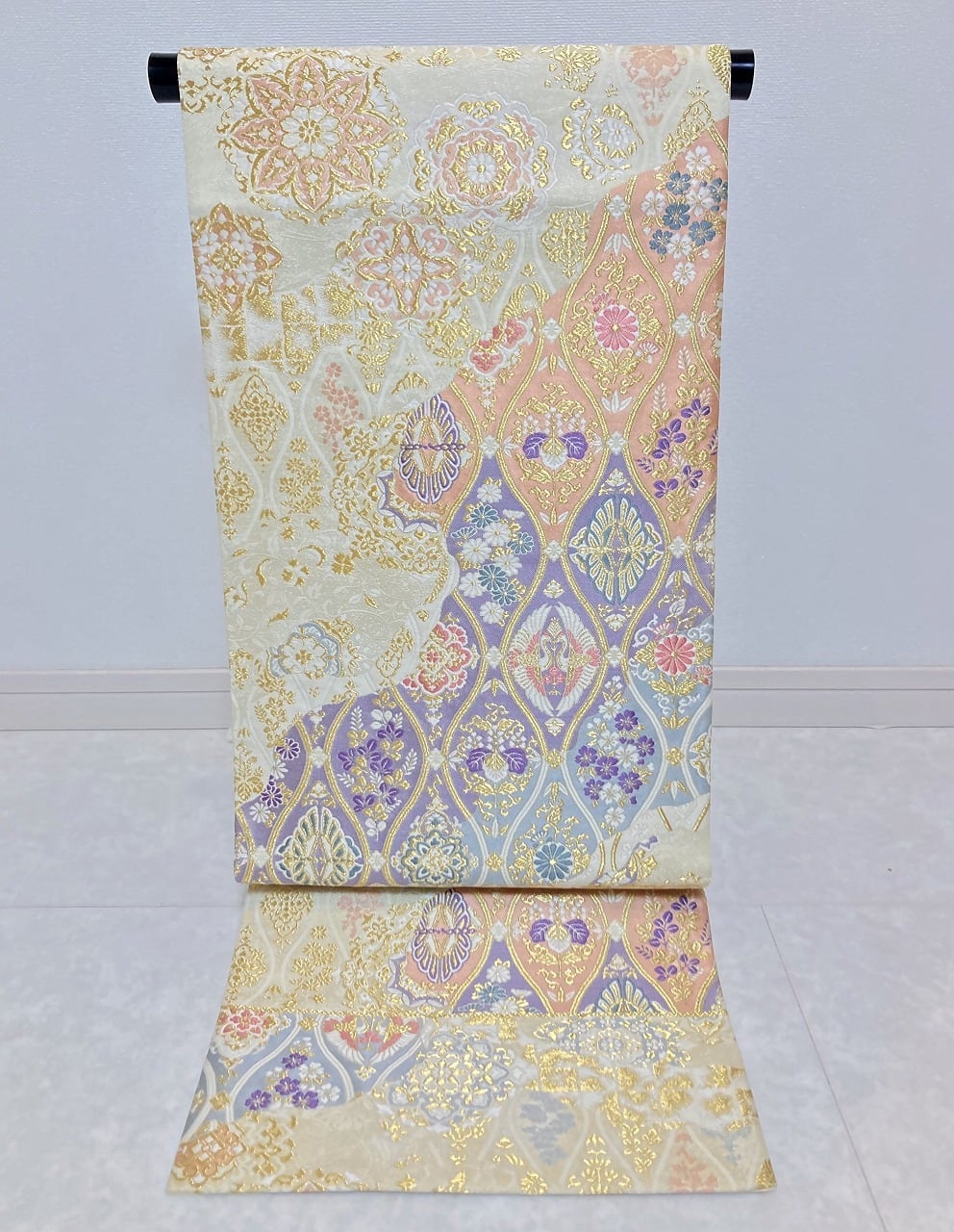 ◇女性らしさを引き立たせる優しいパステルカラーが映える、洗練されたエレガントなデザインの高級袋帯です。