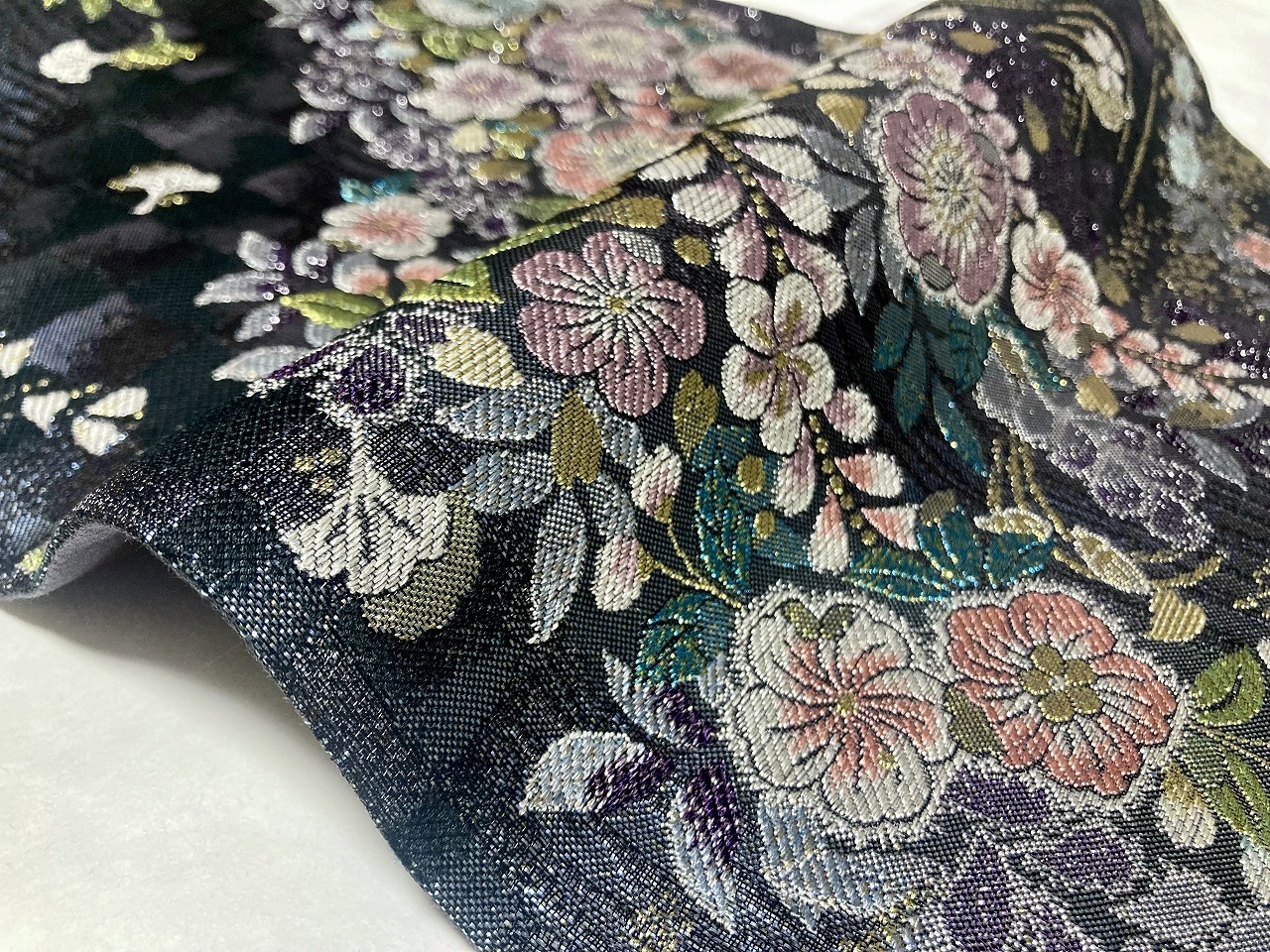 ■上品に煌めく黒に近いブルーから黒へのグラデーション地に「金糸」やティファニーブルーに輝く箔をふんだんに使い、淡く優しいピンクや紫で彩られた[辻ヶ花]が華麗に枝垂れ、かわいい[ミミズク]をさりげなくあしらった粋なデザインです。