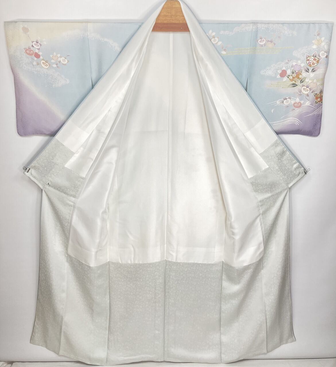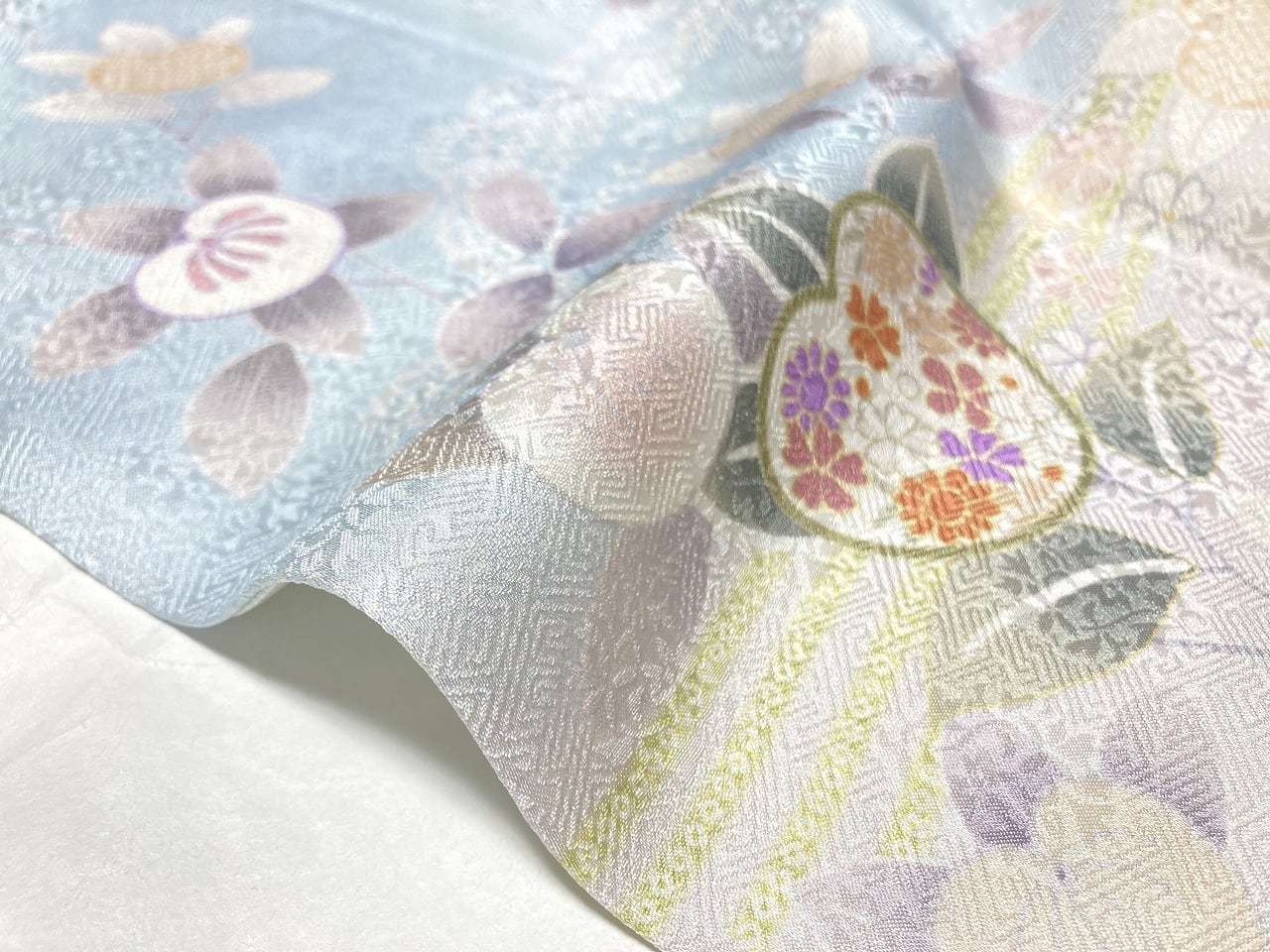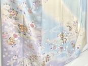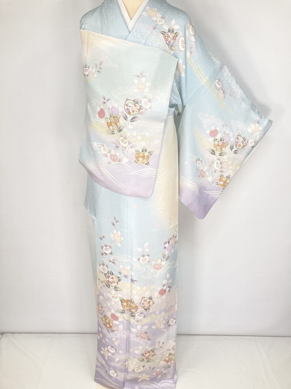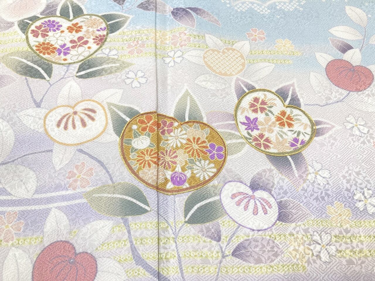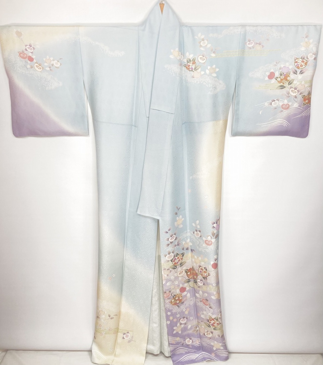 水色・黄緑・黄色・紫などの淡く優しい色合いのグラデーションが美しく、縁起の良い吉祥文の[橘]が優雅に咲き乱れ、気品高くモダンな[雲取り]や[波文]を間隔良く配し、上前の3ヶ所の橘には丹念な手仕事による「金駒刺繍」をあしらった豪華な仕上げになっております。