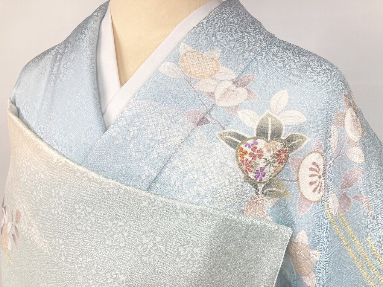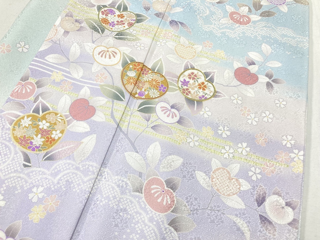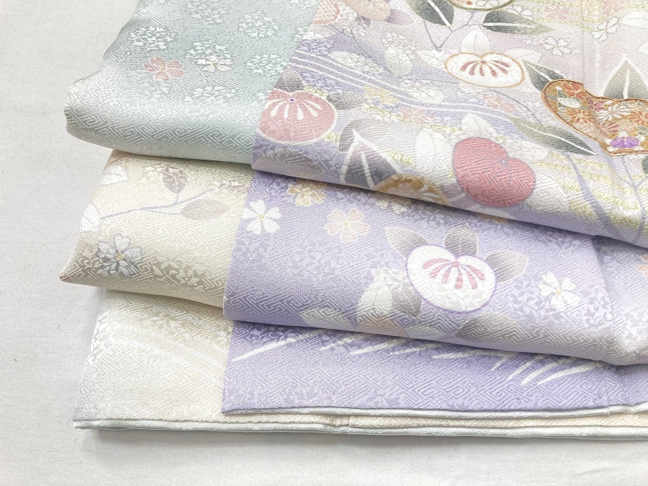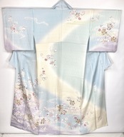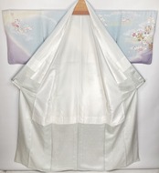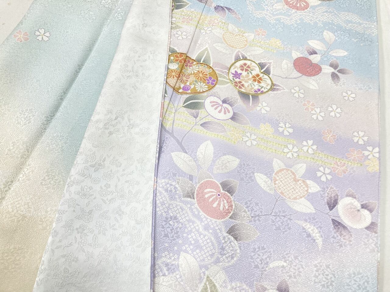 水色・黄緑・黄色・紫などの淡く優しい色合いのグラデーションが美しく、縁起の良い吉祥文の[橘]が優雅に咲き乱れ、気品高くモダンな[雲取り]や[波文]を間隔良く配し、上前の3ヶ所の橘には丹念な手仕事による「金駒刺繍」をあしらった豪華な仕上げになっております。