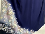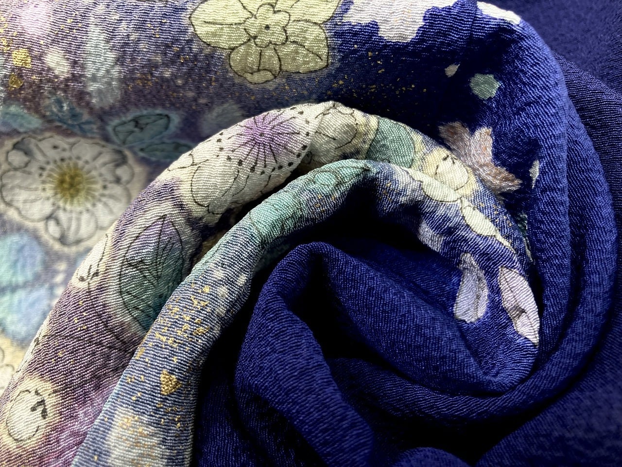 やわらかな「ぼかし染め」で黒に近い深い紺色への美しいグラデーションによりメリハリが生まれ、多彩な「友禅」「ぼかし染め」「墨絵書き」「手絞り」を駆使し、ティファニーブルーや紫などの優しい色合いで彩られた[辻ヶ花]が優雅に散りばめられ、気品高く輝く「本金箔」を散りばめ華やぎを添えた、うっとりするほど美しい作品です。