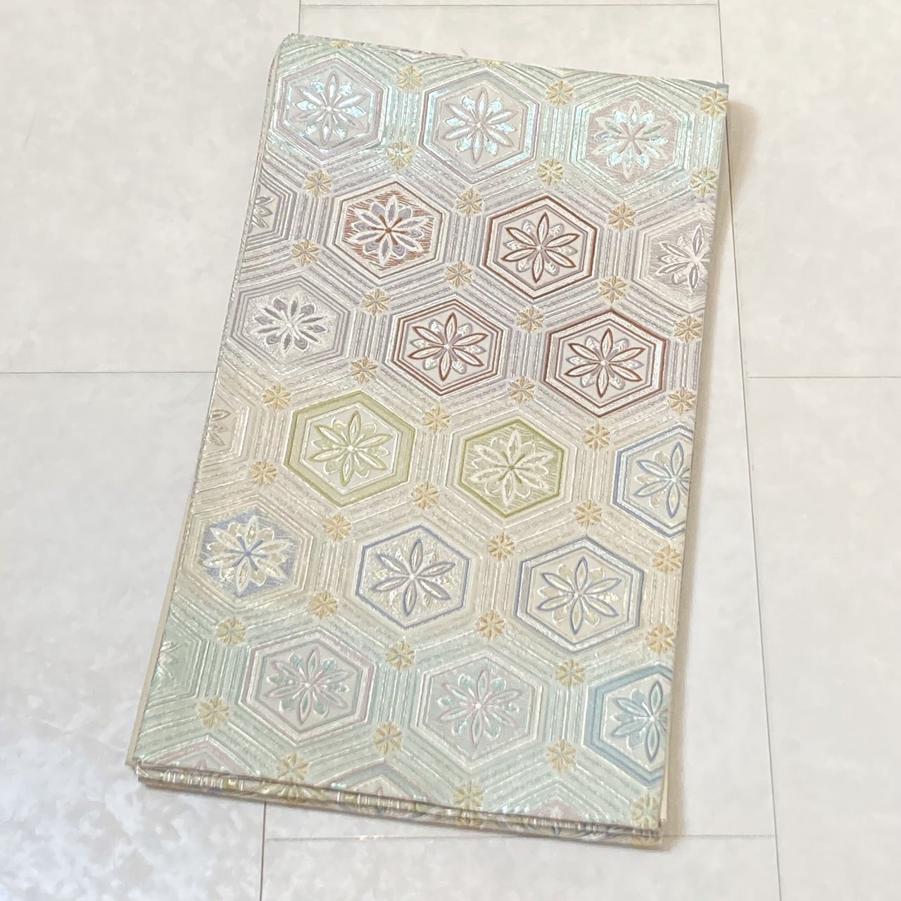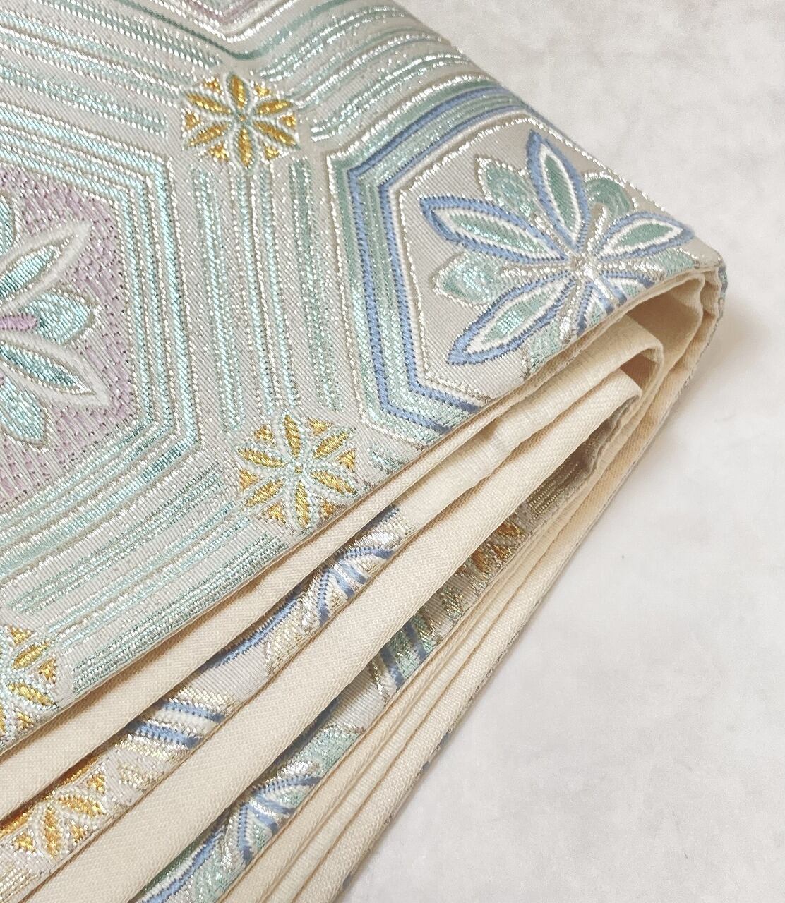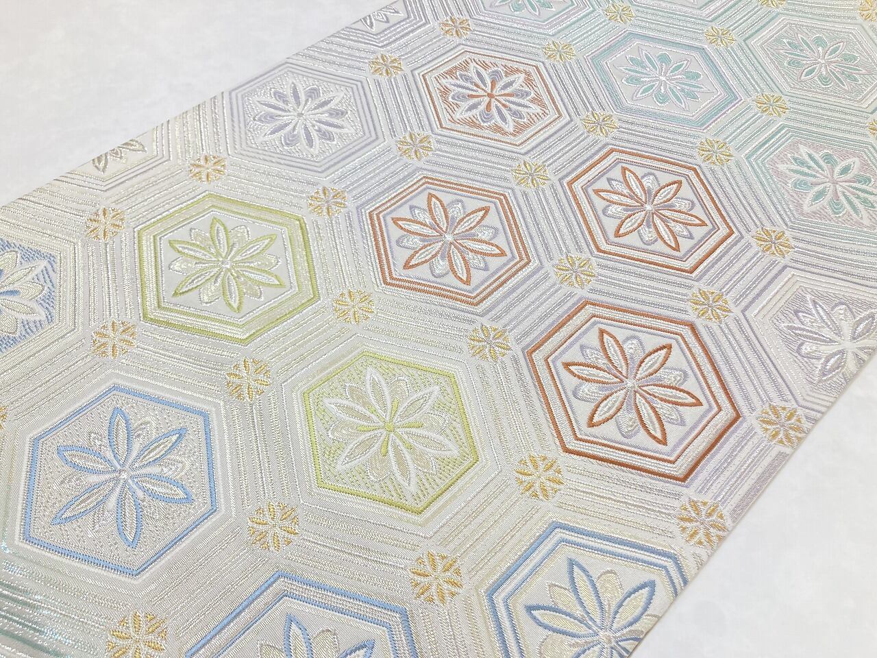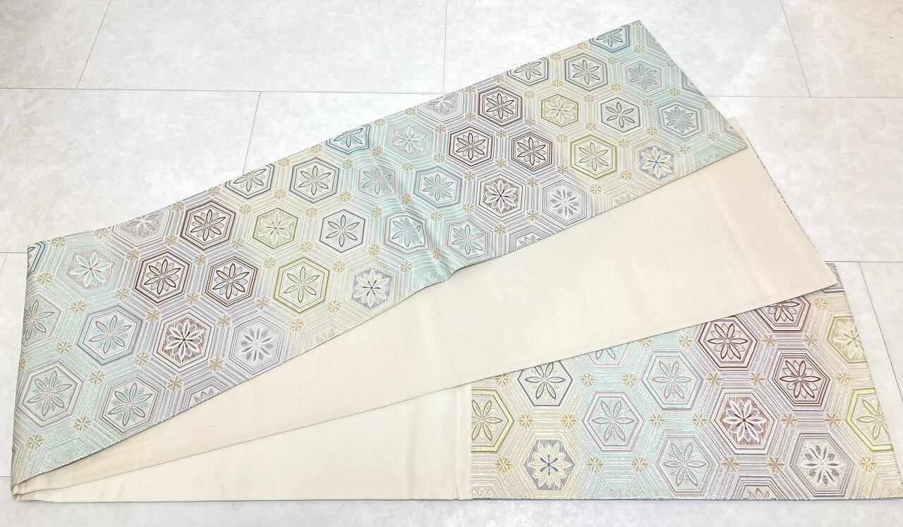 ■優格調高い[亀甲]に華紋を『雪の結晶』のようにあしらい、気品高く輝く「金糸」「銀糸」「色箔」を駆使し、淡い水色から黄色、紫へのやわらかなグラデーションを配し、緻密な「九百錦」で精巧に織り上げたうっとりするほど美しい作品です。