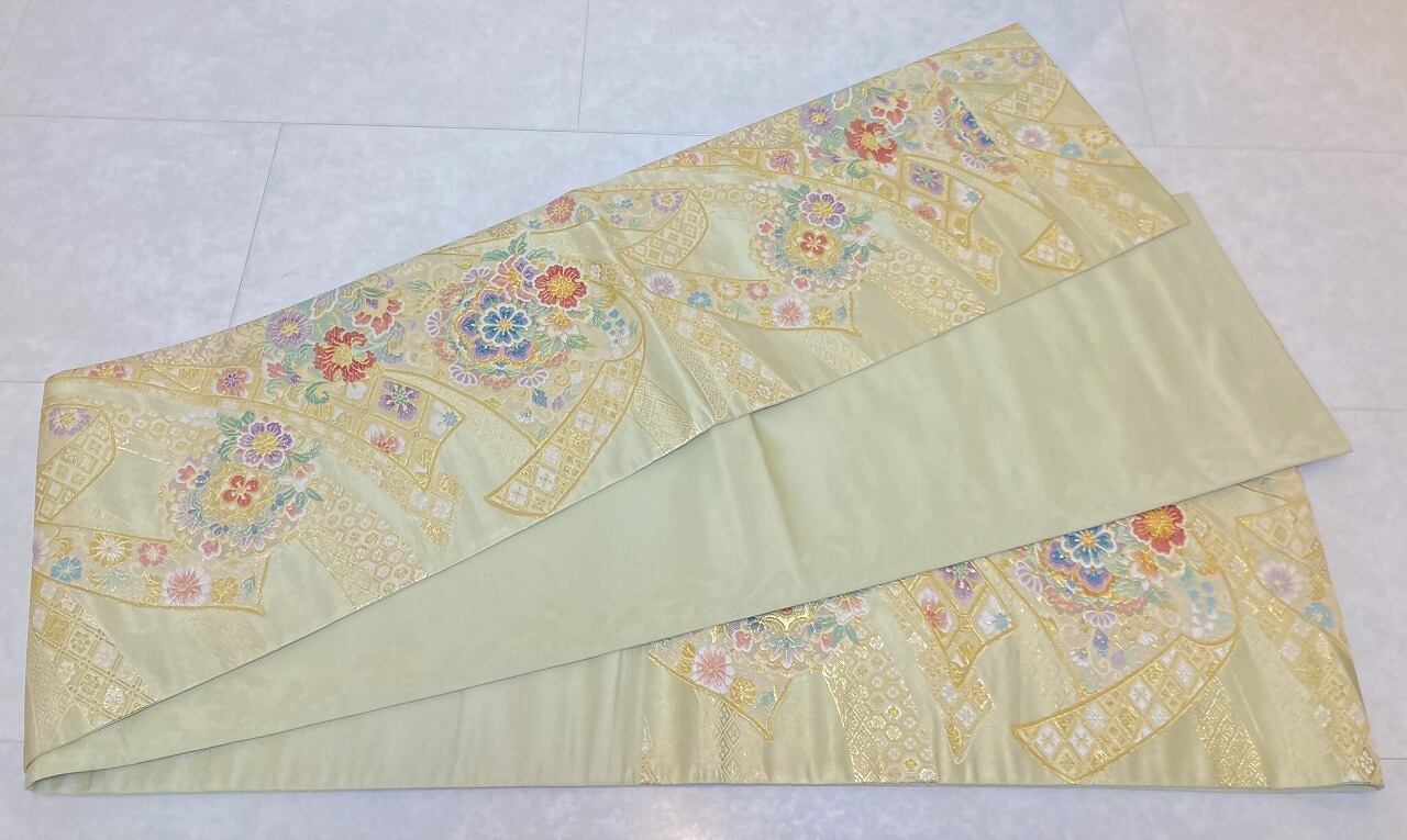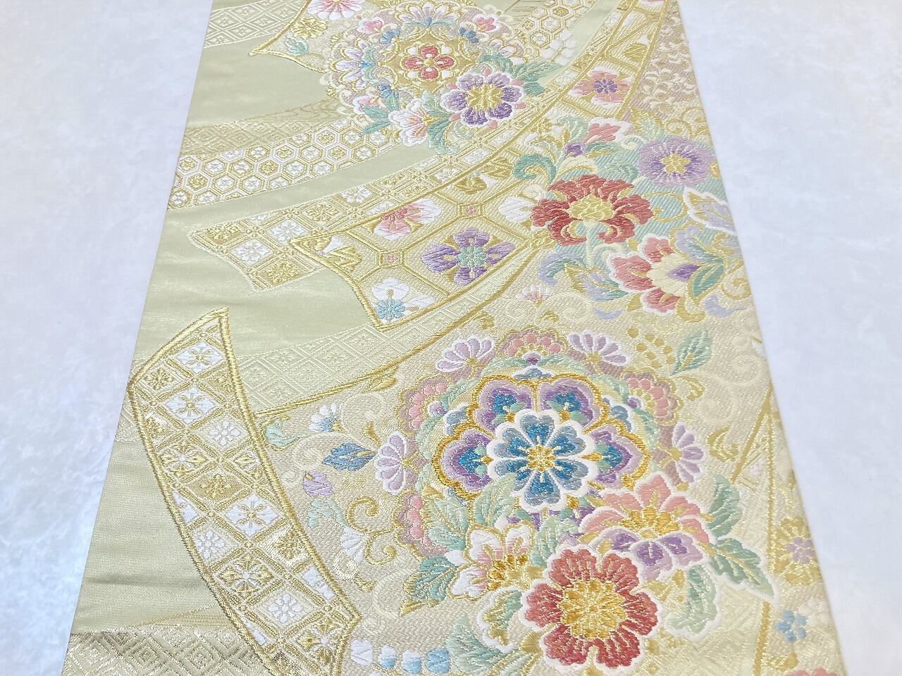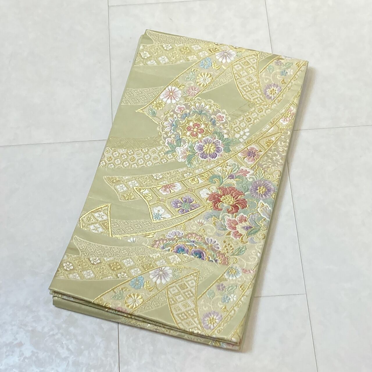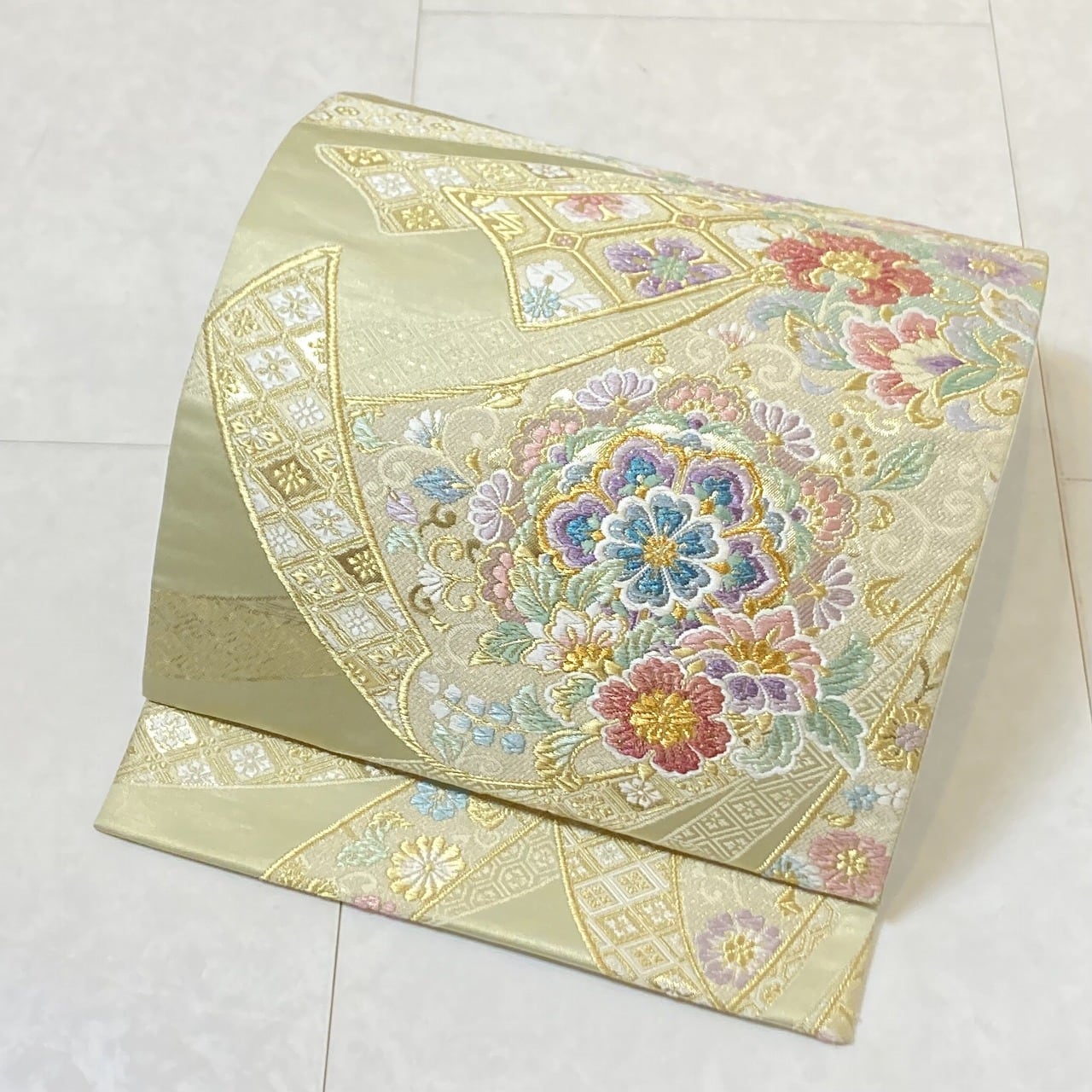 ◇やわらかな黄緑色地に、色とりどりの優しい色合いにゴールドが映える、とても麗しい高級袋帯です。