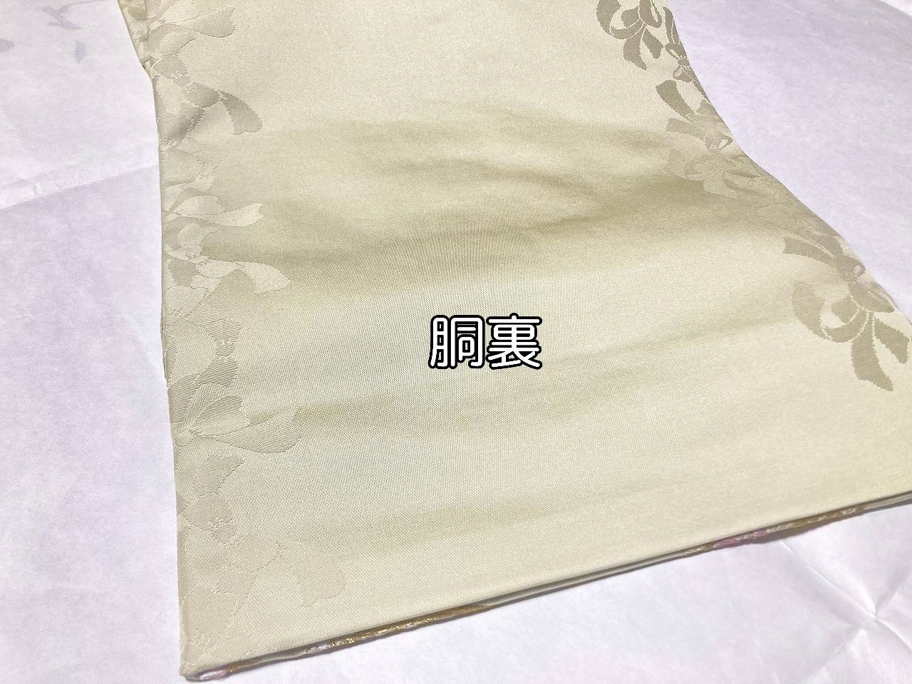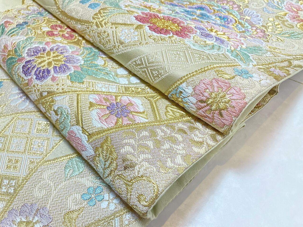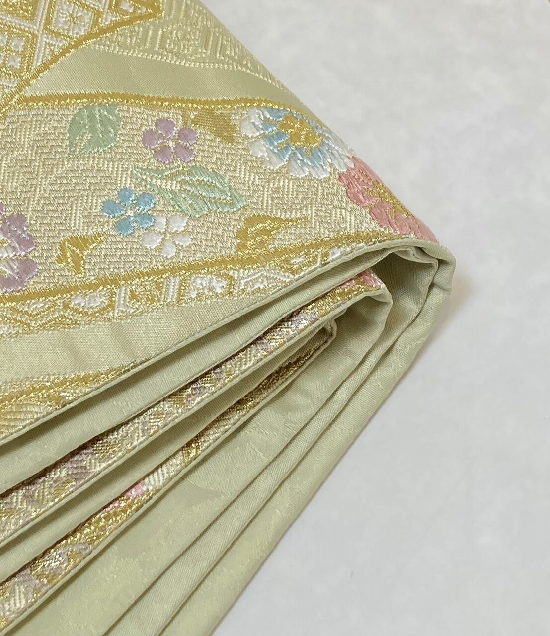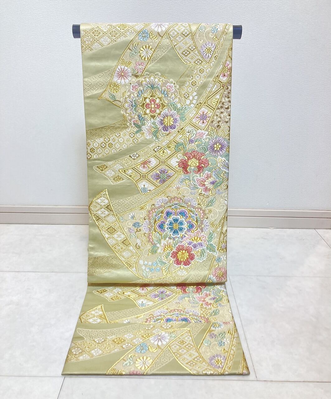 ◇やわらかな黄緑色地に、色とりどりの優しい色合いにゴールドが映える、とても麗しい高級袋帯です。