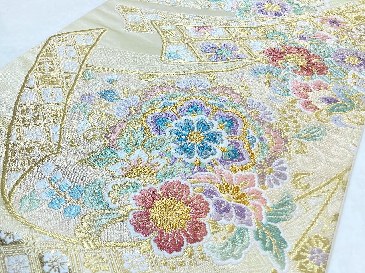 ■美しく輝く「金糸」を使い鮮やかな[華紋]に気品高い[唐花]を散りばめ、雅やかな[熨斗]を流れるように優雅に配し、刺繍のようにふっくらとした格調高い「唐織り」できめ細かく細密に織り上げた、大変加工の良いお品です。