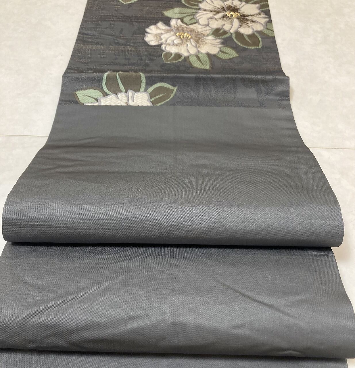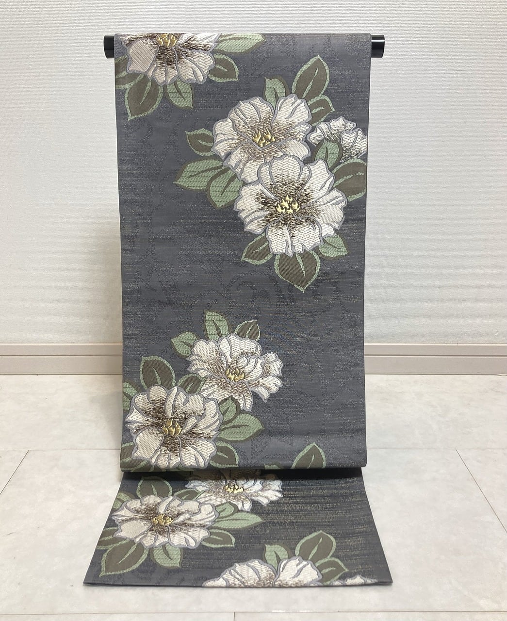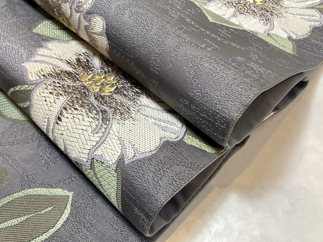 ■青みがかった暗いグレー地に、金糸をきめ細かく織り込んだ「金通し」が角度によりさりげなく煌めき、オリエンタルな[唐花]の地紋をスタイリッシュにあしらい、大柄の[椿]を間隔よく配し、気品高く輝く「金糸」が華やぎを添えた、ふっくらとした刺繍の様な「唐織り」で緻密に織り上げた、と大変加工の良いお品です。
