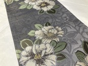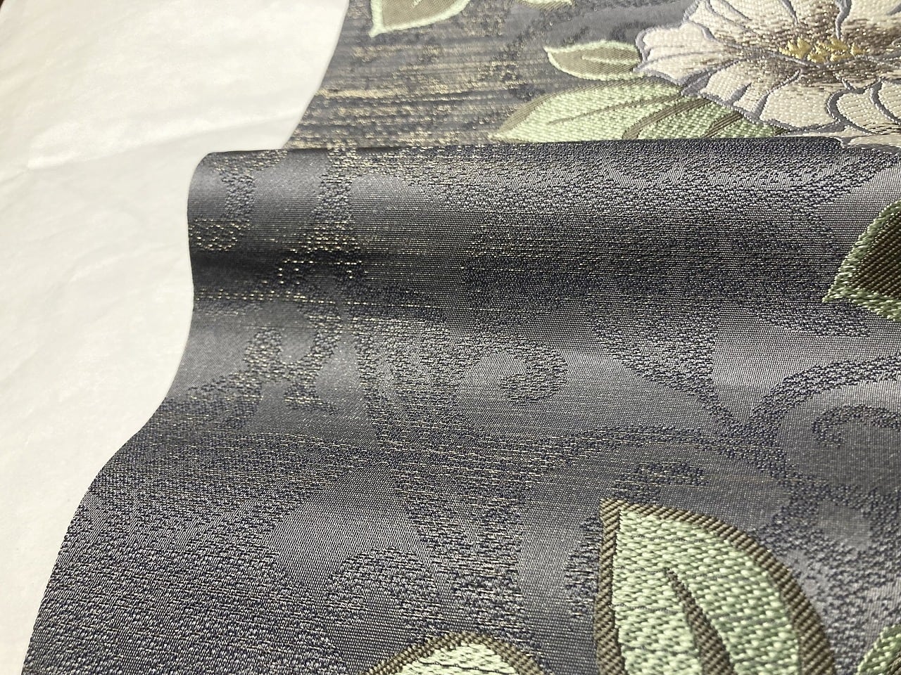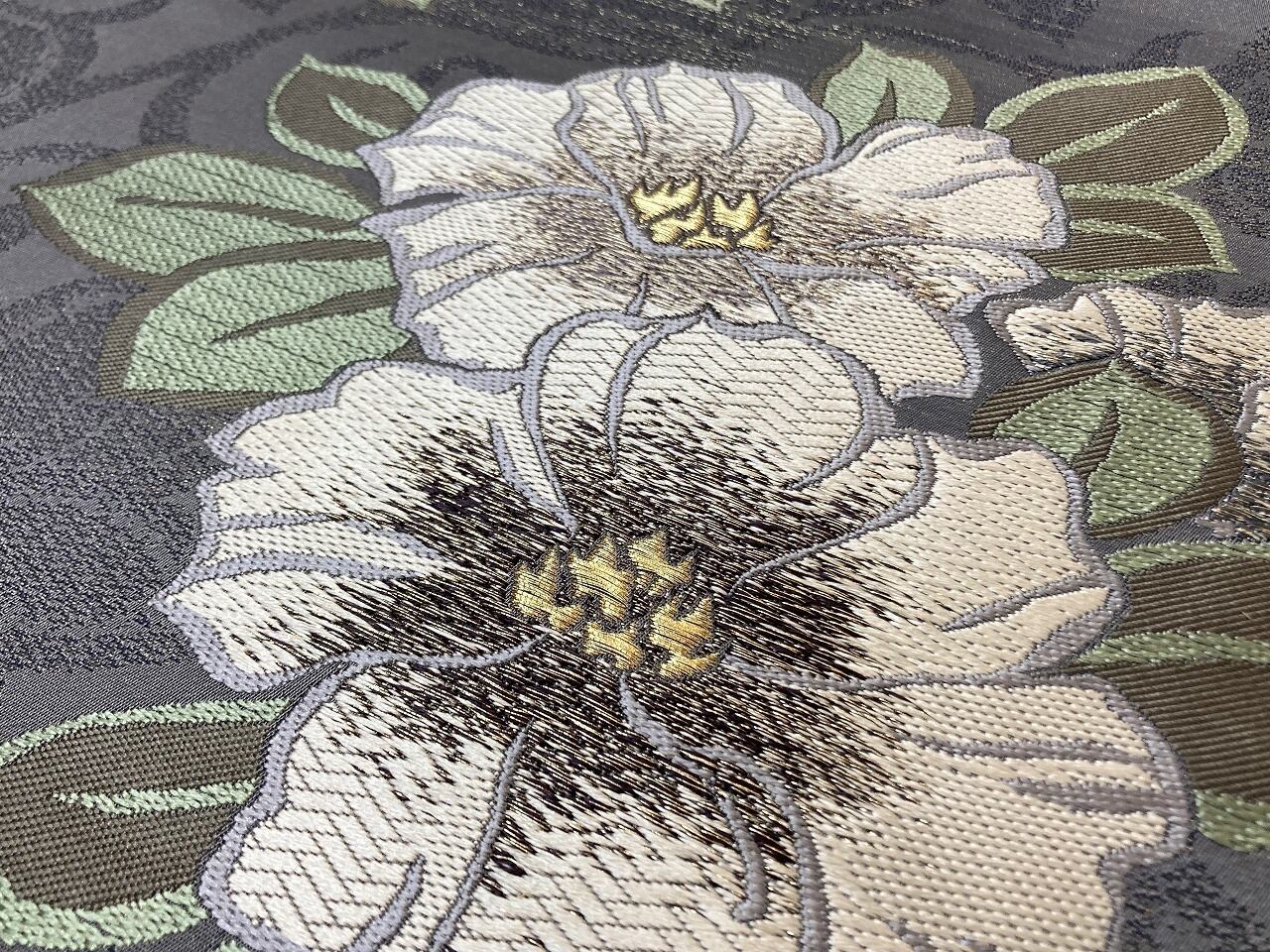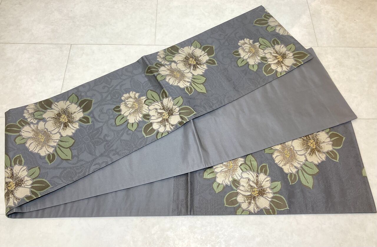 ■青みがかった暗いグレー地に、金糸をきめ細かく織り込んだ「金通し」が角度によりさりげなく煌めき、オリエンタルな[唐花]の地紋をスタイリッシュにあしらい、大柄の[椿]を間隔よく配し、気品高く輝く「金糸」が華やぎを添えた、ふっくらとした刺繍の様な「唐織り」で緻密に織り上げた、と大変加工の良いお品です。